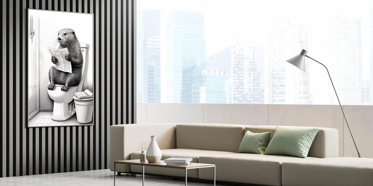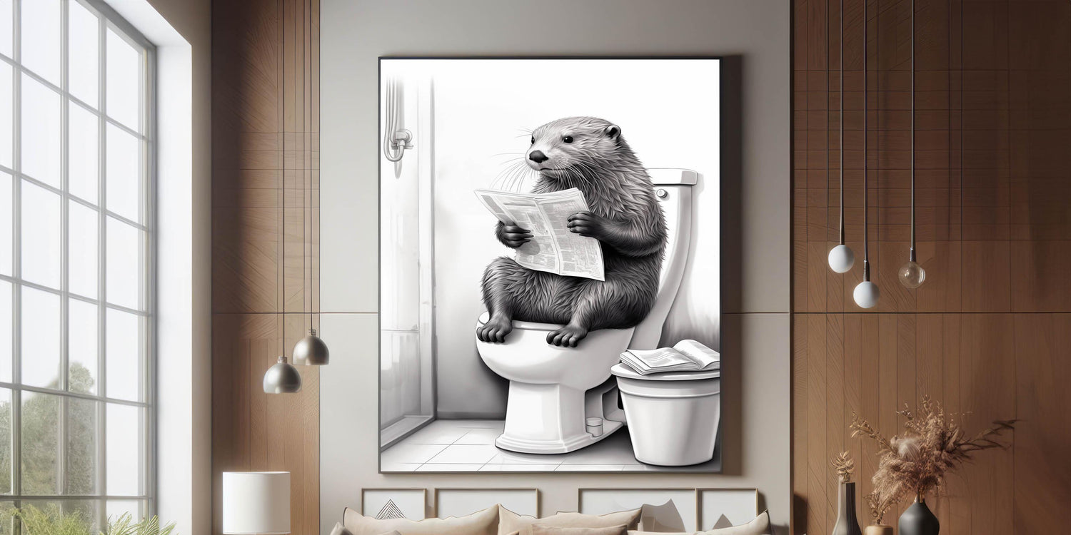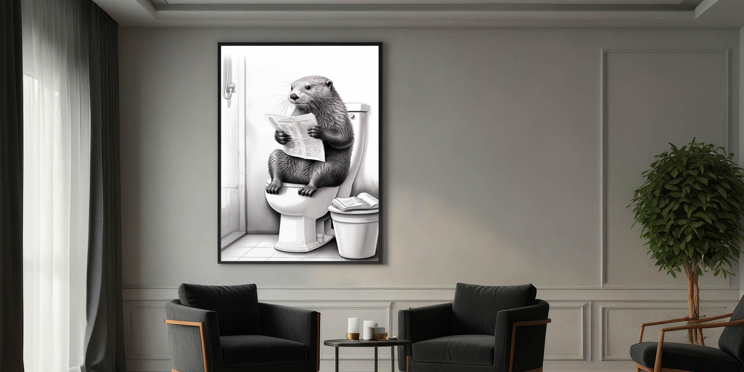 Bring a whimsical and modern touch to your bathroom with this humorous wall art featuring an otter reading a newspaper on the toilet. This clever design combines minimalist aesthetics with a lighthearted subject, making it a perfect addition to both contemporary and eclectic bathroom decor. Its black-and-white palette adds a clean and sophisticated look to your space.