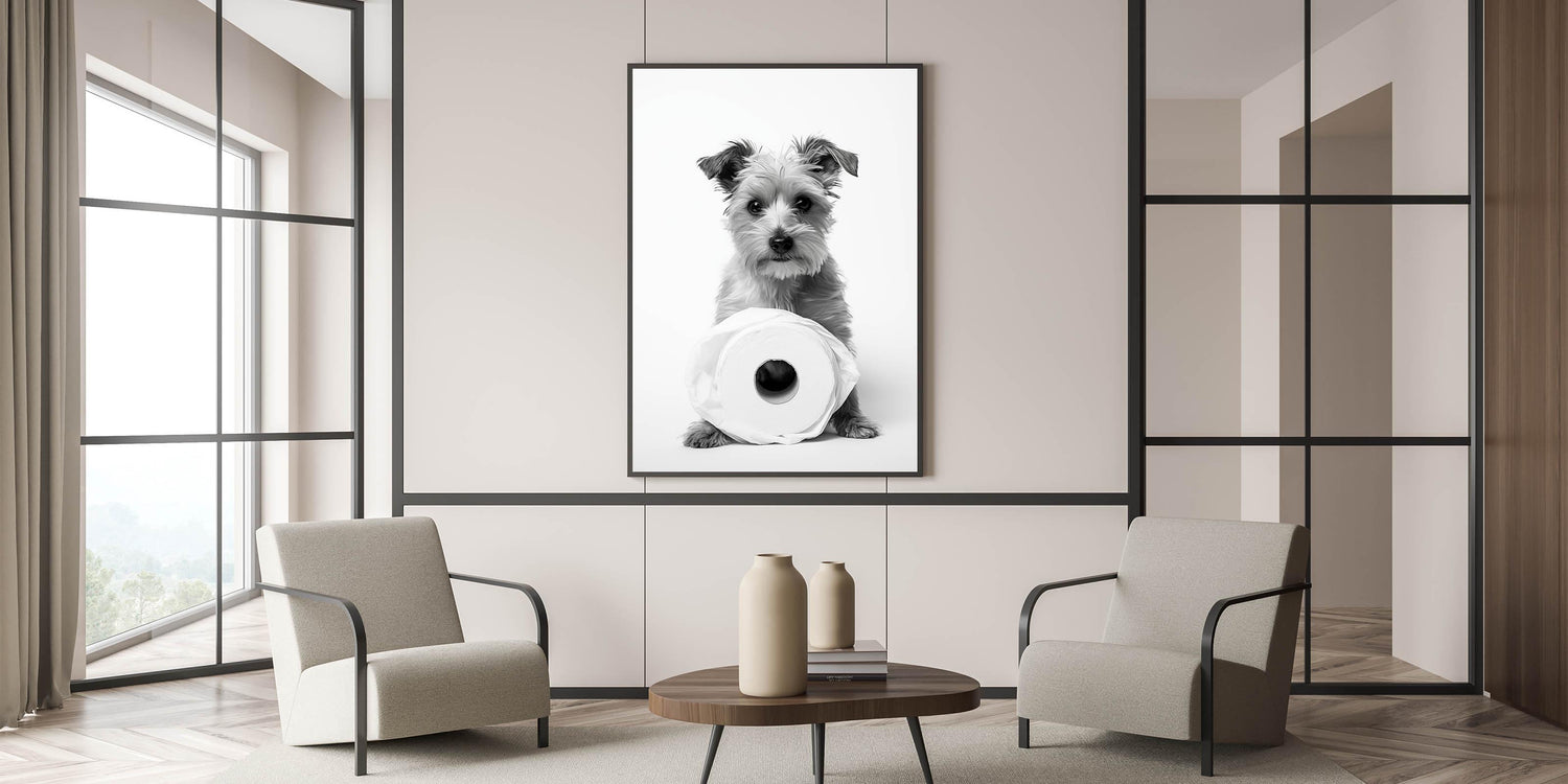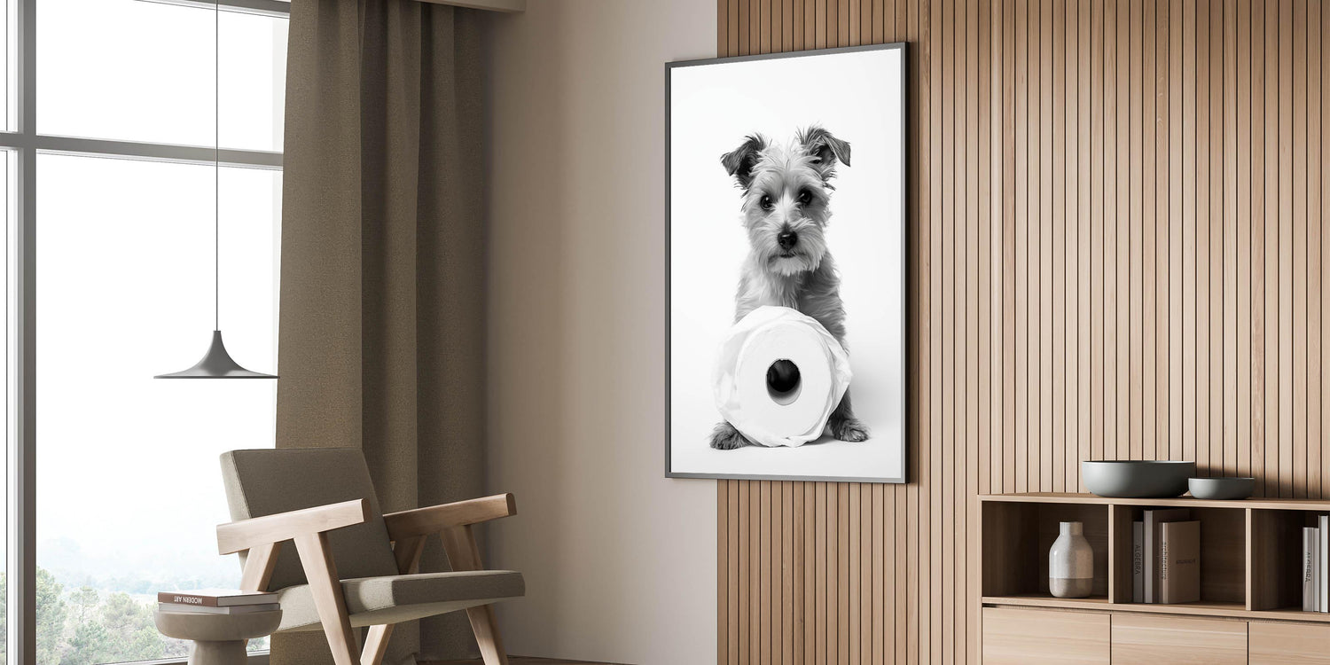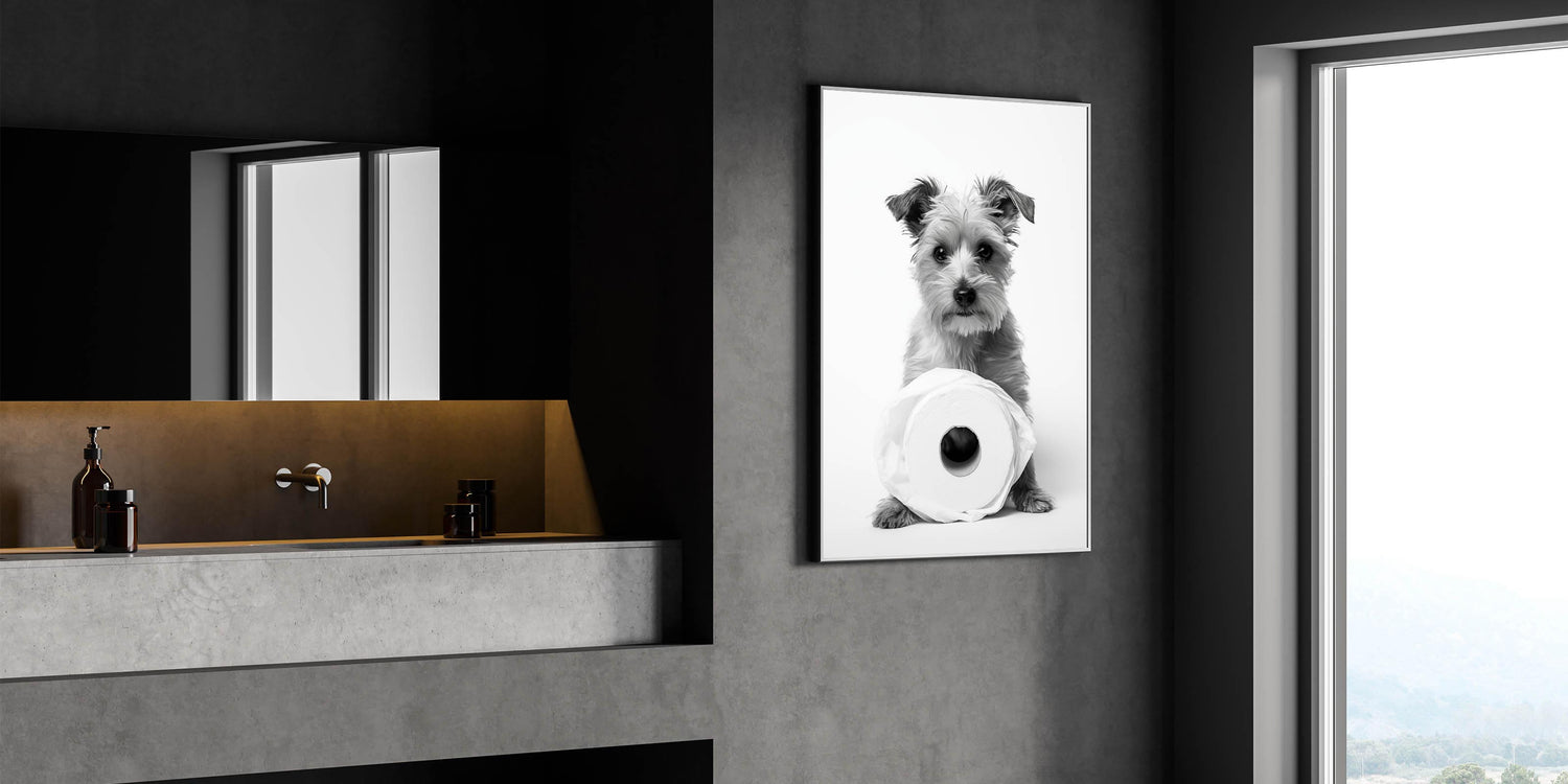 Add a playful yet elegant touch to your bathroom with this charming wall art featuring an adorable dog holding a toilet paper roll. This modern bathroom decor combines humor and style, making it a delightful addition to any space.