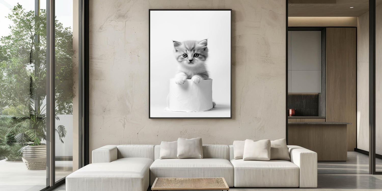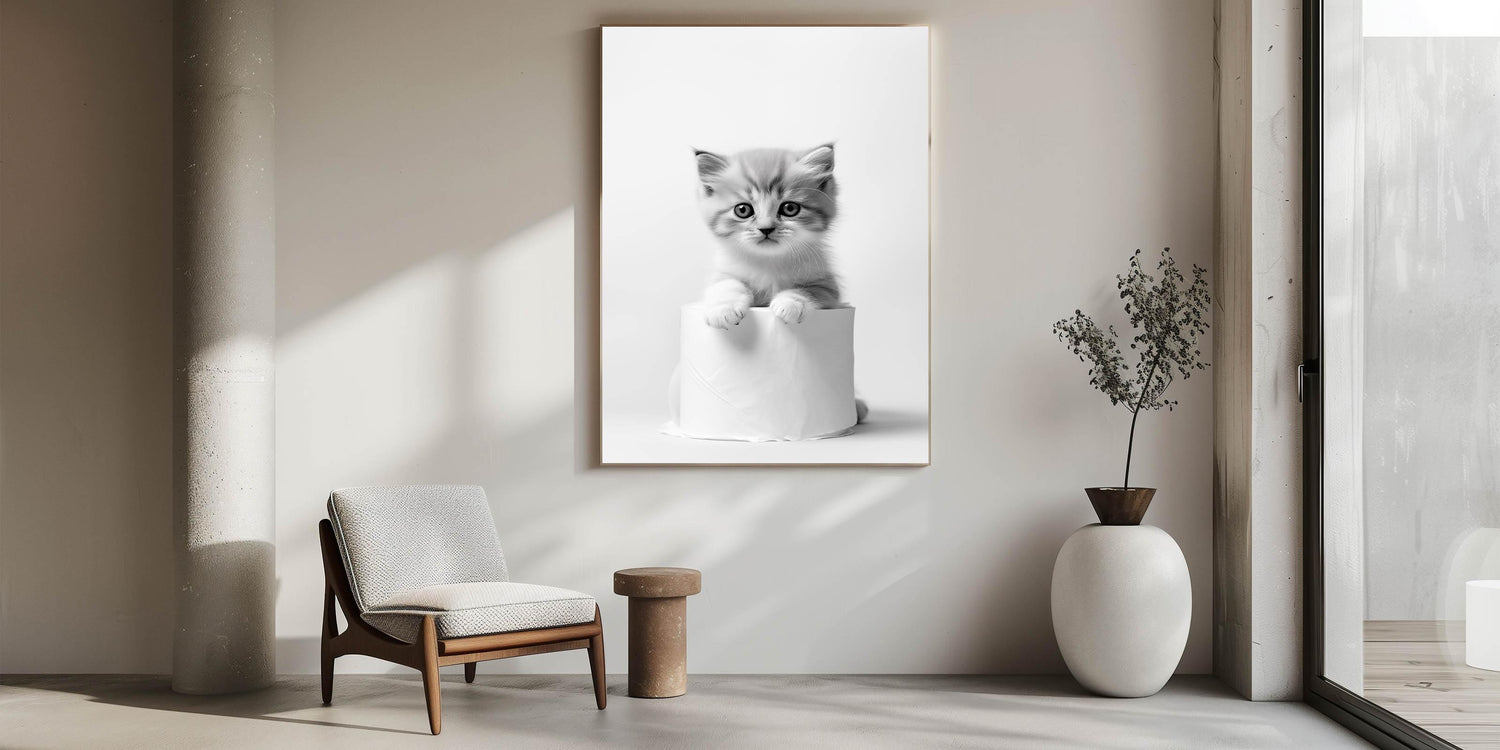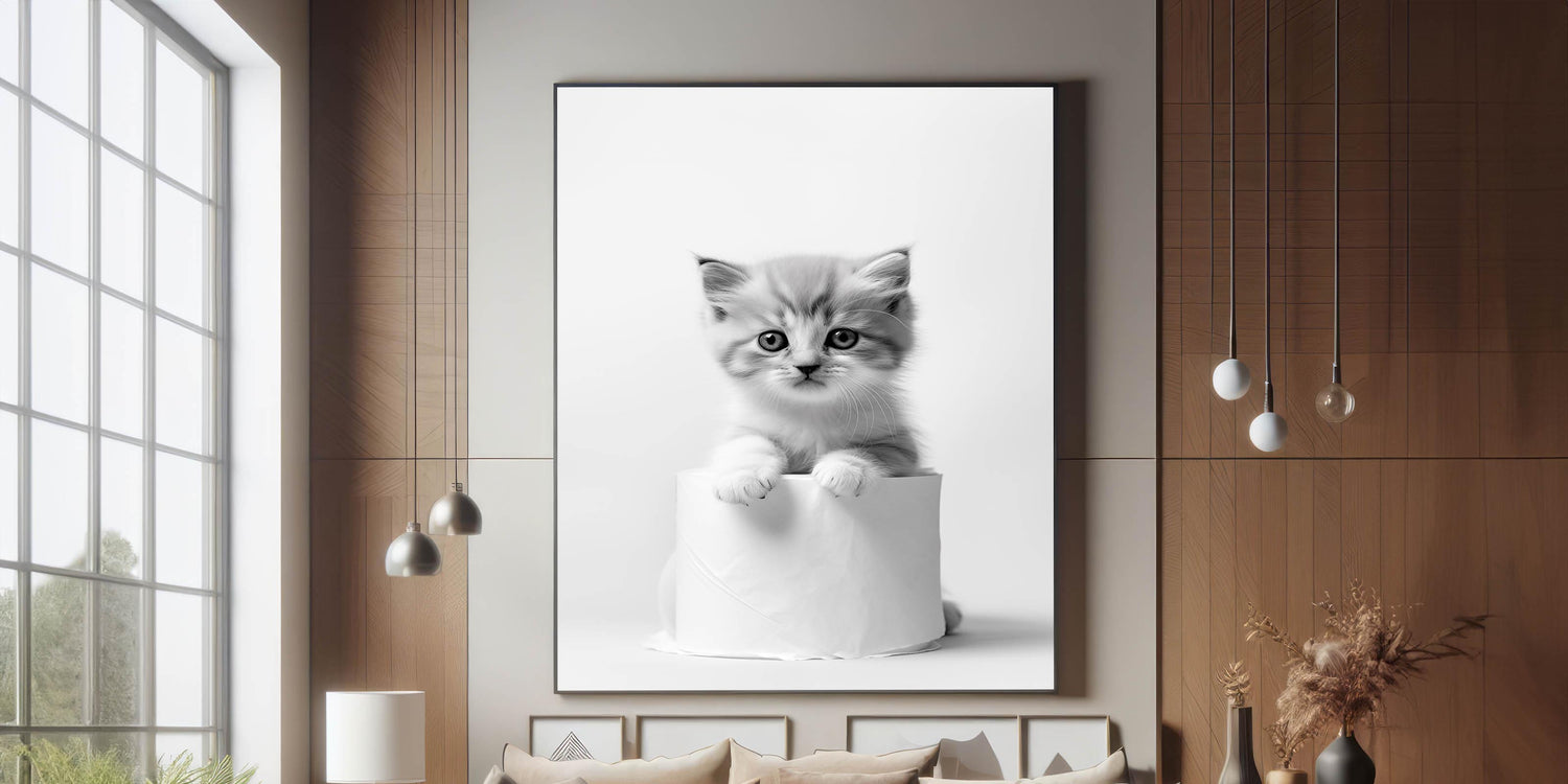 Add a touch of whimsy and charm to your bathroom with this delightful piece of wall art featuring an adorable kitten perched on a toilet roll. This captivating black-and-white artwork is perfect for creating a cozy, welcoming atmosphere in your bathroom. Whether you're looking for modern bathroom wall art or a playful touch to enhance your decor, this piece will surely make a statement.