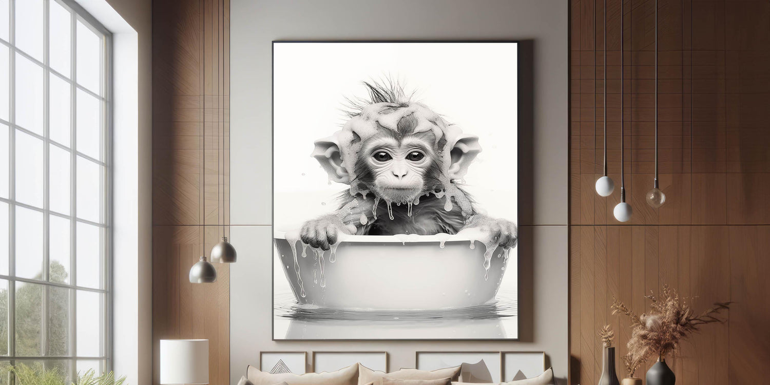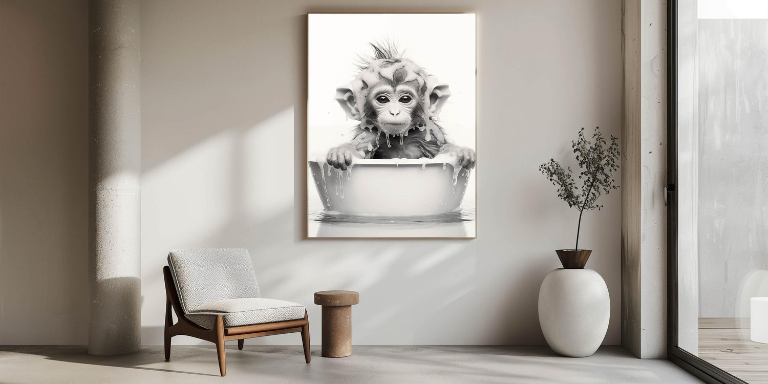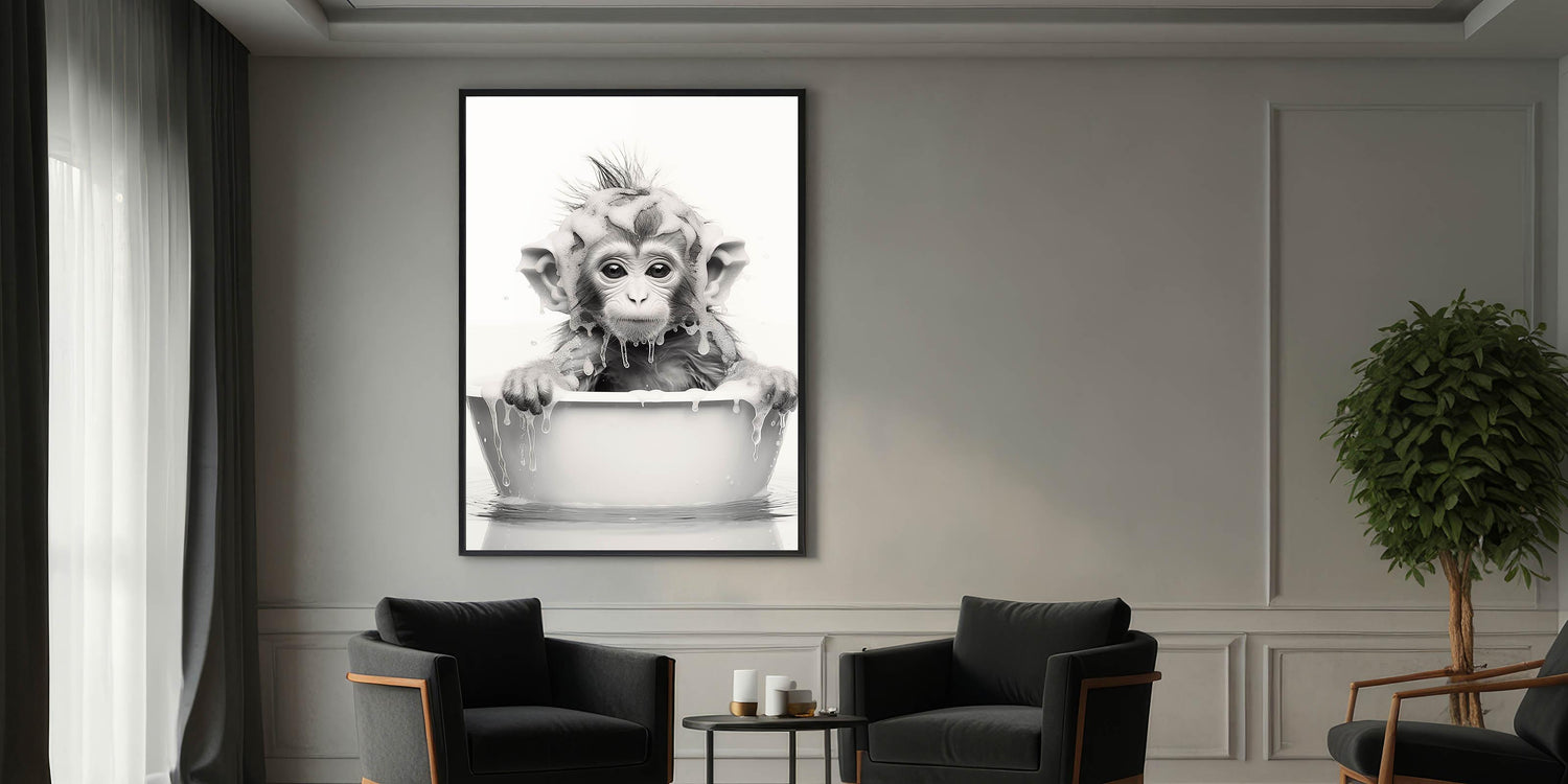 Add a splash of charm to your bathroom with this delightful wall art featuring a baby monkey enjoying a bubbly bath. This playful black-and-white design is both whimsical and sophisticated, making it the perfect addition to modern or minimalist bathroom decor. The intricate detailing and lighthearted subject matter create a unique focal point that radiates personality and fun.