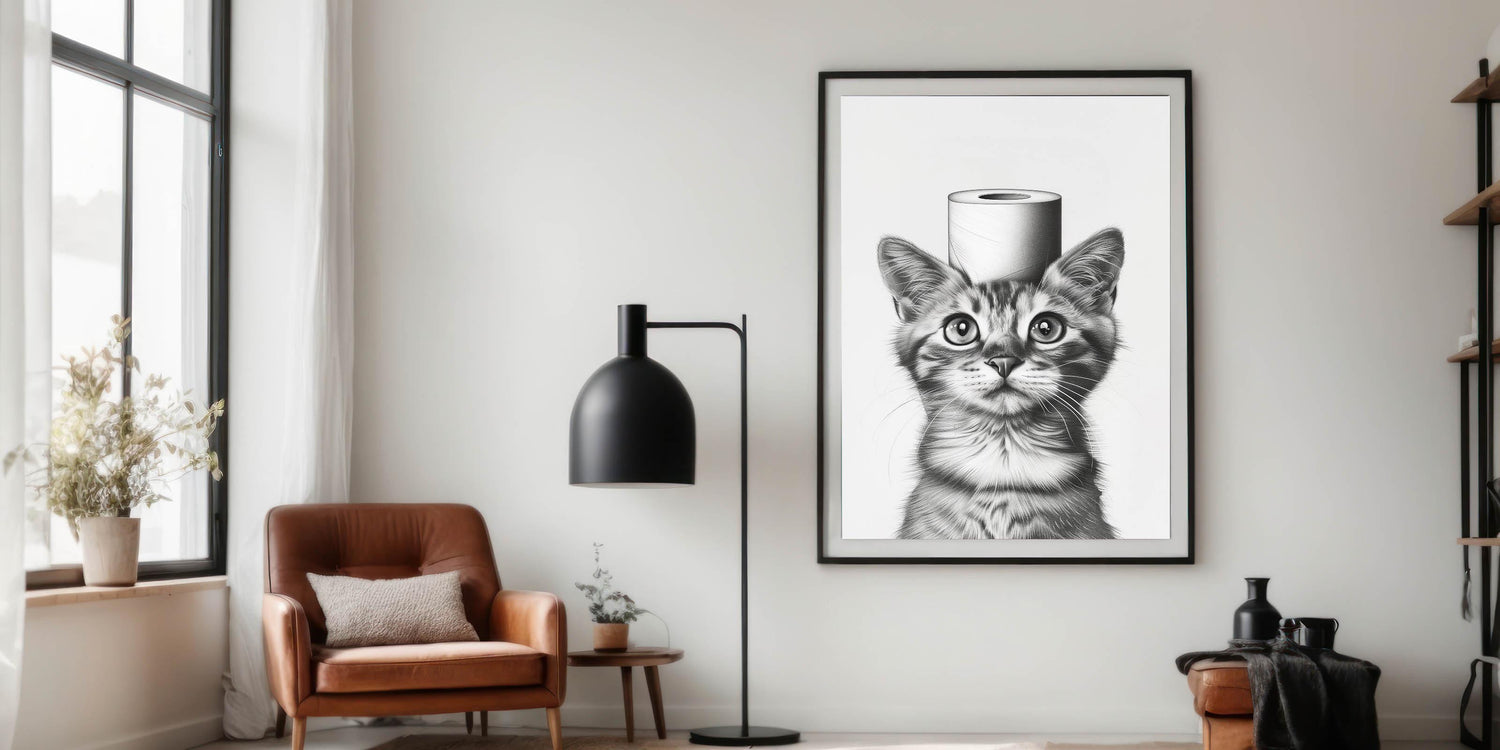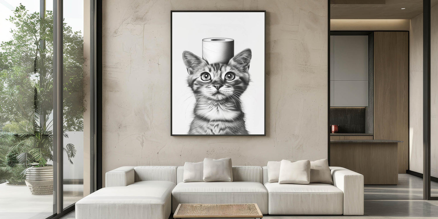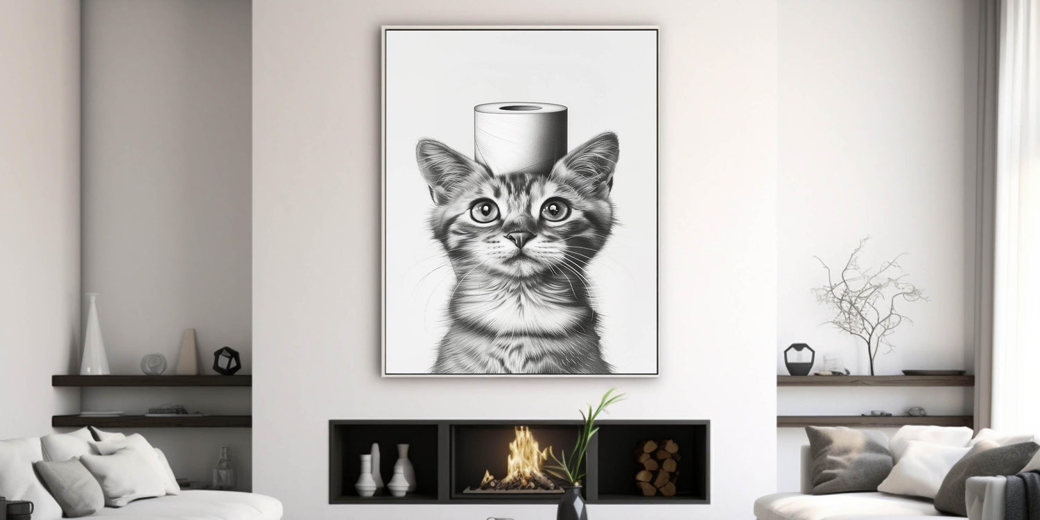 Bring humor and elegance to your bathroom with this charming wall art featuring a curious cat wearing a roll of toilet paper as a playful hat. The monochrome style enhances the intricate details, making this piece a striking addition to minimalist or modern bathroom decor.