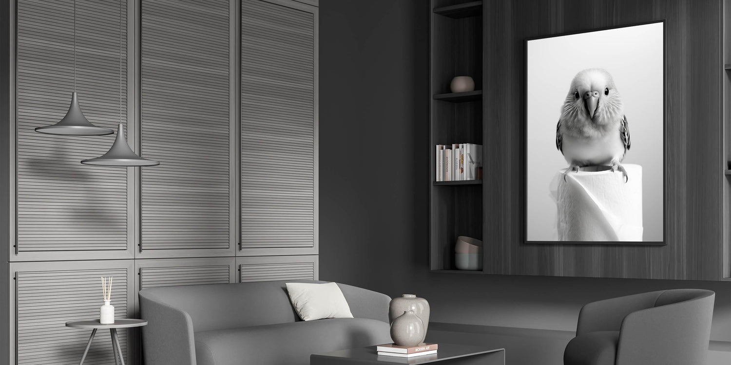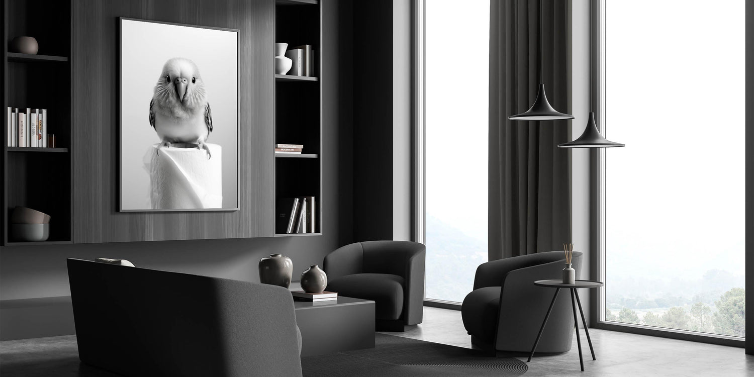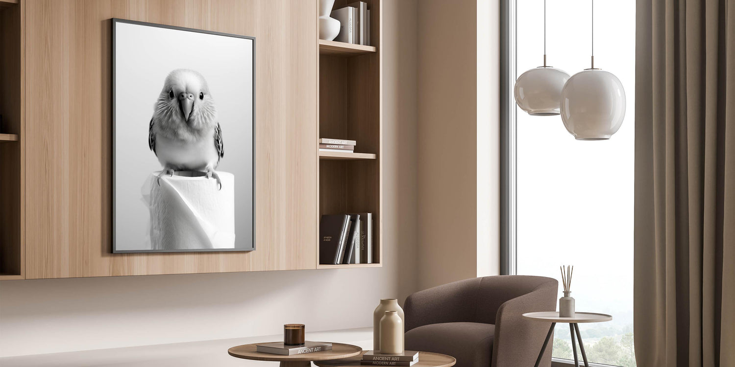 Add a touch of elegance and playfulness to your bathroom decor with this stunning wall art featuring a charming bird perched on a roll of toilet paper. The minimalistic black-and-white design ensures it complements any modern or minimalist bathroom interior, making it a timeless and versatile piece.