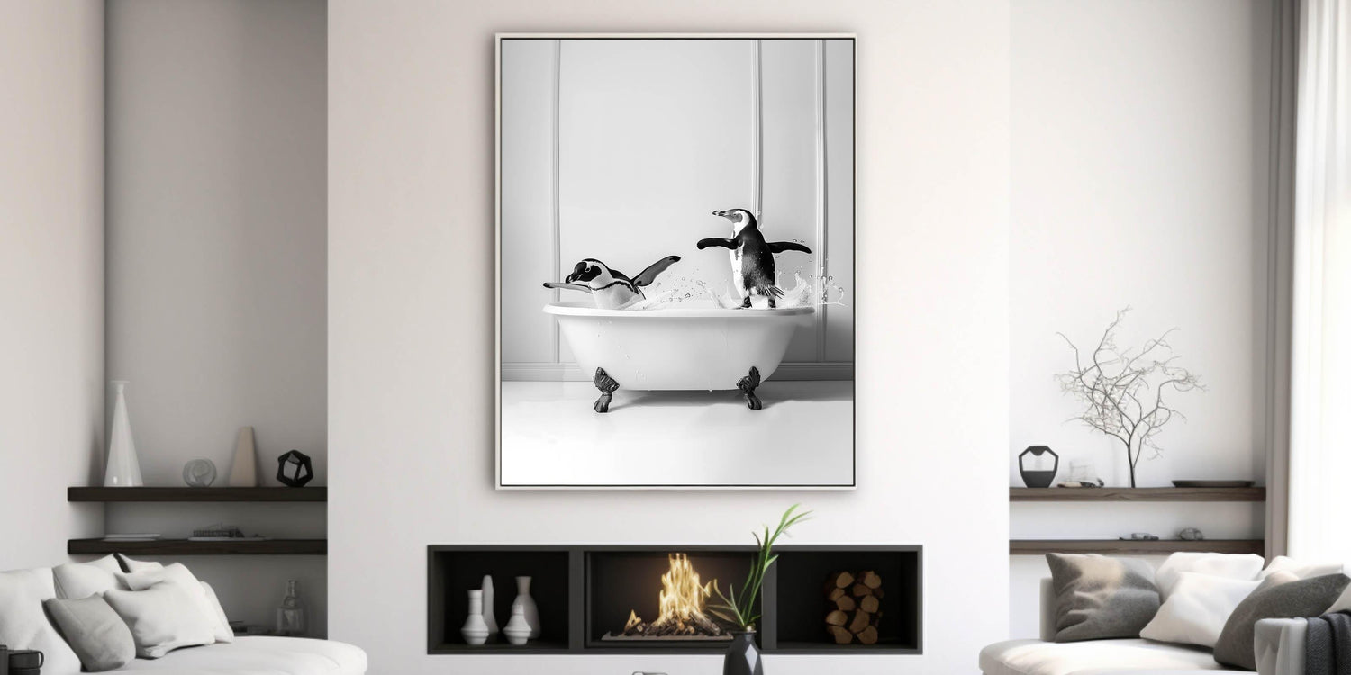 Bring a splash of fun and whimsy to your bathroom with this delightful wall art featuring two playful penguins enjoying a soak in a vintage bathtub. Perfect for adding charm and humor, this design is an excellent choice for modern, coastal, or family-friendly bathroom spaces.