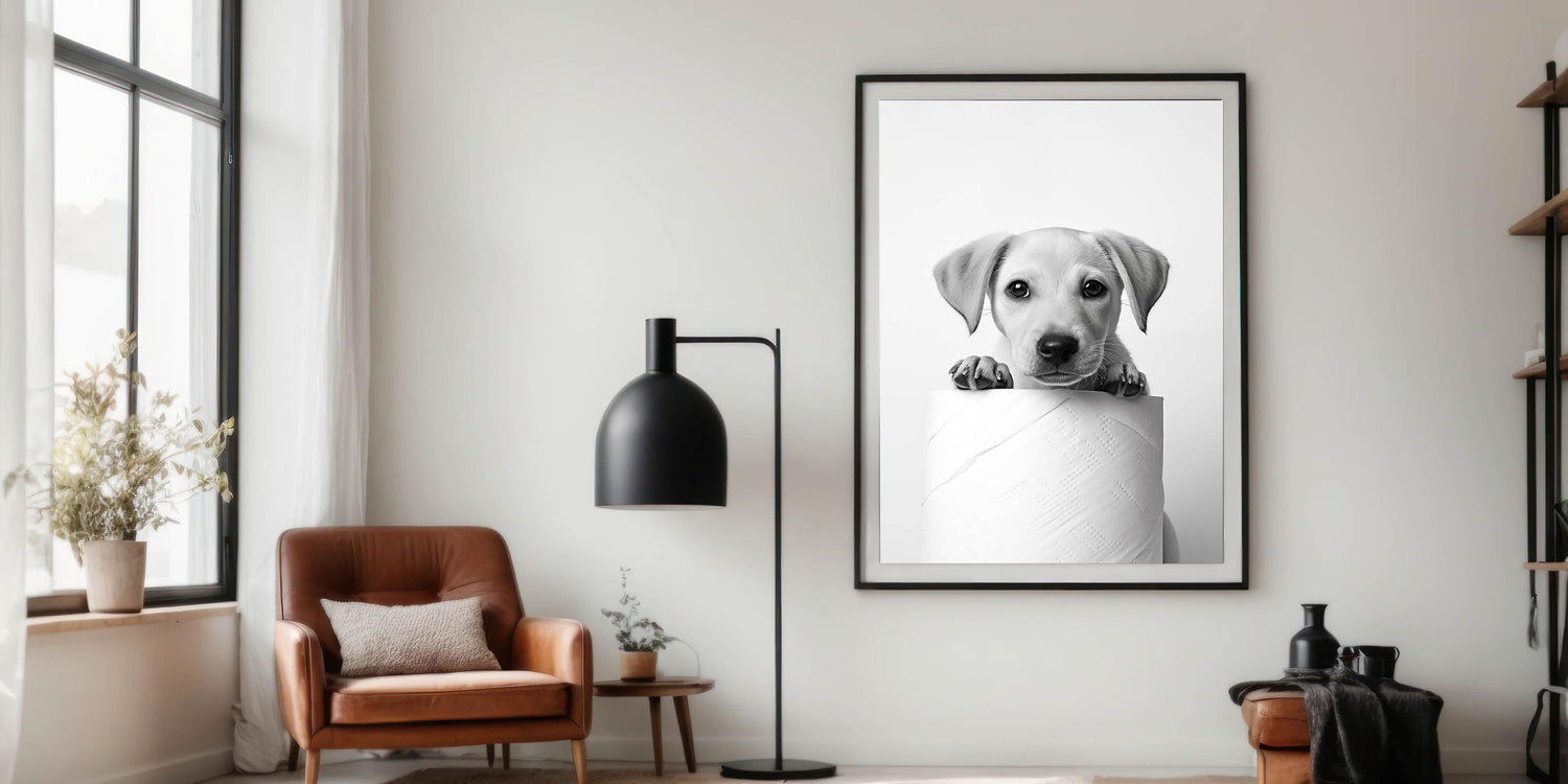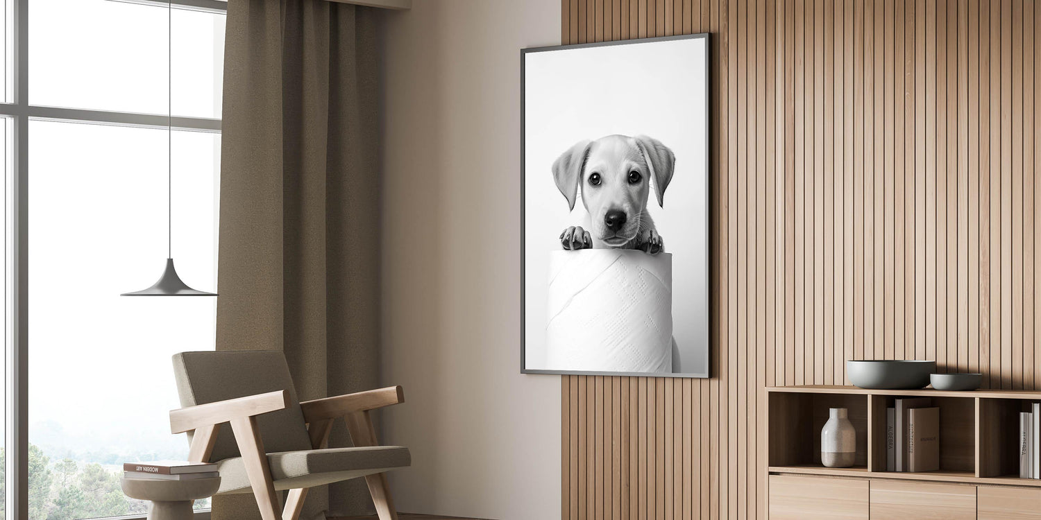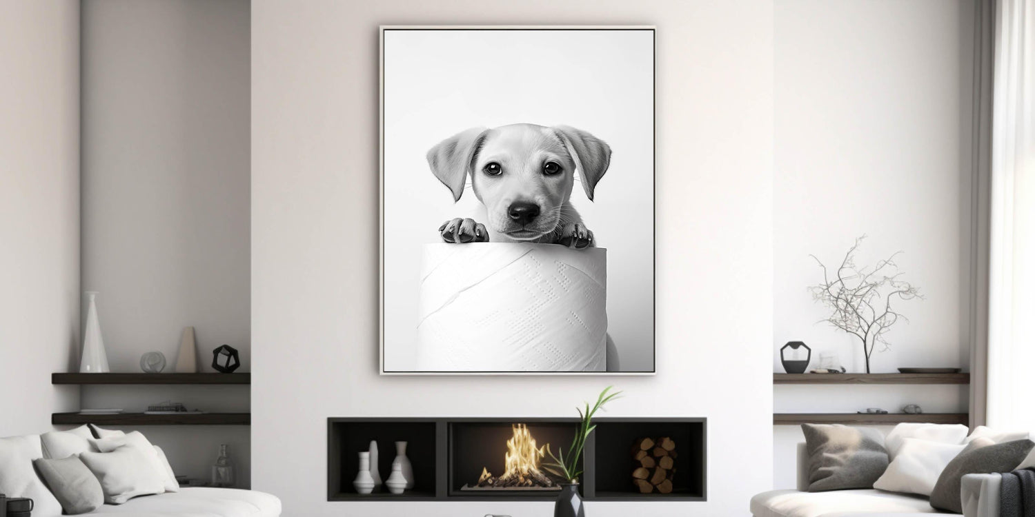 Bathroom Wall Art - Playful Puppy on Toilet Roll Modern Decor