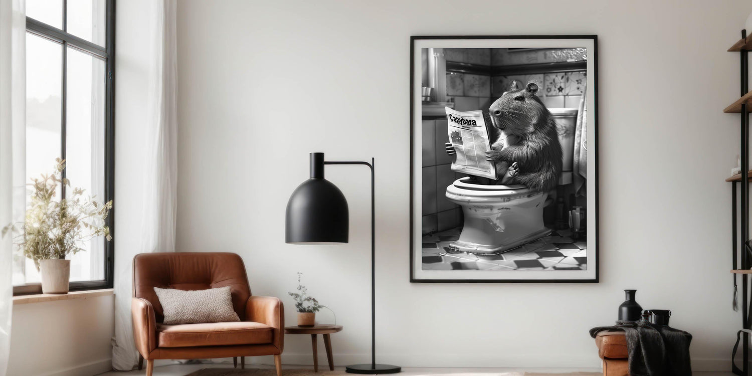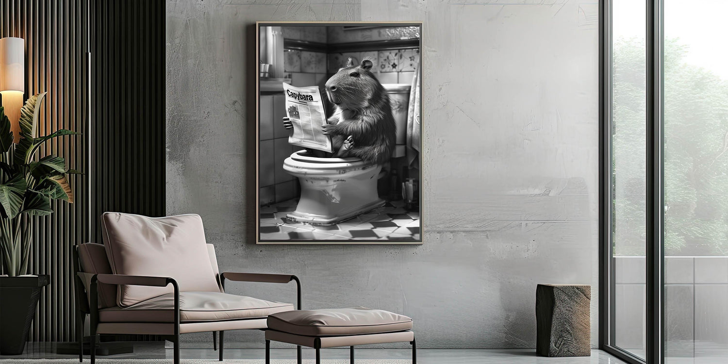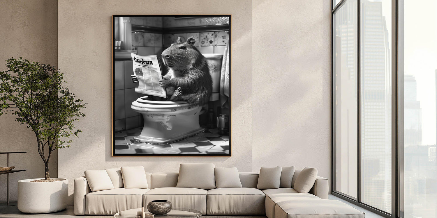 Add a touch of humor and sophistication to your bathroom with this unique wall art featuring a capybara leisurely sitting on a toilet, reading a newspaper. This quirky yet elegant design is perfect for creating a warm and lighthearted atmosphere in modern or eclectic bathroom spaces.