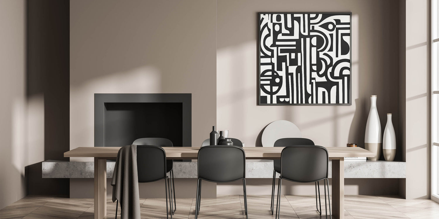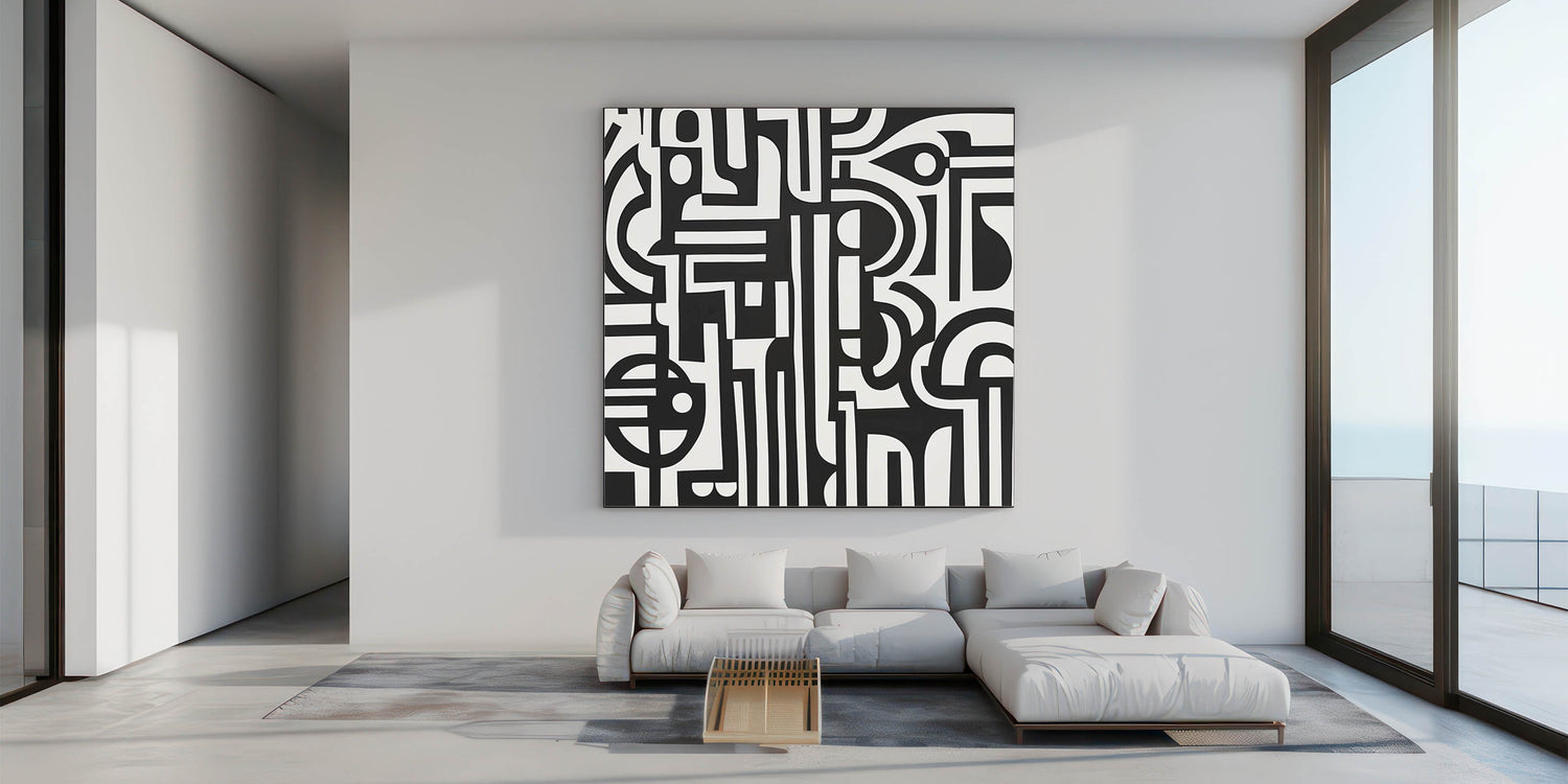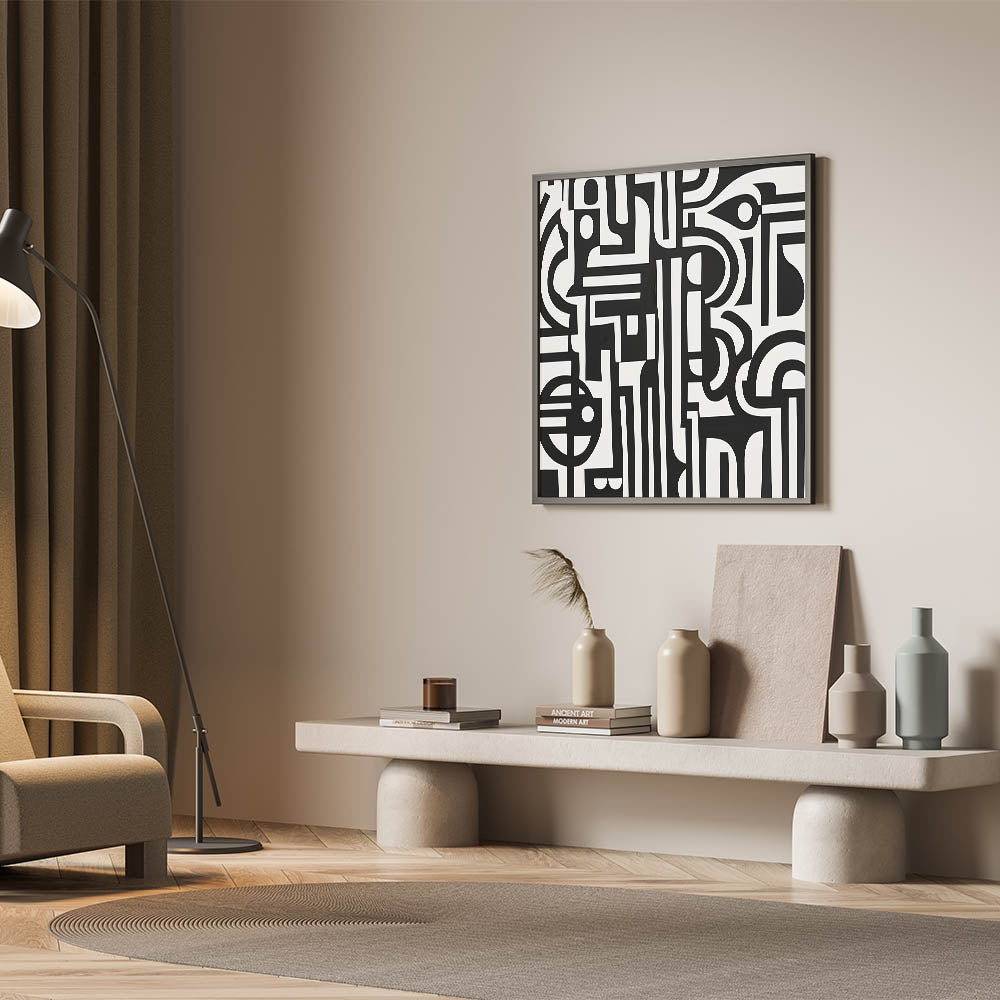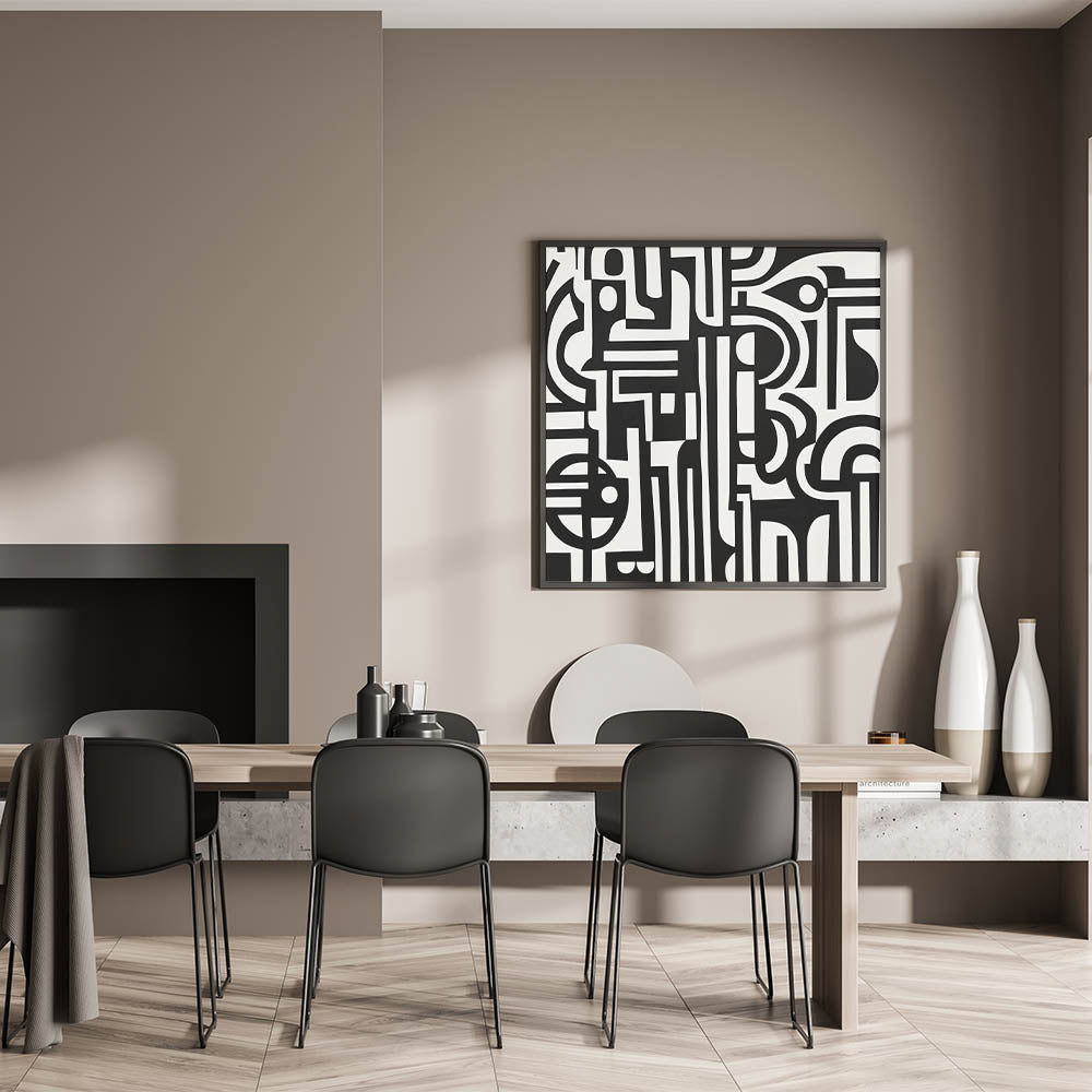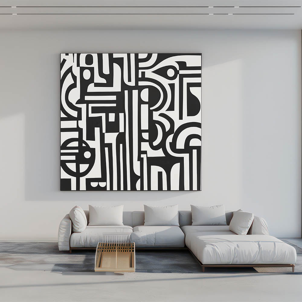 Transform your space with this bold and striking Geometric Abstract Wall Art featuring intricate black and white patterns. The dynamic interplay of geometric shapes and lines creates a visually stunning piece that captures attention and adds depth to any room. Perfect for modern, minimalist, or industrial-style interiors, this artwork serves as a versatile centerpiece for living rooms, offices, or creative spaces.