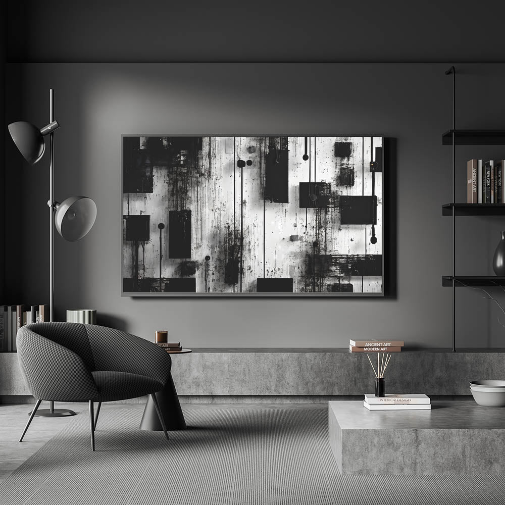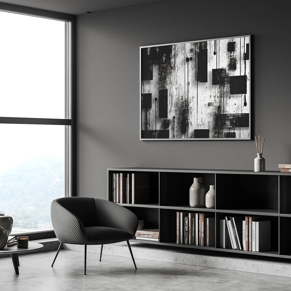 Add a touch of urban edge to your space with this striking black and white abstract artwork. The design features a blend of vertical drips, splatters, and geometric blocks that create a raw, textured composition. The contrasting shades of black and white bring depth and intensity, giving this piece a bold, contemporary look.