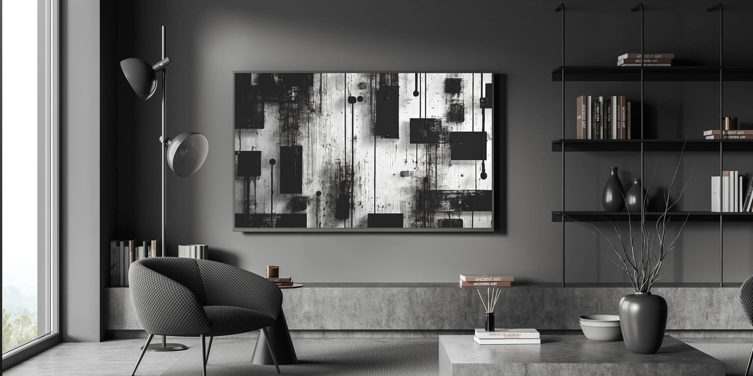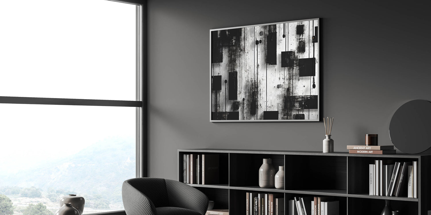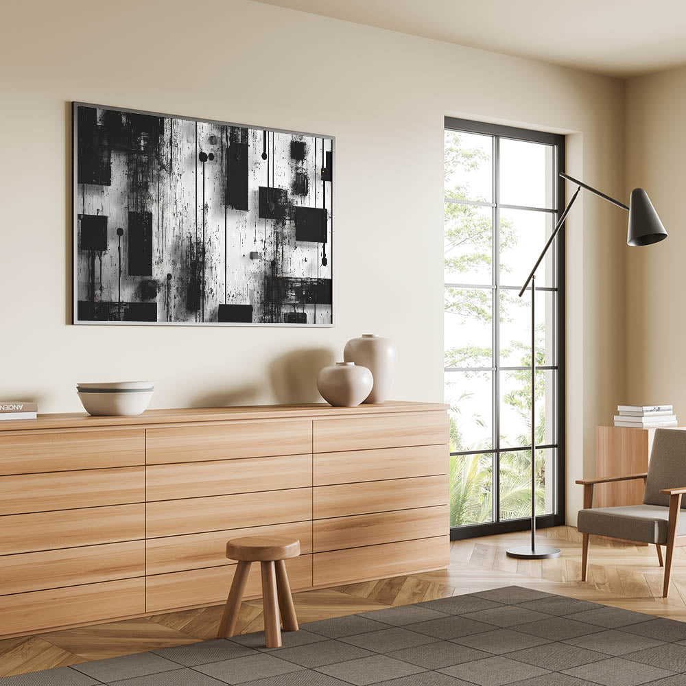 The combination of fluid brush strokes and structured geometric elements gives this piece a unique, captivating appearance. It’s an ideal choice for those looking to make a bold statement with their wall décor. Transform your living room, office, or creative space with this stunning piece that embodies urban sophistication.