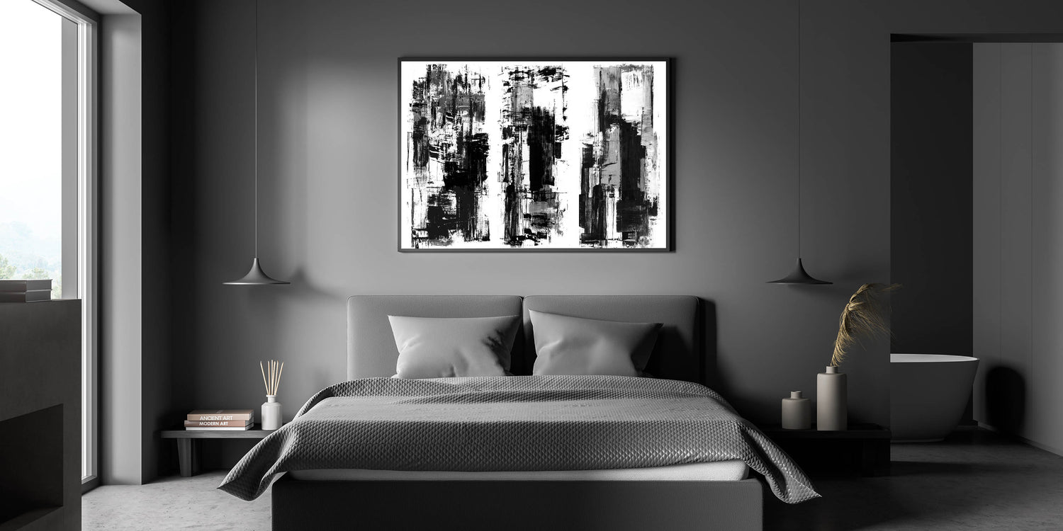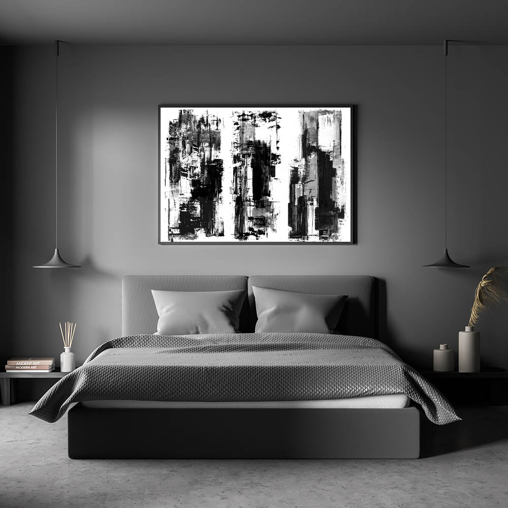 Enhance your bedroom with this modern black and white abstract triptych wall art, featuring expressive brushstrokes and layered textures. The three-panel design creates a bold yet balanced composition, making it a perfect focal point for contemporary bedroom decor. With its high-contrast aesthetic, this piece blends artistic spontaneity with modern sophistication.
