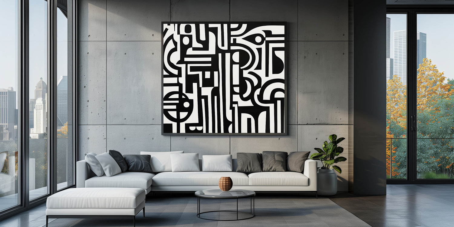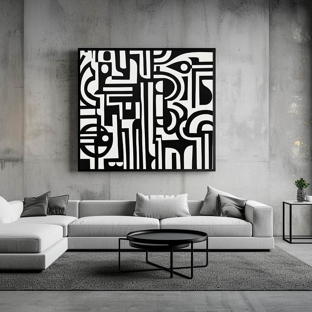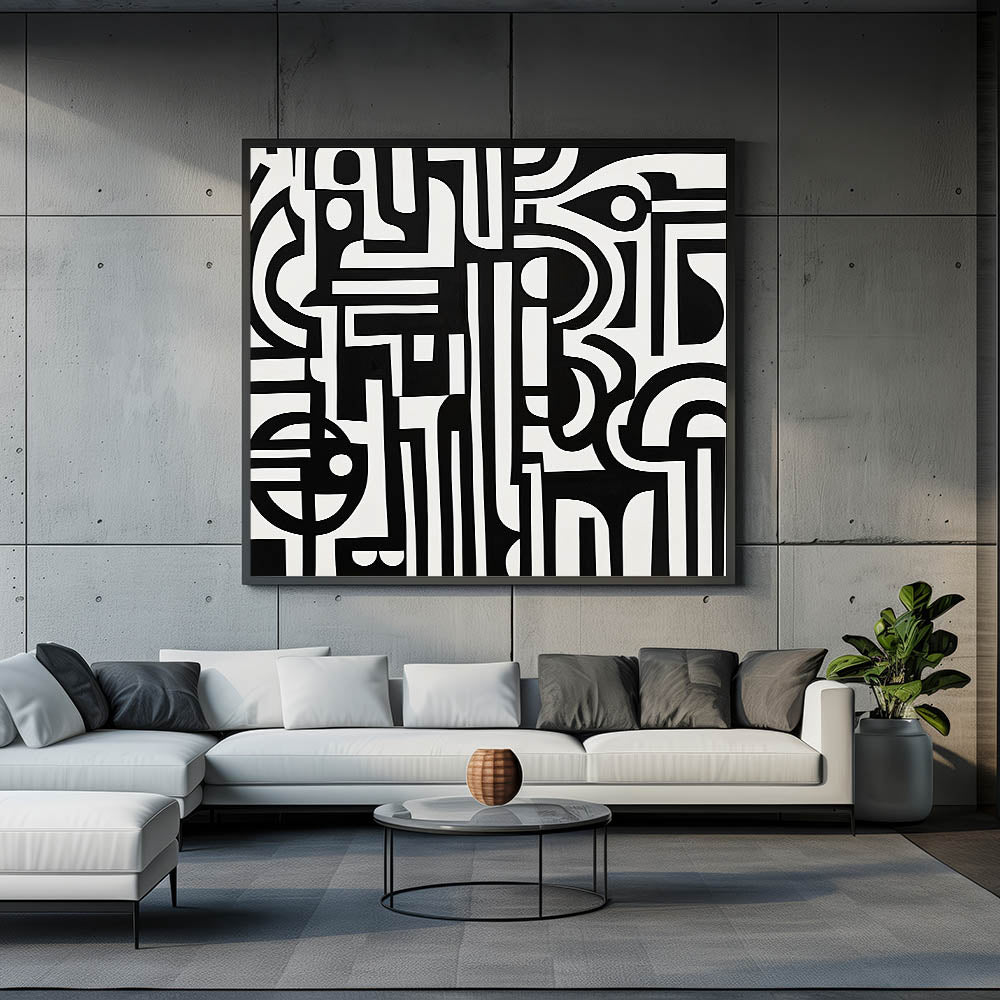Make a bold statement with this modern wall art, featuring a striking black and white abstract geometric design. This canvas wall art adds a contemporary touch to any modern living room decor, making it a perfect addition to wall art for living room spaces. The crisp contrast of black and white art enhances the visual impact, while the intricate geometric forms bring a dynamic energy to your interior. This contemporary wall art is ideal for minimalist, industrial, or urban-styled homes, offering a sleek and sophisticated appeal.