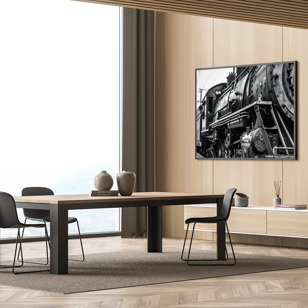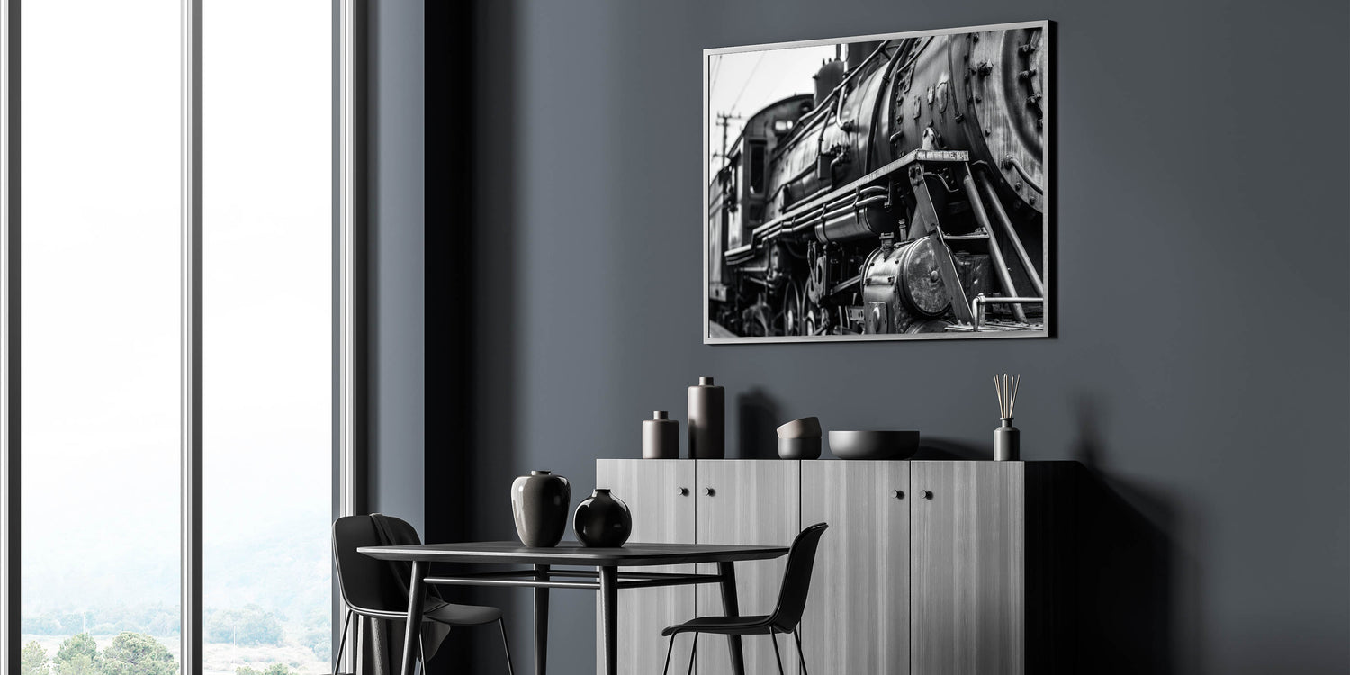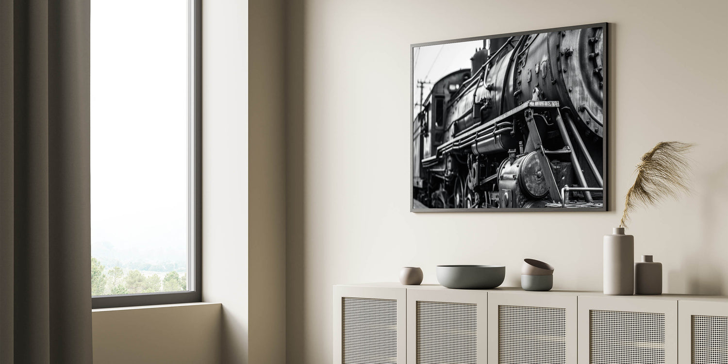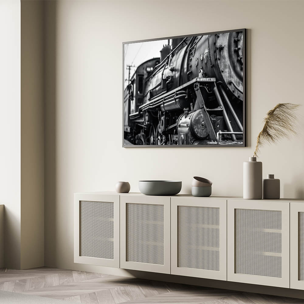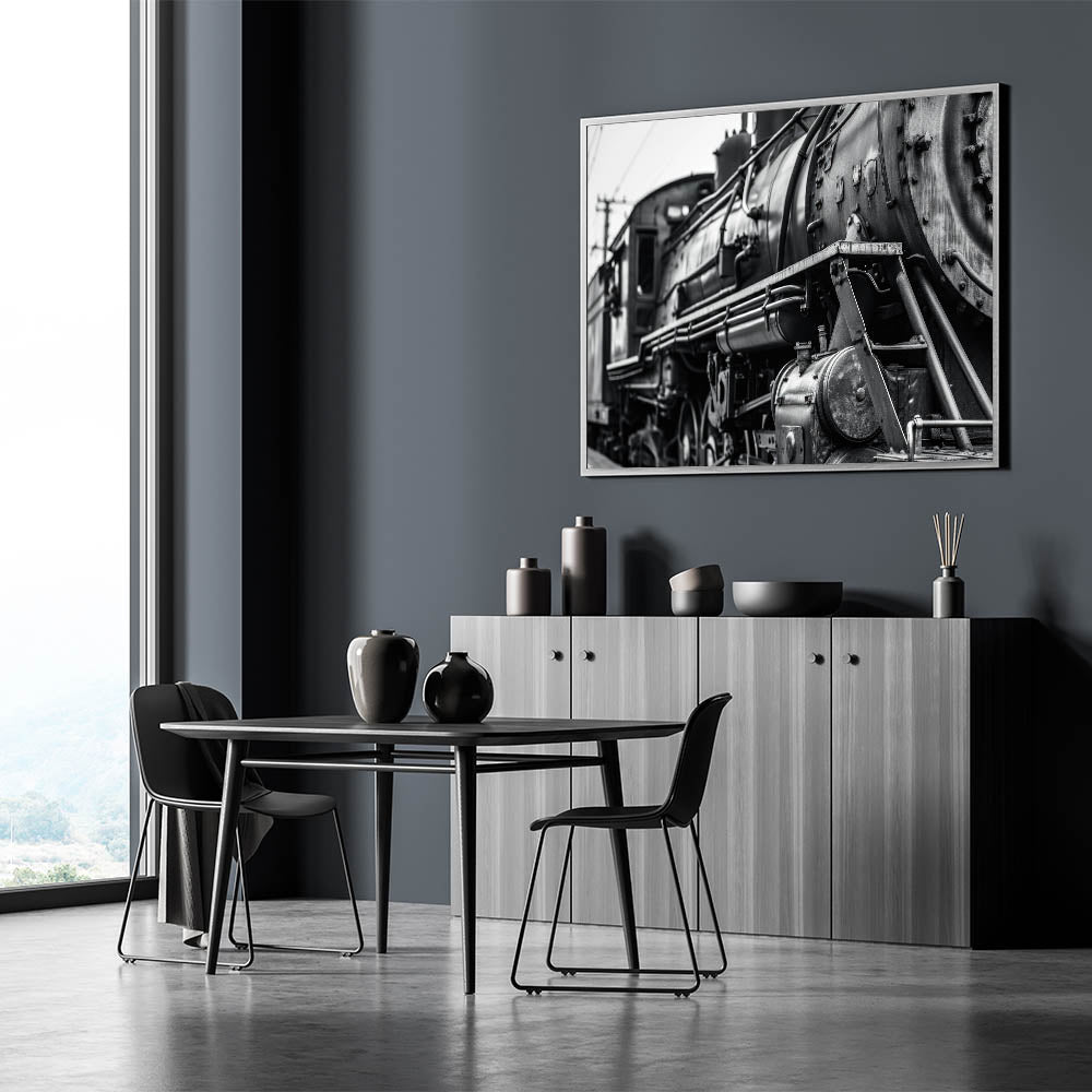 This wall art is a statement piece that adds sophistication and historical charm to any room. Ideal for offices, living spaces, or as a gift for train enthusiasts, the detailed craftsmanship and striking contrast of this print make it a timeless addition to your collection. Its black and white aesthetic ensures versatility and elegance in a variety of interior styles.