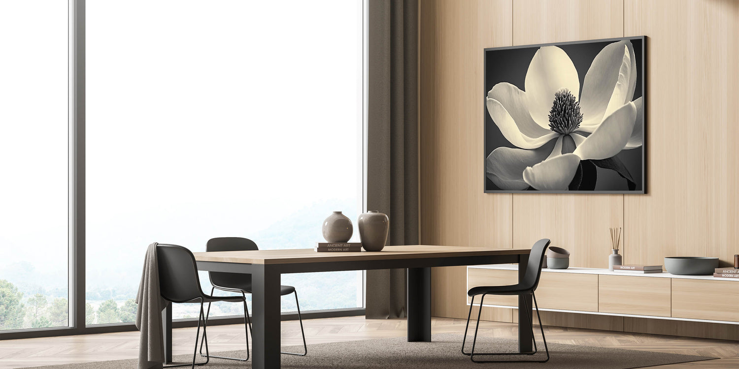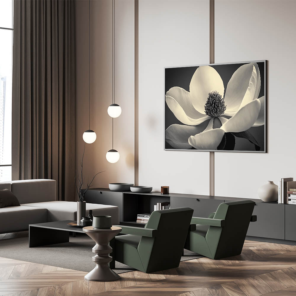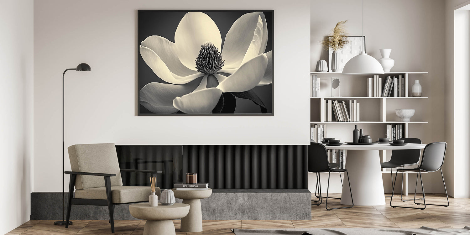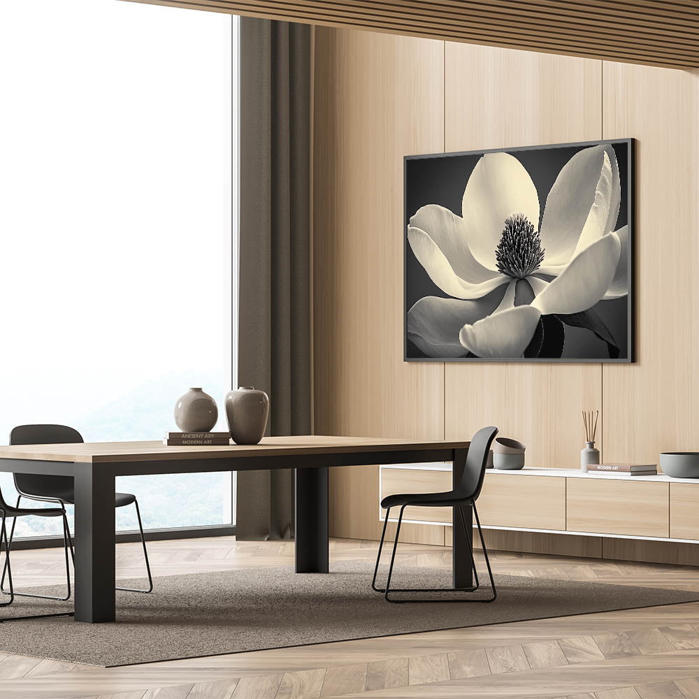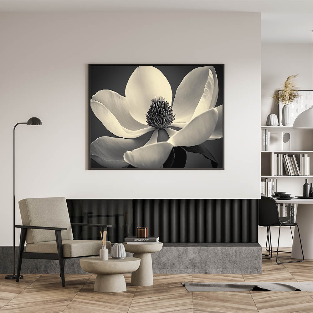 Add timeless sophistication to your home with this stunning black and white wall art, featuring an elegant close-up of a magnolia flower. The intricate details of the petals and the captivating monochromatic tones make this artwork a perfect choice for creating a serene and classic ambiance in any room.
