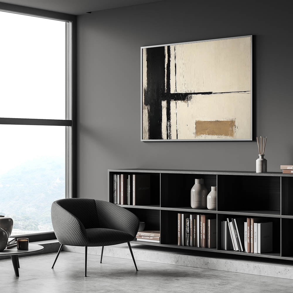 Make a statement with this living room wall art, featuring a striking black, white, and beige abstract geometric design. The bold contrast of structured lines against a soft neutral background gives this modern wall art a sophisticated and timeless look. Whether you're decorating a contemporary space or adding a touch of minimalism to your modern living room decor, this piece delivers artistic elegance.