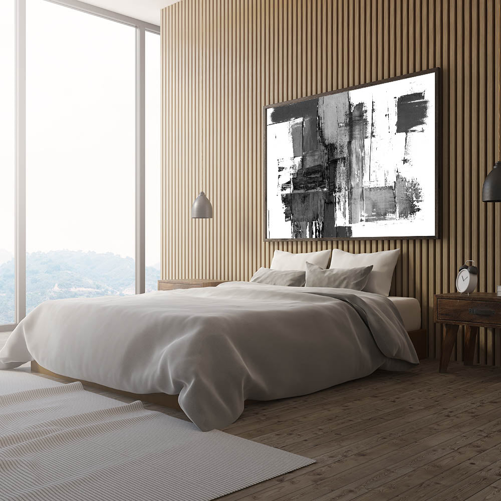 Transform your bedroom space with this modern black and white abstract wall art, featuring bold brushstroke textures that add depth and sophistication. The dynamic composition enhances contemporary and minimalist interiors, making it a versatile choice for any modern bedroom decor. Available in stretched canvas, framed canvas, acrylic glass, and rolled print formats, this customizable bedroom wall art is designed to elevate your personal space.