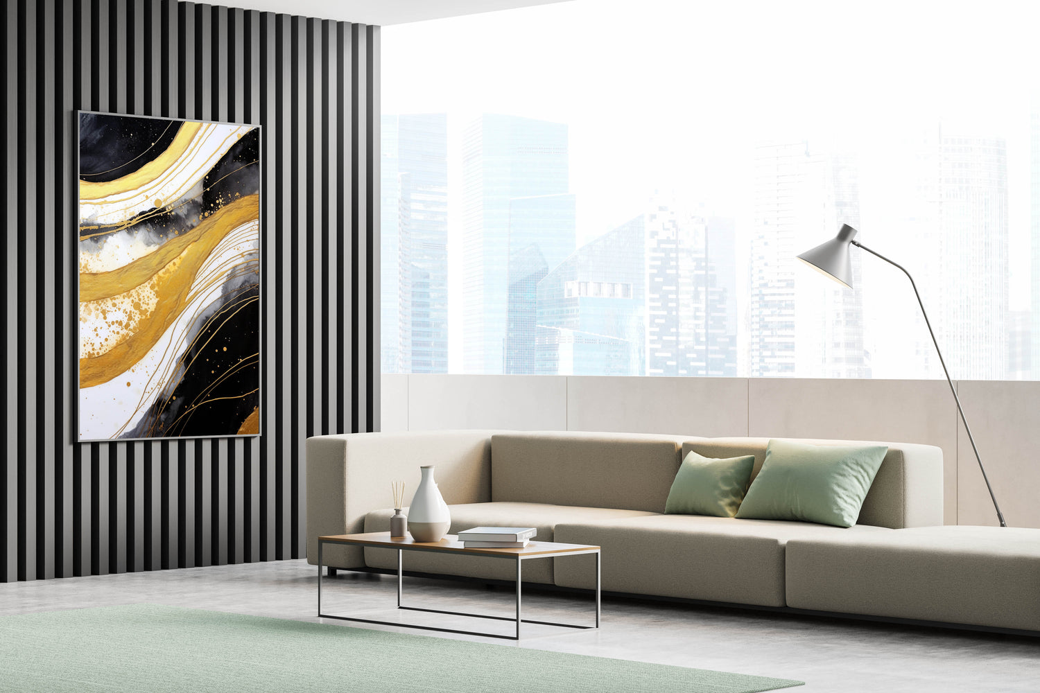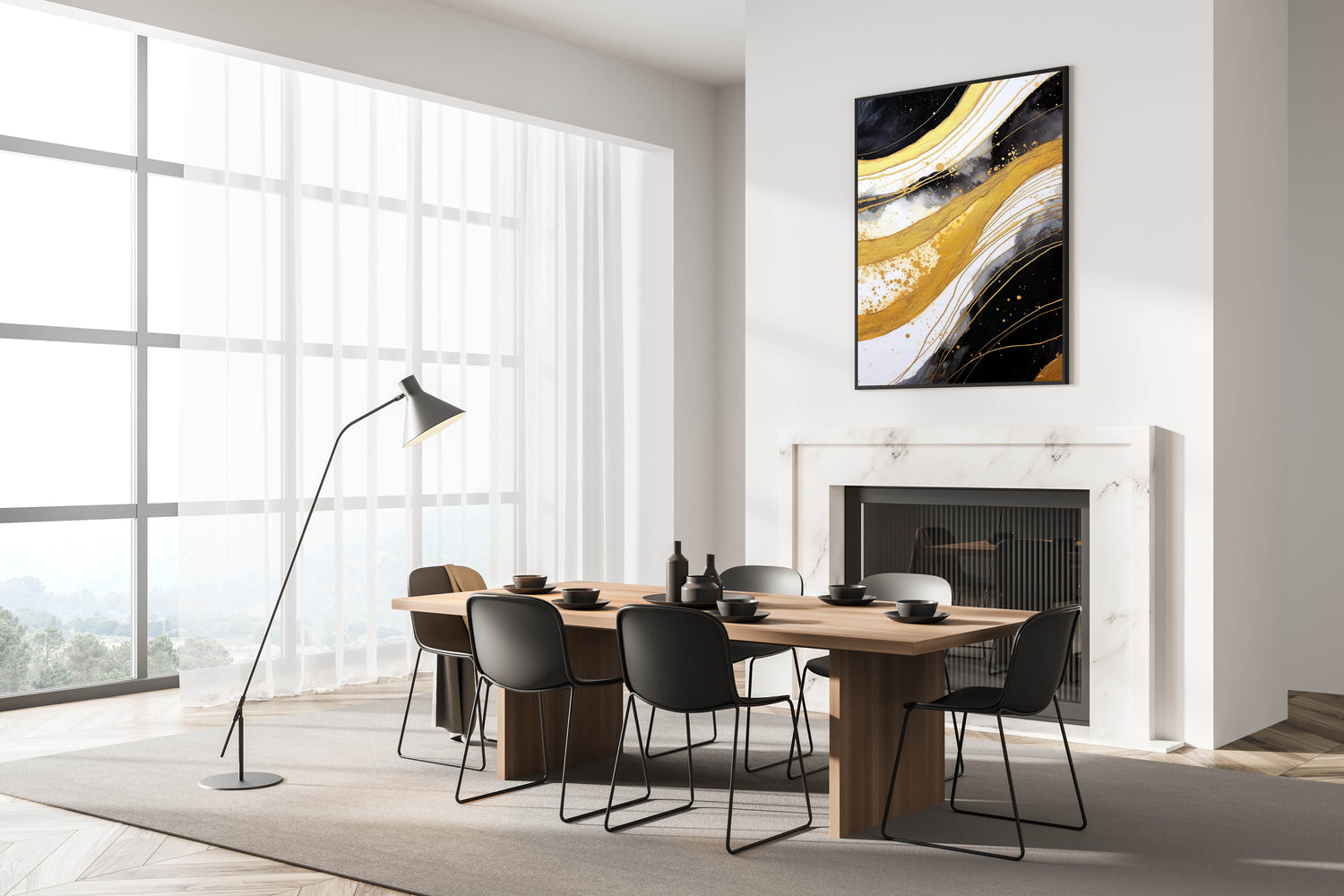 Transform your space with this stunning Black, White, and Gold Abstract Art. The artwork features fluid, sweeping strokes of rich black ink, contrasted beautifully with crisp white and shimmering gold accents. The dynamic design and flowing lines create a sense of movement, while the gold splashes add a touch of luxury and sophistication. This elegant piece is perfect for those seeking a high-contrast, modern statement artwork.