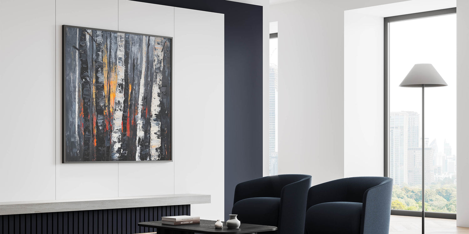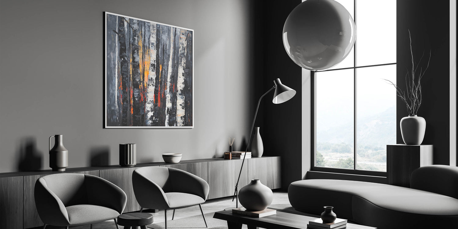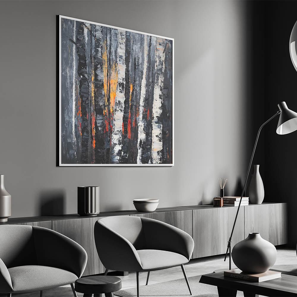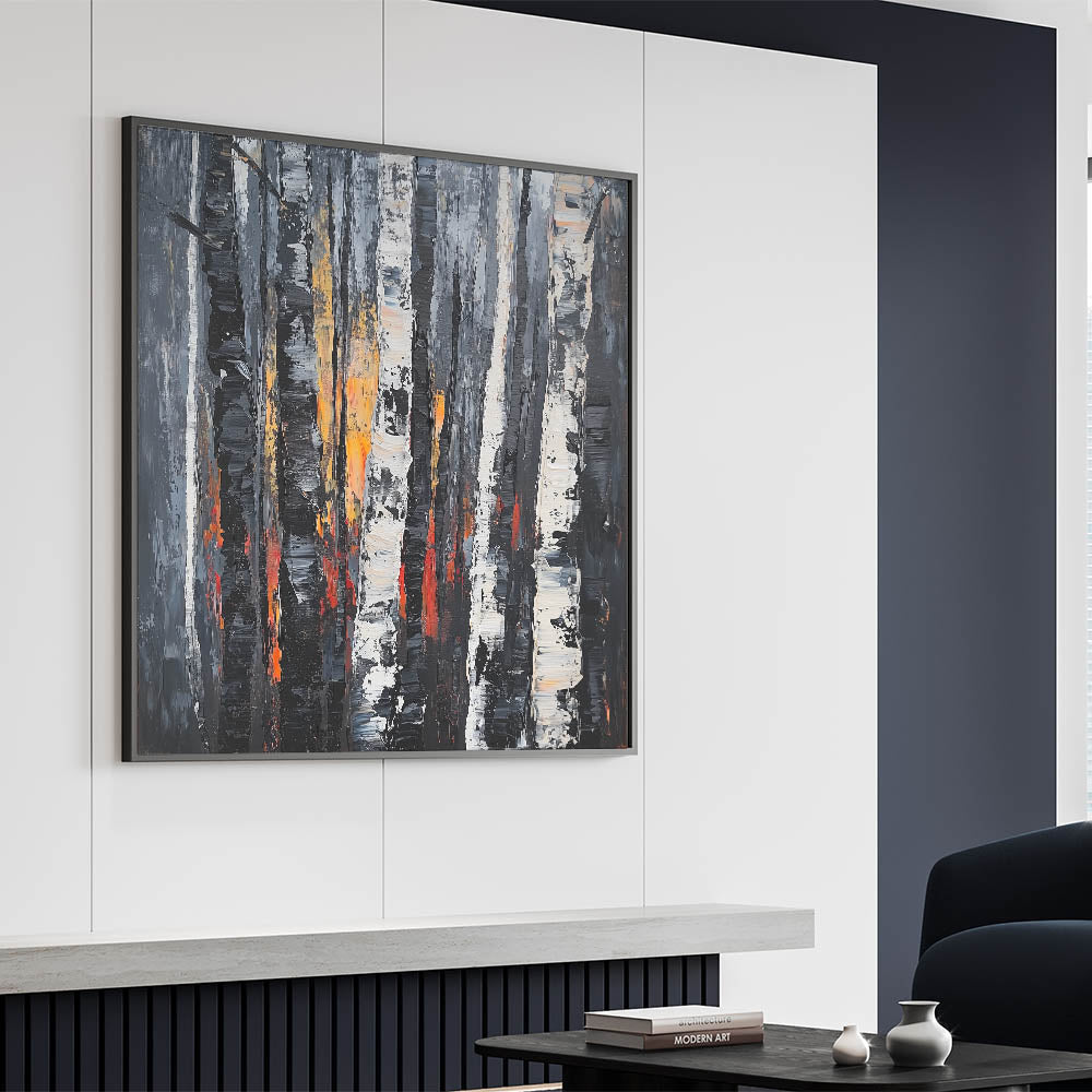 Experience the allure of nature's beauty with this dramatic abstract floral artwork featuring bold birch trees. The intricate textures of black, white, and gray trees are highlighted by fiery accents of orange and red, creating a dynamic and captivating composition. This art piece is perfect for modern, rustic, or industrial interiors, adding depth and sophistication to any space.