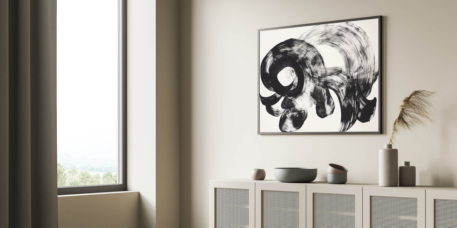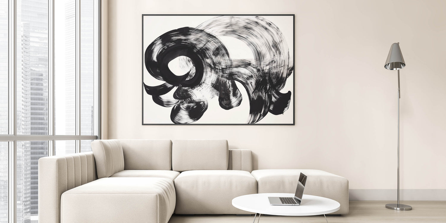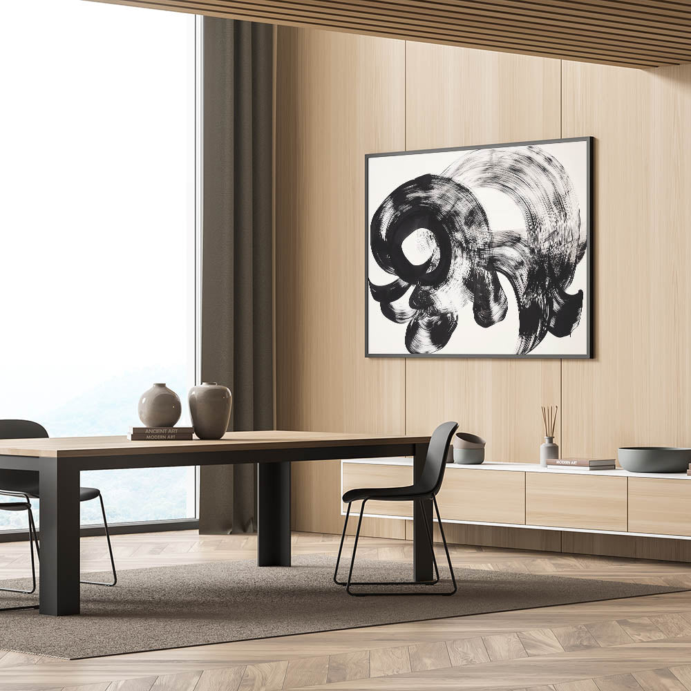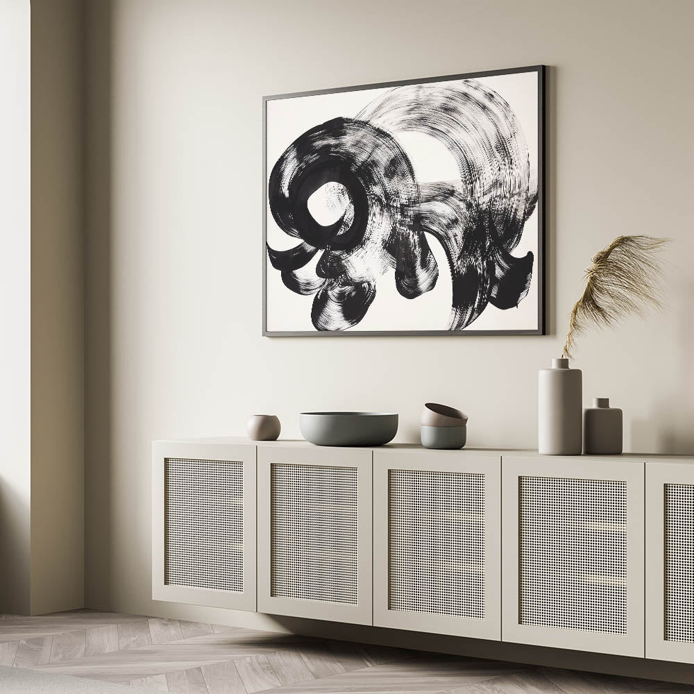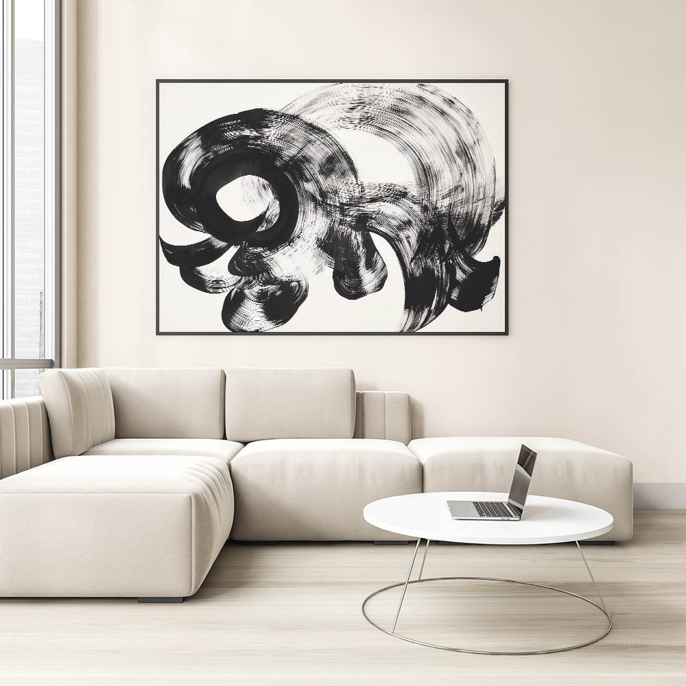 Add a dramatic touch to your space with this Bold Black and White Abstract Line Art. This artwork features dynamic, sweeping black brush strokes on a crisp white canvas, creating a sense of movement and fluidity. The bold contrast between the black and white tones makes it a statement piece perfect for minimalist, modern, or industrial interiors.
