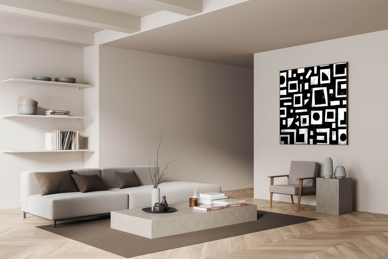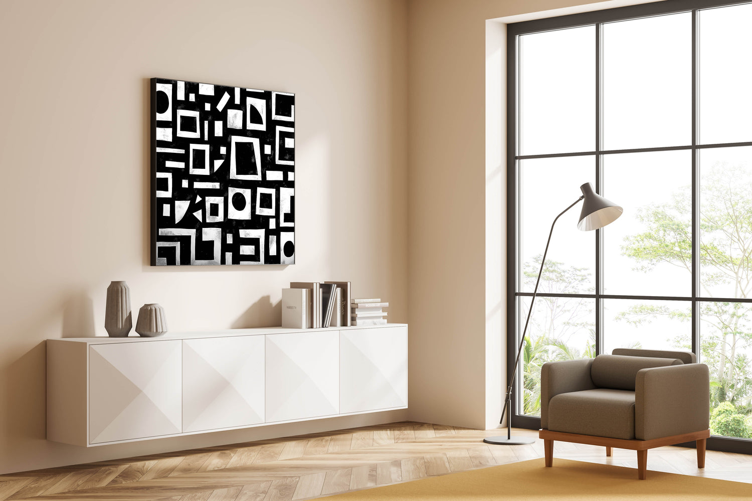 Make a statement with this striking black-and-white geometric abstract art piece. The design features a dynamic mix of shapes, including squares, rectangles, and circles, creating a playful yet structured composition. The high-contrast pattern captures the eye, making it a perfect focal point for any modern, minimalist, or contemporary space.