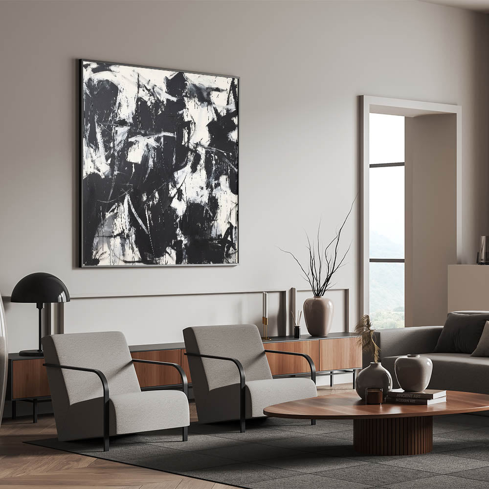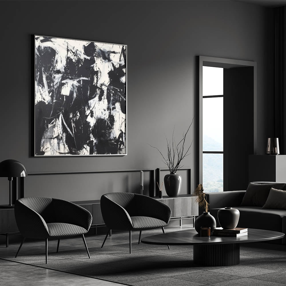 Transform your space with the dramatic elegance of this Bold Monochrome Abstract Splatter Art. Featuring a striking interplay of black splashes and white strokes, this dynamic piece exudes energy and sophistication. Its bold brushwork and chaotic yet intentional composition make it a captivating centerpiece for modern and industrial-inspired interiors.