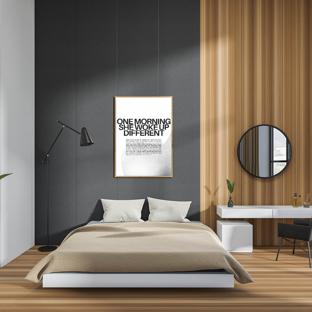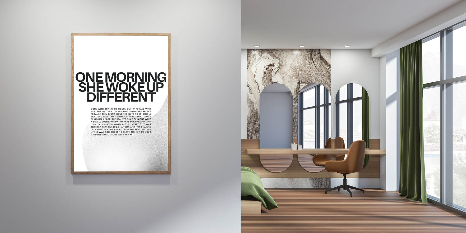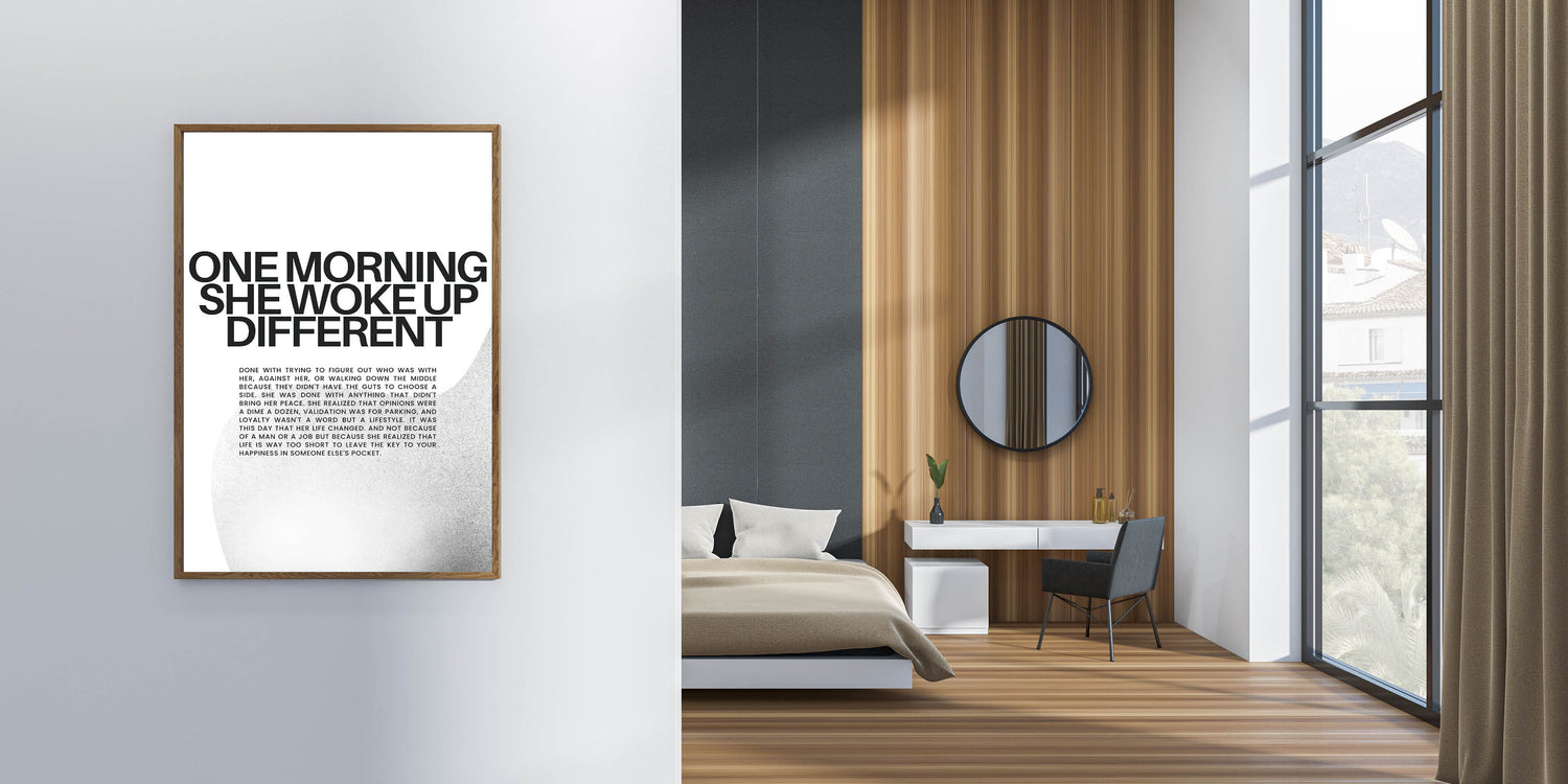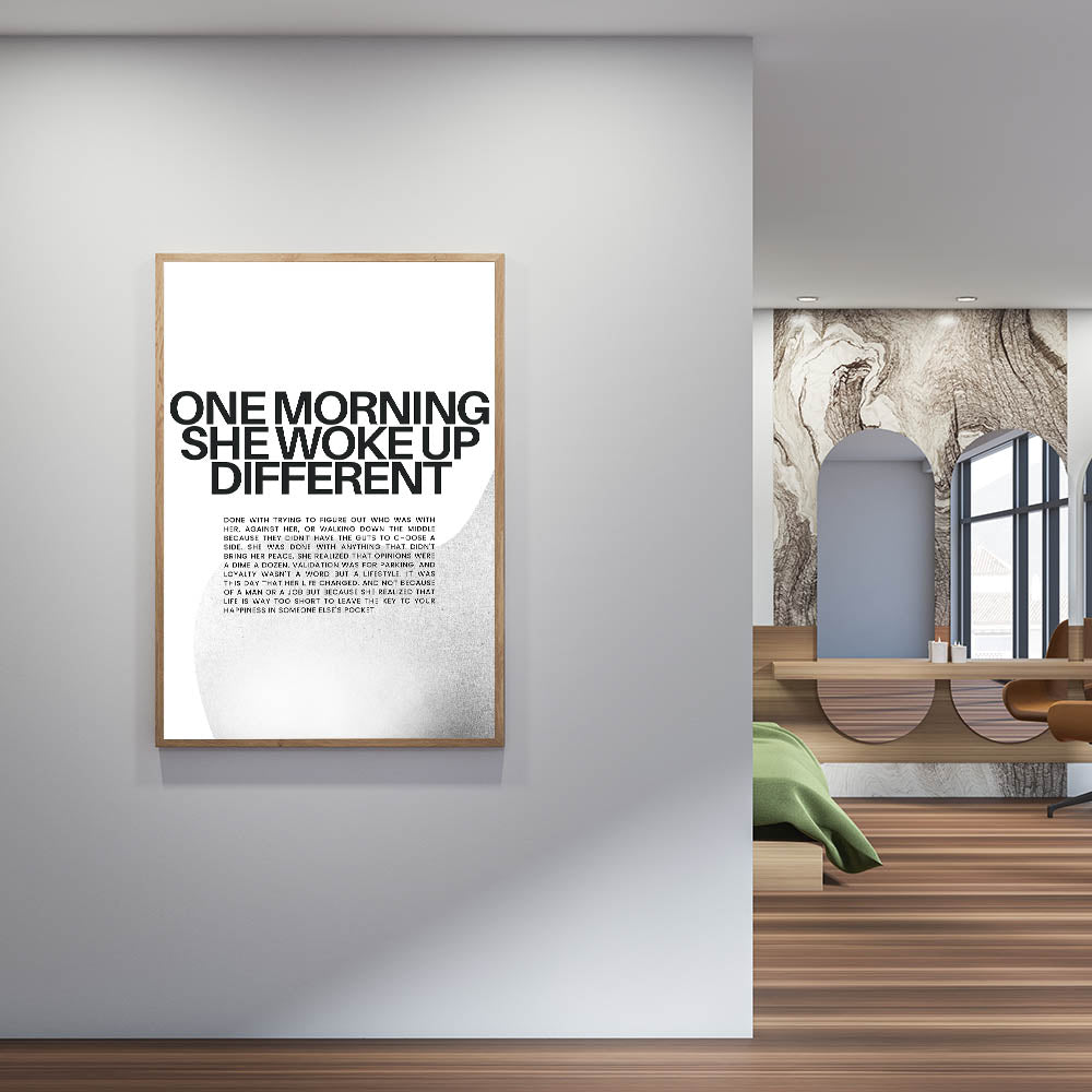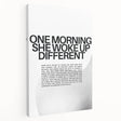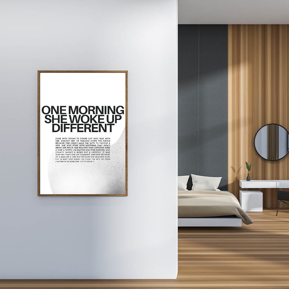 Make a powerful statement with this Bold Typography Art Print featuring the empowering quote: "One morning she woke up different." This design uses a strong, minimalist typeface to convey a message of self-realization and independence. The monochromatic palette, combined with the bold text and clean layout, makes it a striking addition to any modern or industrial-inspired space.