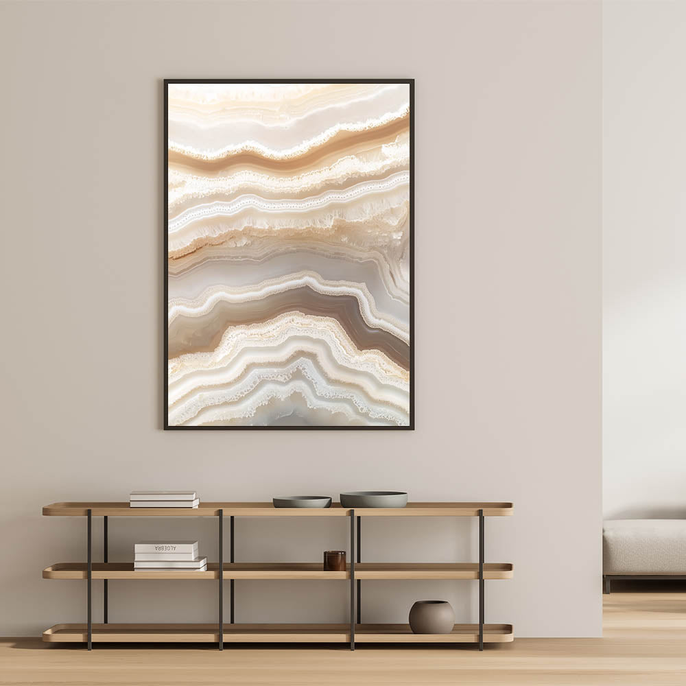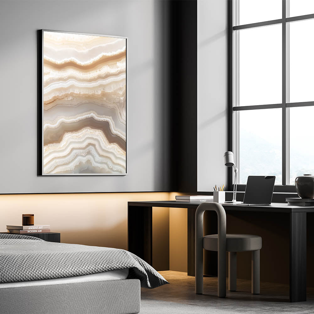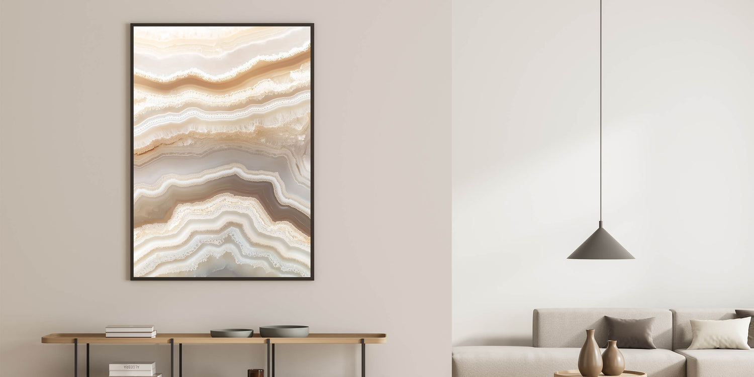 This design celebrates the delicate beauty of natural stone, offering a harmonious blend of art and nature. Whether displayed as a sleek acrylic panel or a traditional framed print, this piece enhances your decor with its understated luxury.