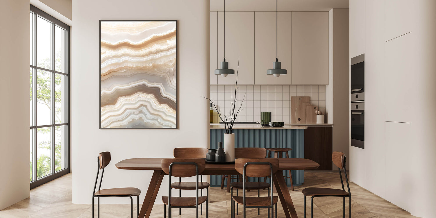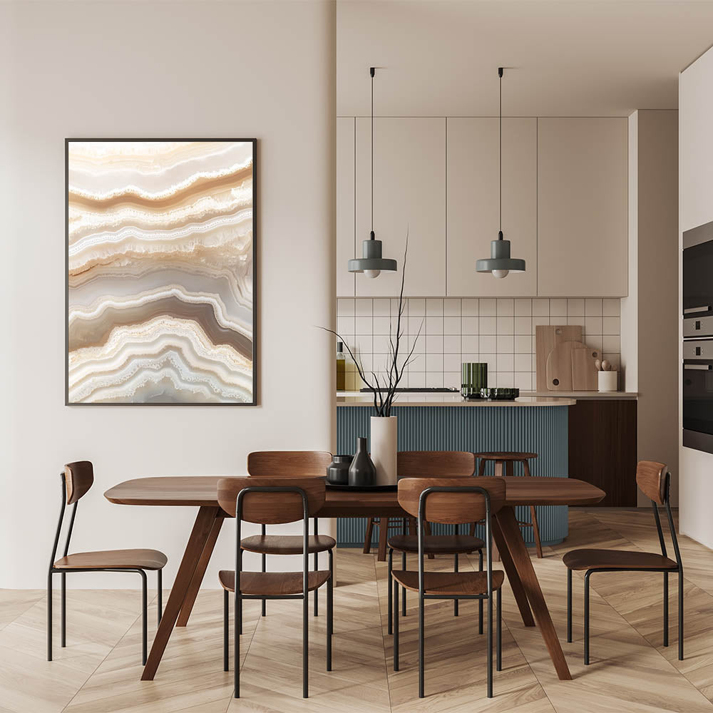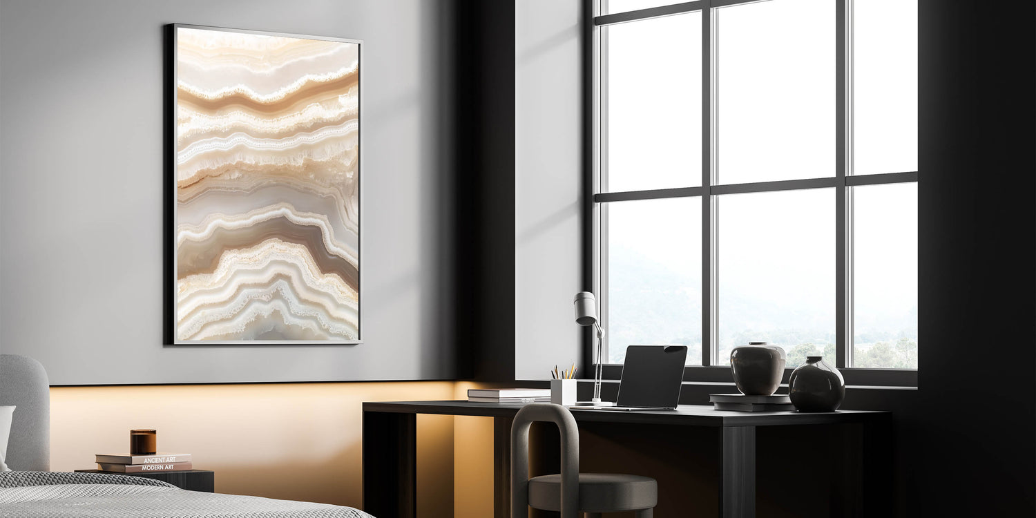 This design celebrates the delicate beauty of natural stone, offering a harmonious blend of art and nature. Whether displayed as a sleek acrylic panel or a traditional framed print, this piece enhances your decor with its understated luxury.