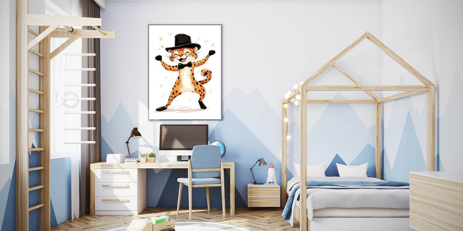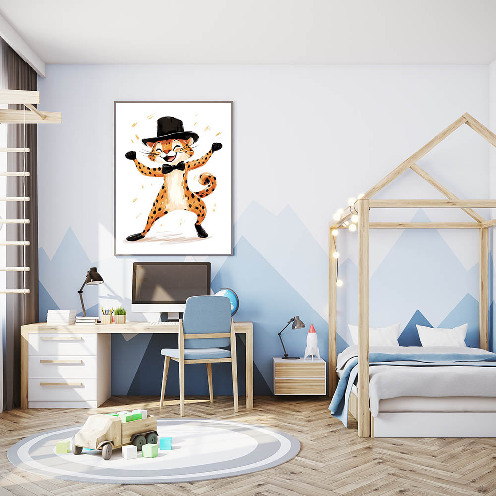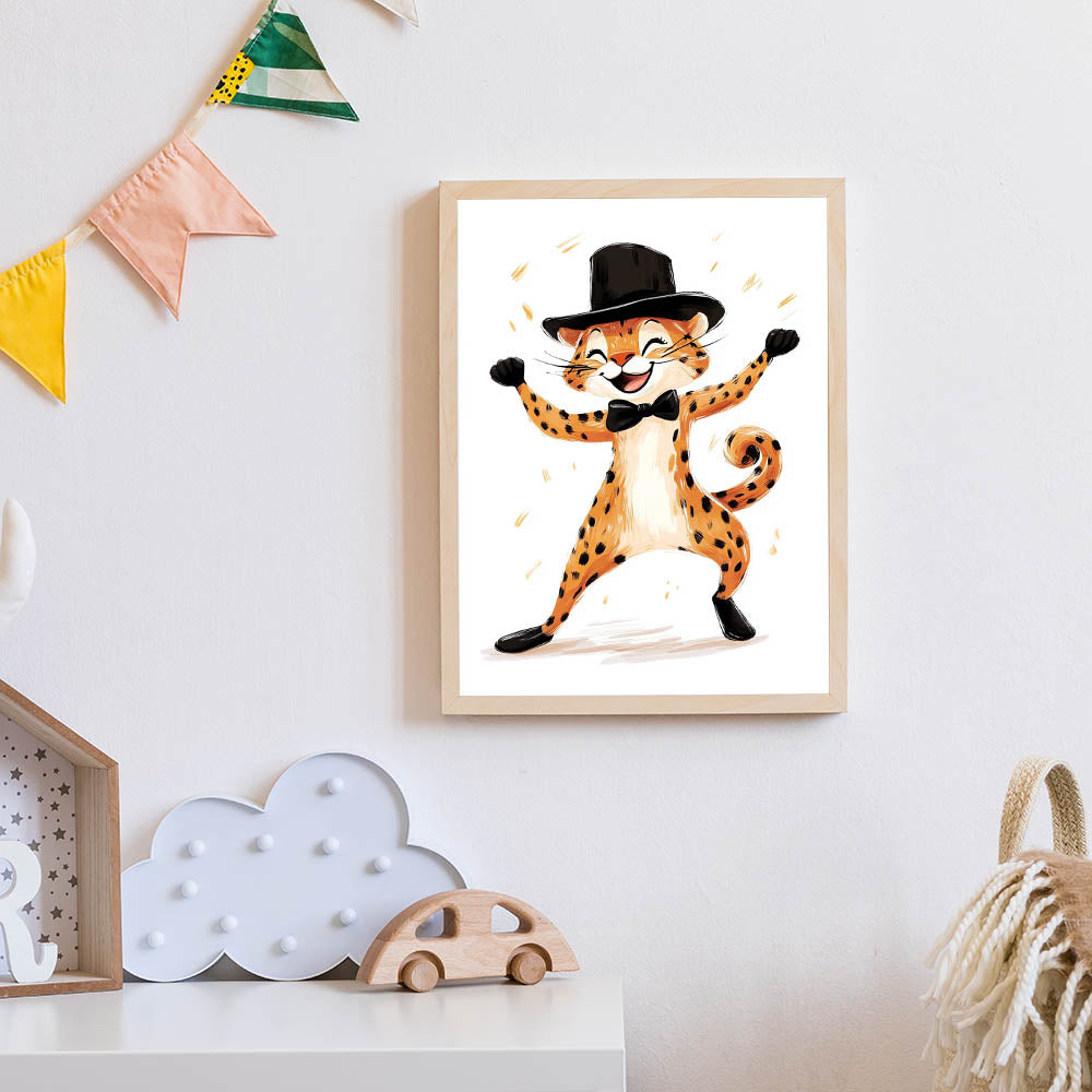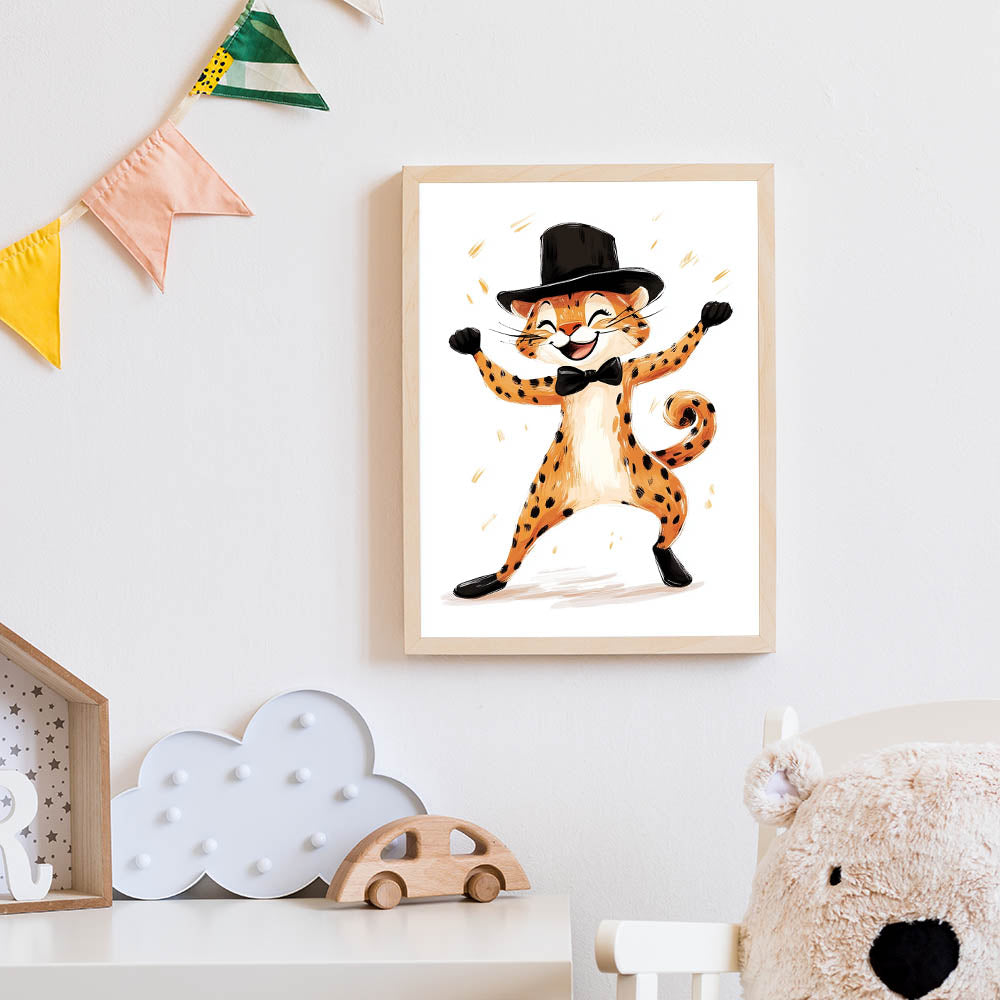 Add energy and charm to your child’s space with this boys wall art print featuring a lively cheetah dressed in a top hat and bowtie. This fun and whimsical illustration brings joy and movement, making it a perfect choice for kids wall art prints, boys’ bedroom art, or playroom wall art. The bright orange tones and playful expression make it a standout piece that adds excitement and personality to any child’s decor.