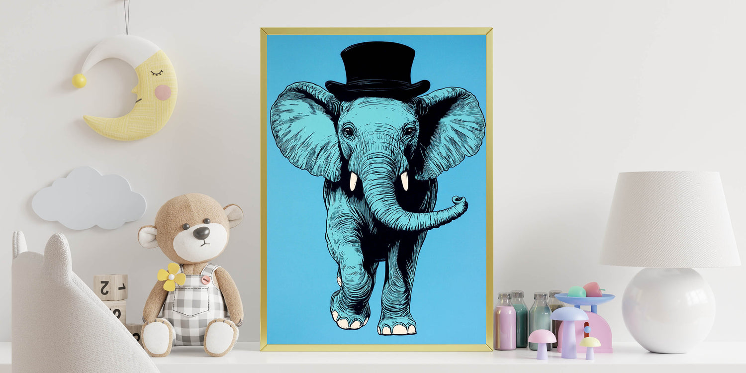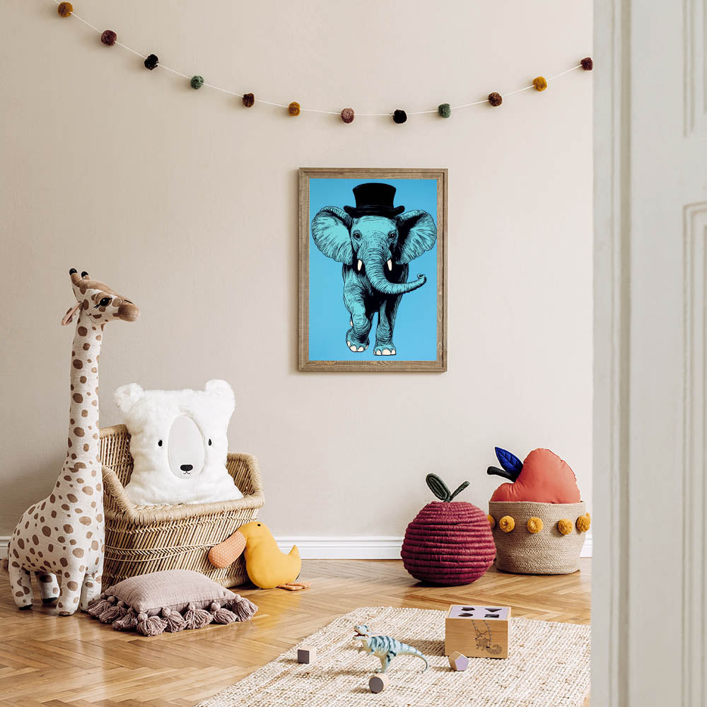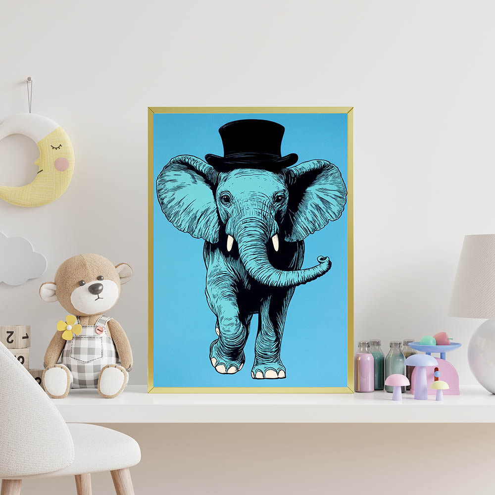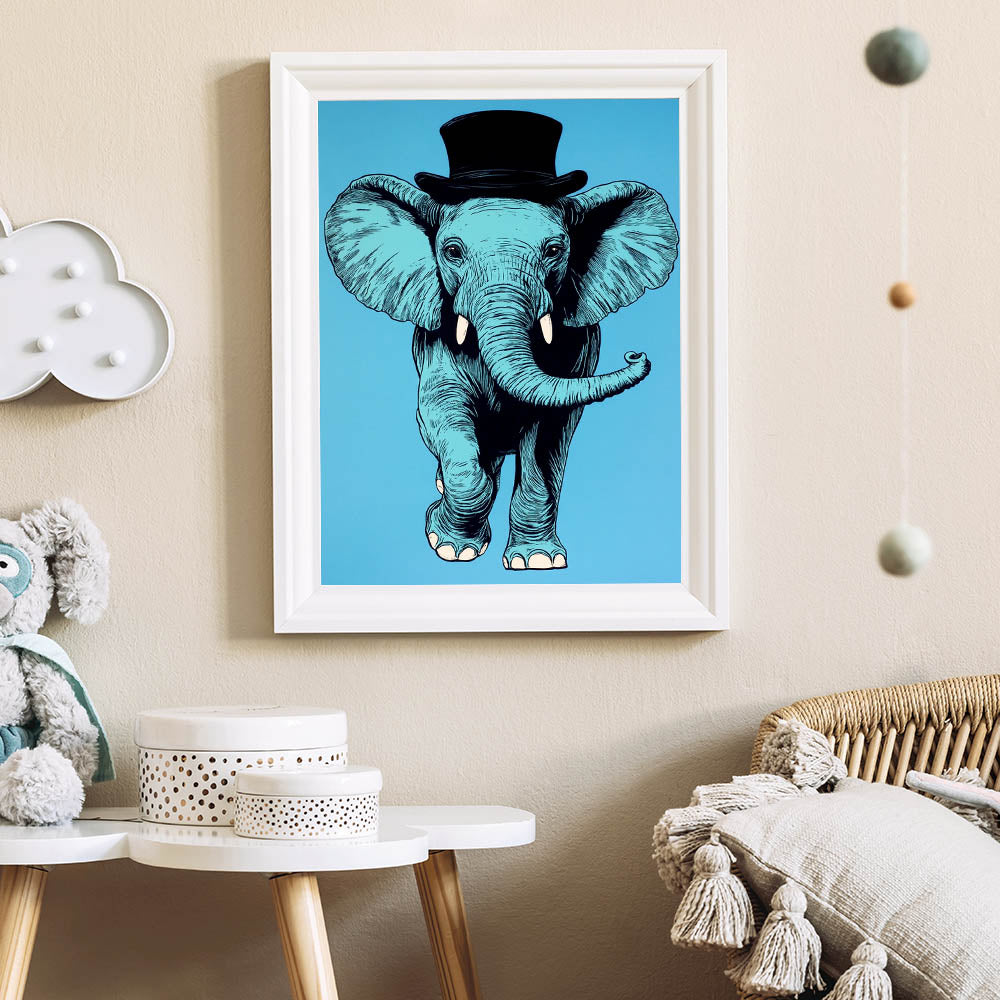 Make a bold statement in your child’s room with this boys wall art print featuring a striking elephant in a top hat. This unique and artistic piece blends classic illustration with modern style, making it a standout addition to kids wall art prints, boys' bedroom art, and playroom wall art. The rich blue tones and black detailing create a sophisticated yet playful aesthetic that works beautifully in a variety of spaces.