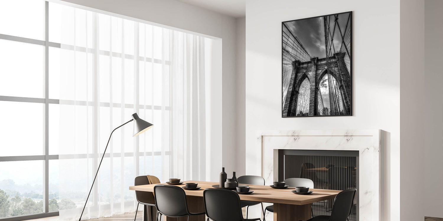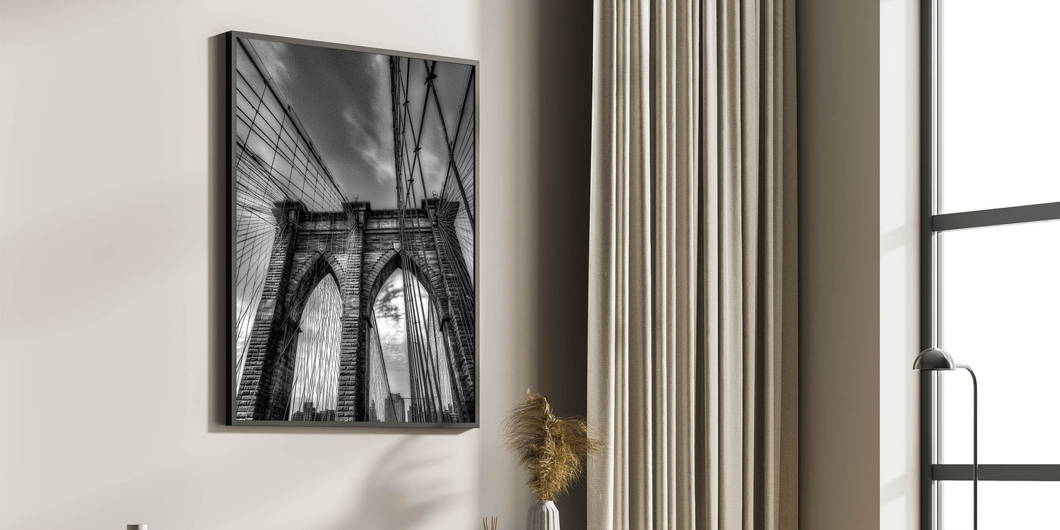 - Captures the intricate details of the Brooklyn Bridge in bold black and white.