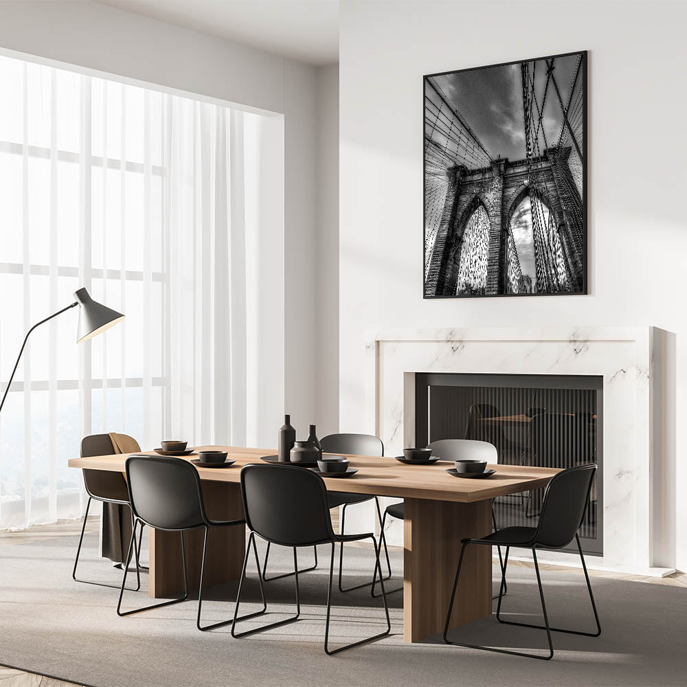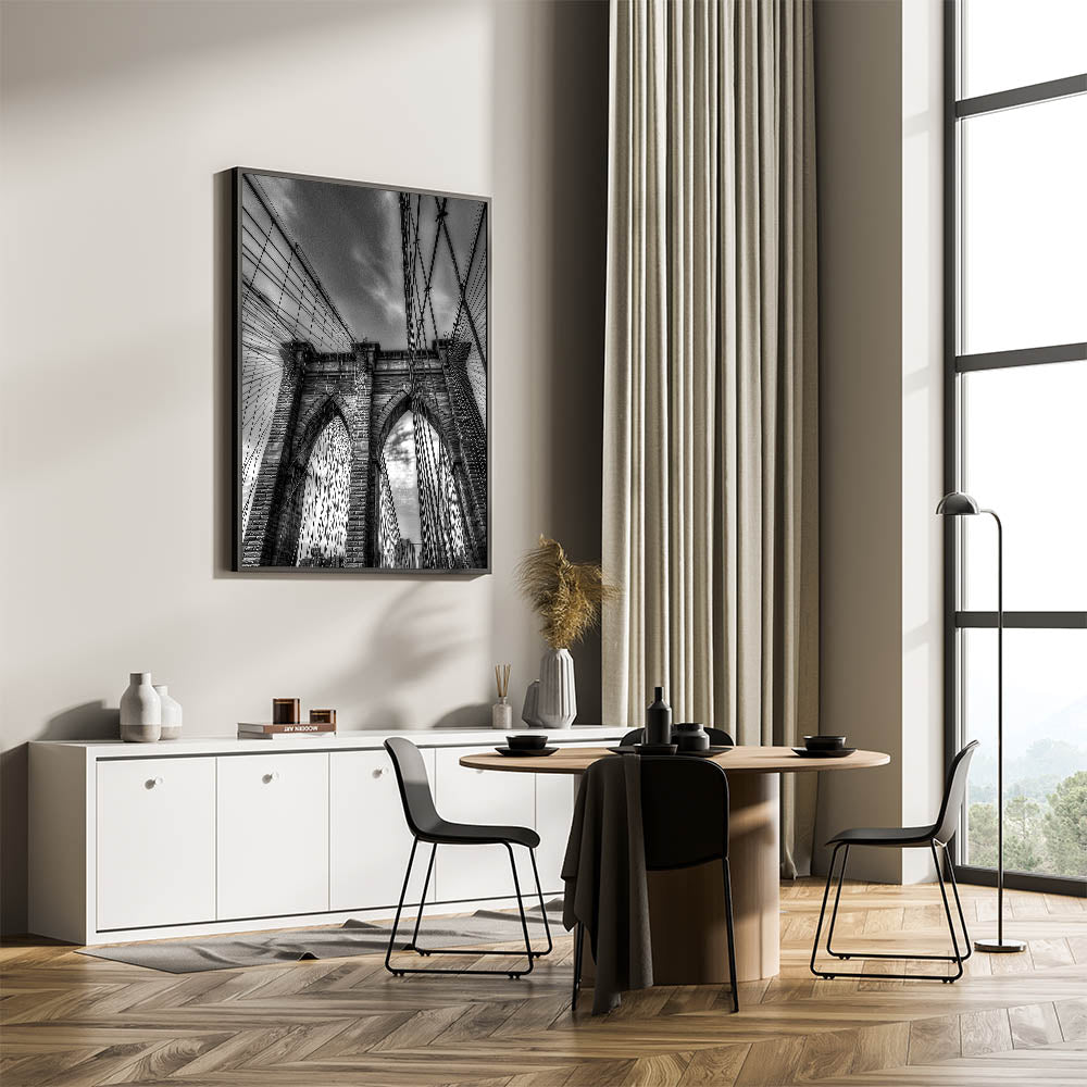 Discover the timeless beauty of the Brooklyn Bridge with this decorative black-and-white wall art. The intricate details of its iconic stone arches and steel cables are captured in striking monochrome, offering a classic yet contemporary aesthetic. The high-contrast tones emphasize the bridge’s architectural elegance and historical significance, making this artwork a sophisticated centerpiece for any decor.