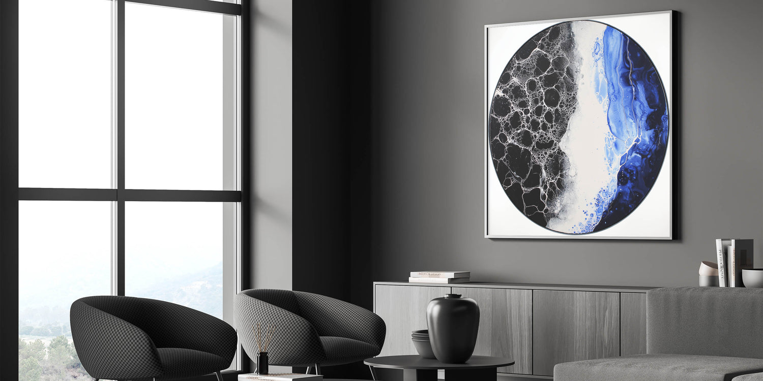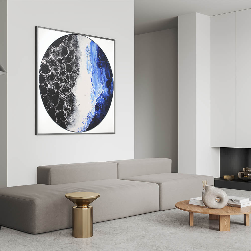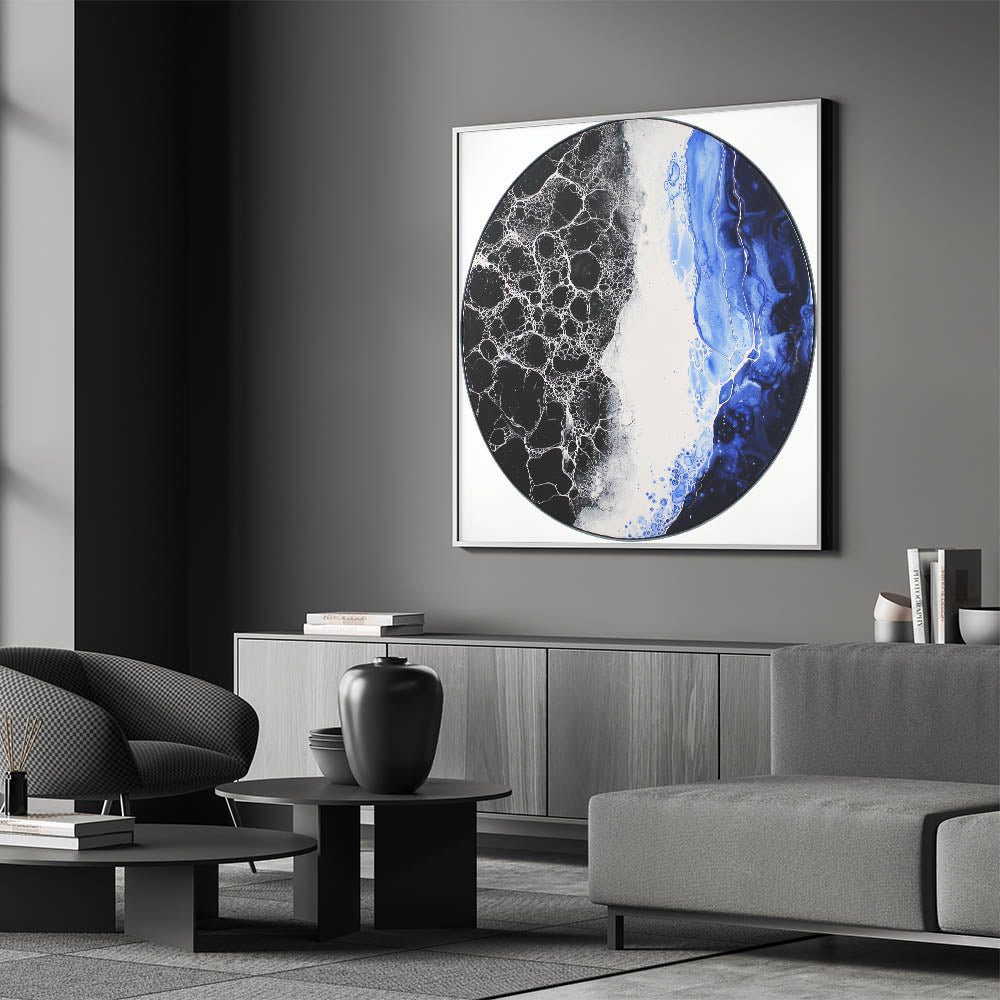 Elevate your decor with this captivating Geometric Abstract Wall Art, showcasing a circular composition in bold black, vibrant blue, and crisp white tones. The intricate textures and fluid patterns create a mesmerizing interplay of color and design, adding a touch of modern sophistication to your space. Perfect for minimalist, contemporary, or artistic interiors, this piece makes an eye-catching addition to living rooms, offices, or creative spaces.