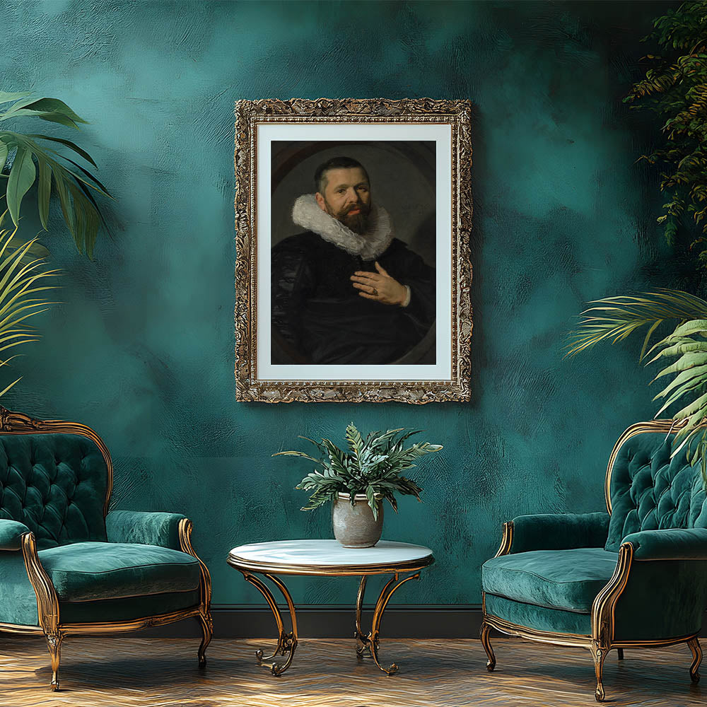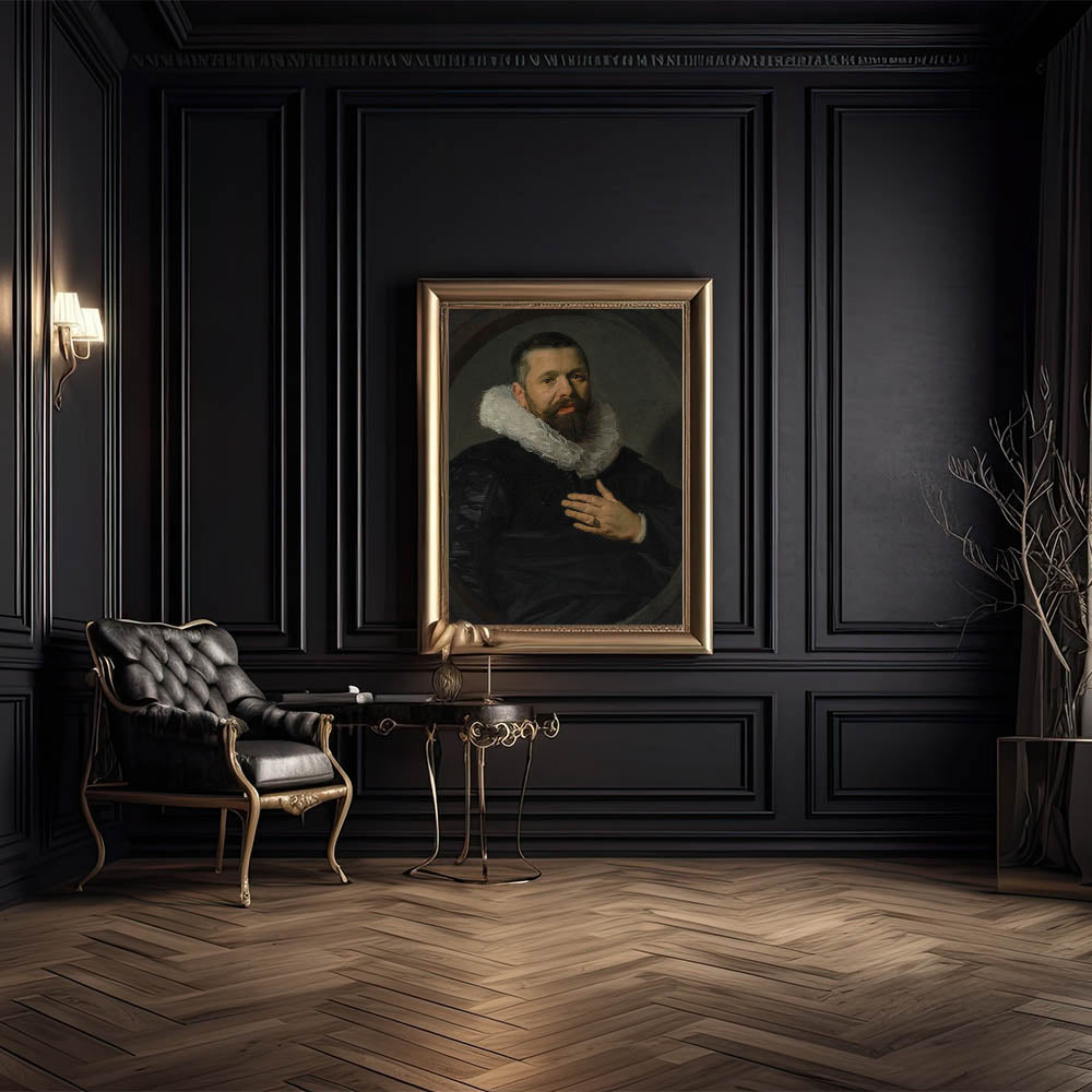 Step into the elegance of Baroque history with this dignified portrait of a nobleman, dressed in a striking black garment with an elaborate white ruff collar. The artist has expertly captured the noble figure's composed expression, creating an aura of confidence and grace that is characteristic of the Baroque period. The dark tones contrast beautifully with the soft white ruff, highlighting the intricate detailing and fine craftsmanship that make this piece a true representation of Baroque art.