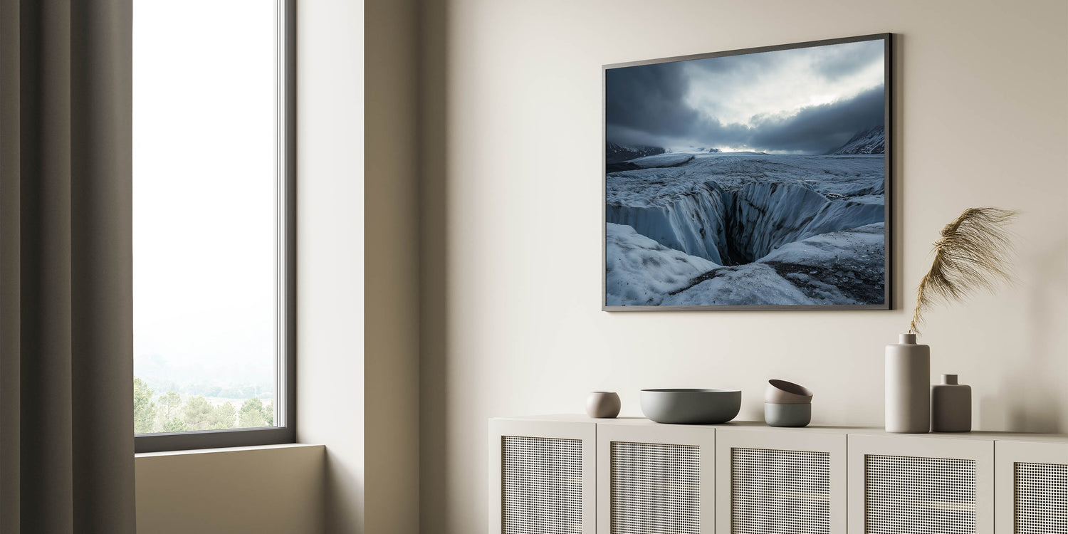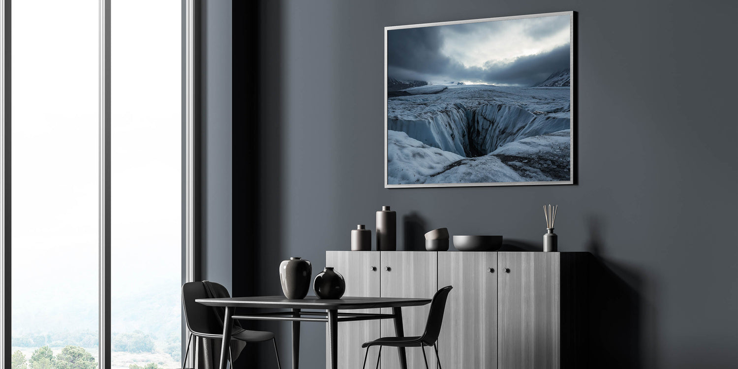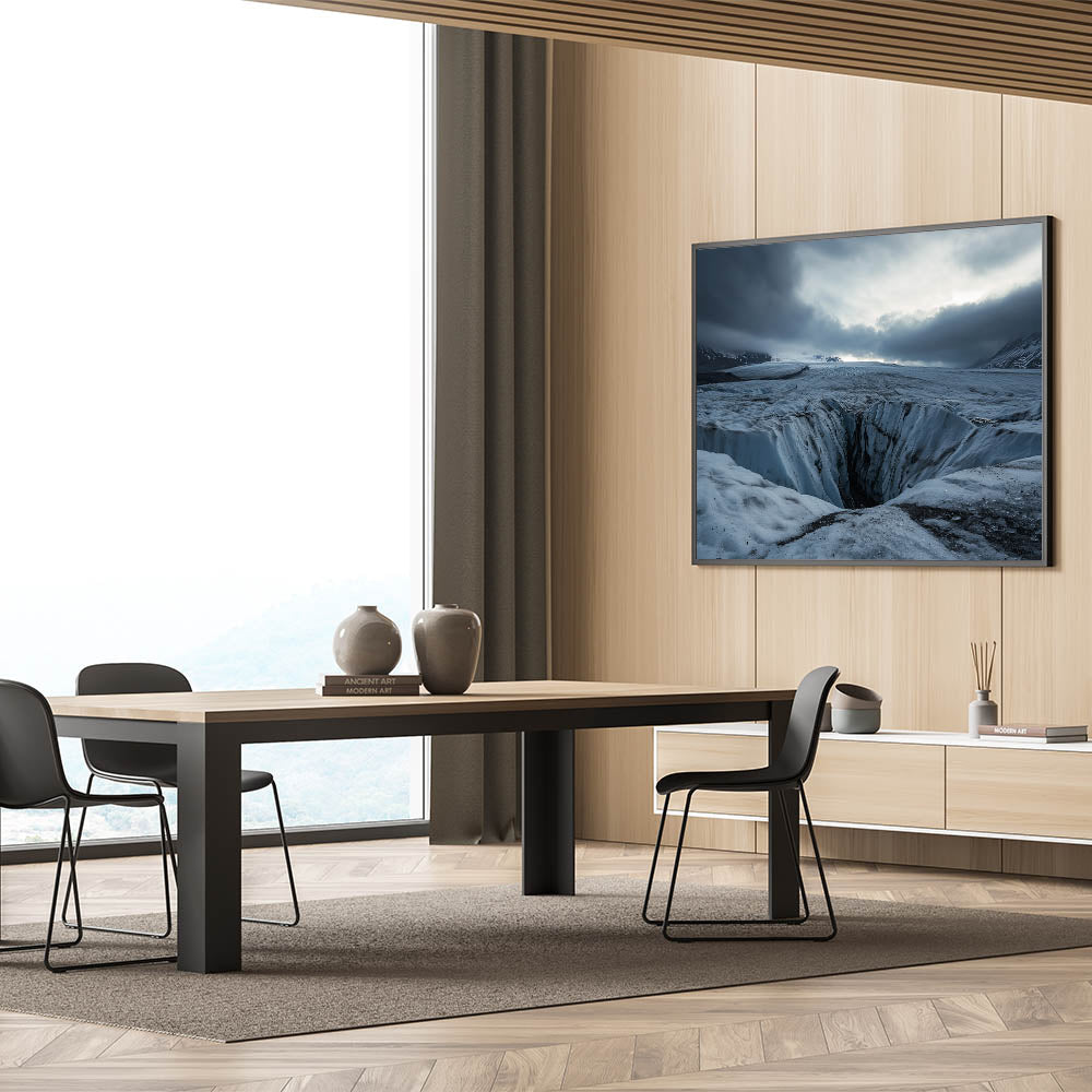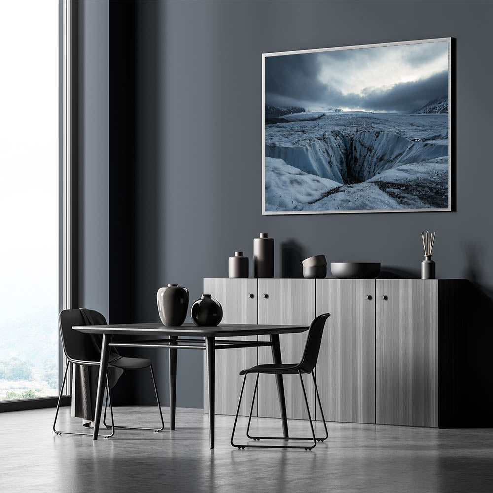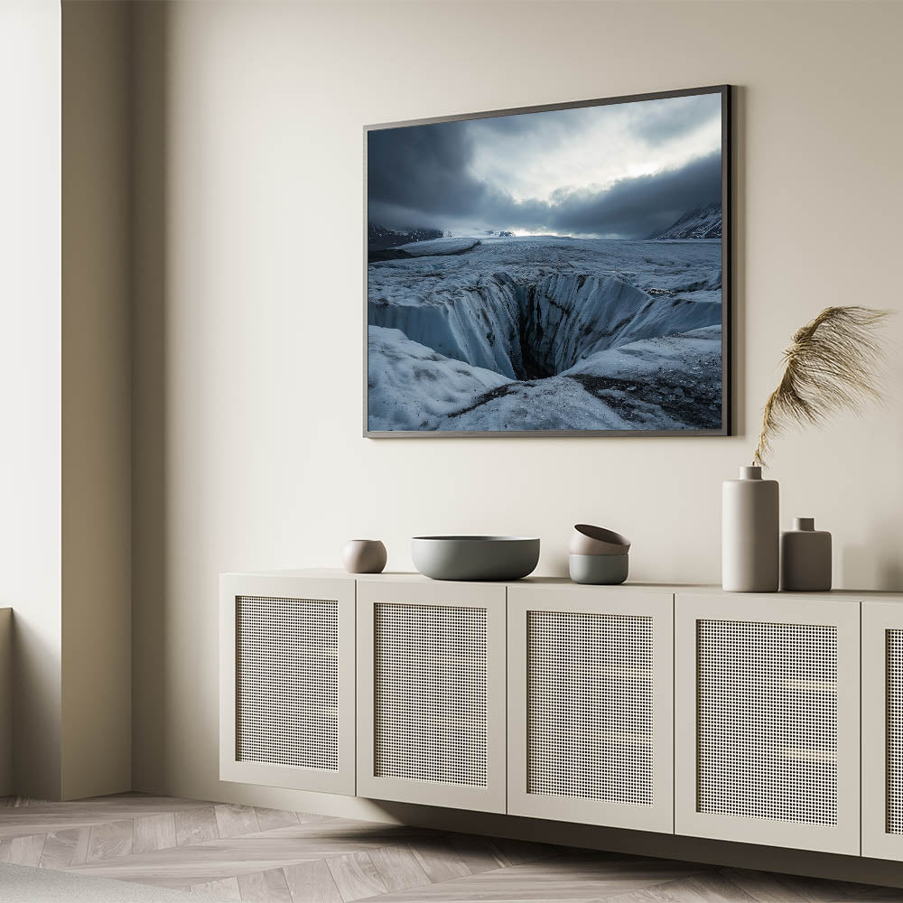 Explore the breathtaking beauty of this Cliffs Acrylic Glass Art featuring a majestic Arctic ice canyon under a dramatic, stormy sky. This artwork captures the raw, untamed power of nature with its deep icy chasm, rugged textures, and moody atmosphere. Perfect for those who appreciate unique and striking landscapes, this piece adds an air of mystery and sophistication to any space.