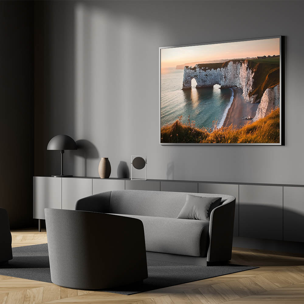 This scenic cliffs artwork blends the timeless charm of natural cliffs photography with the warm tones of a coastal sunset. A perfect addition to your collection, this decorative cliffs print captures the essence of nature's elegance, making it a must-have for any home or office.