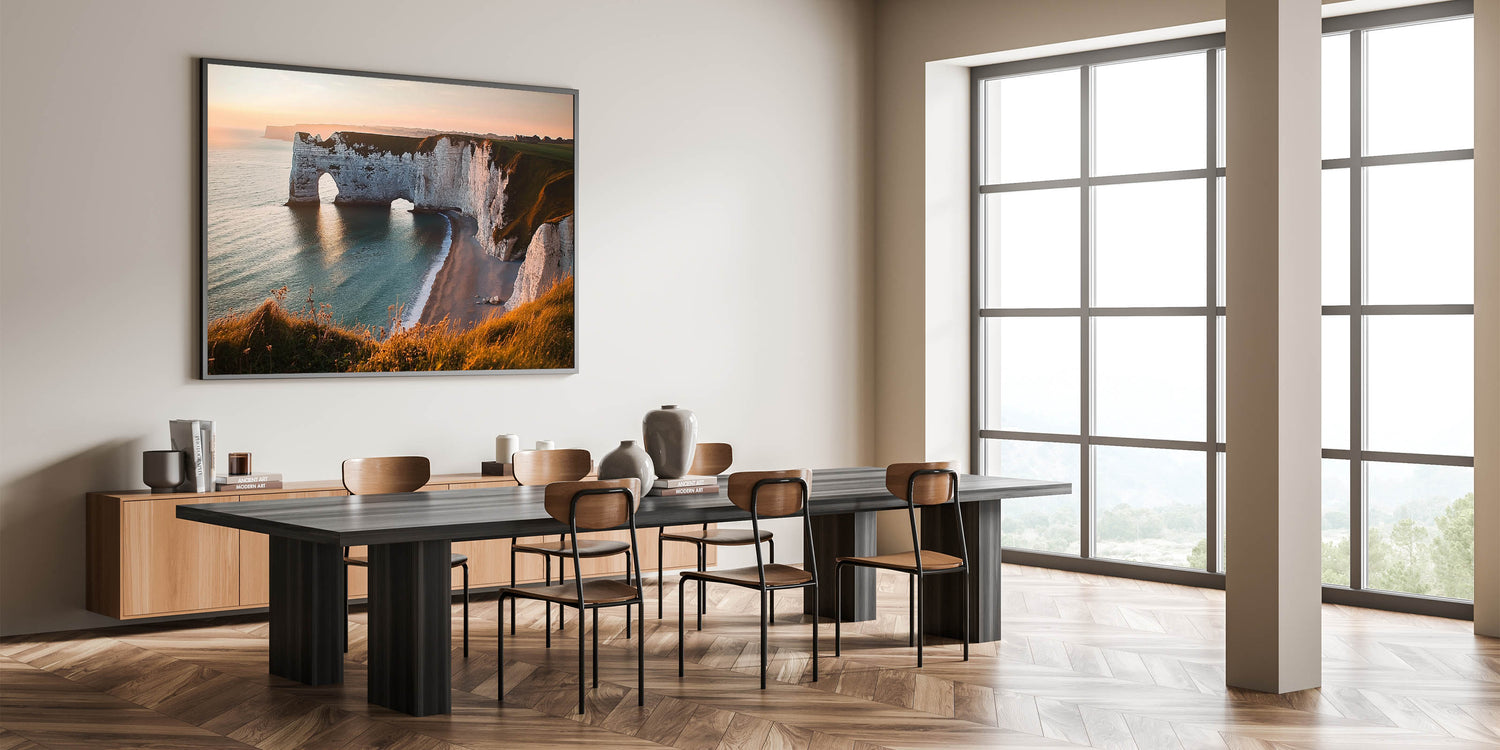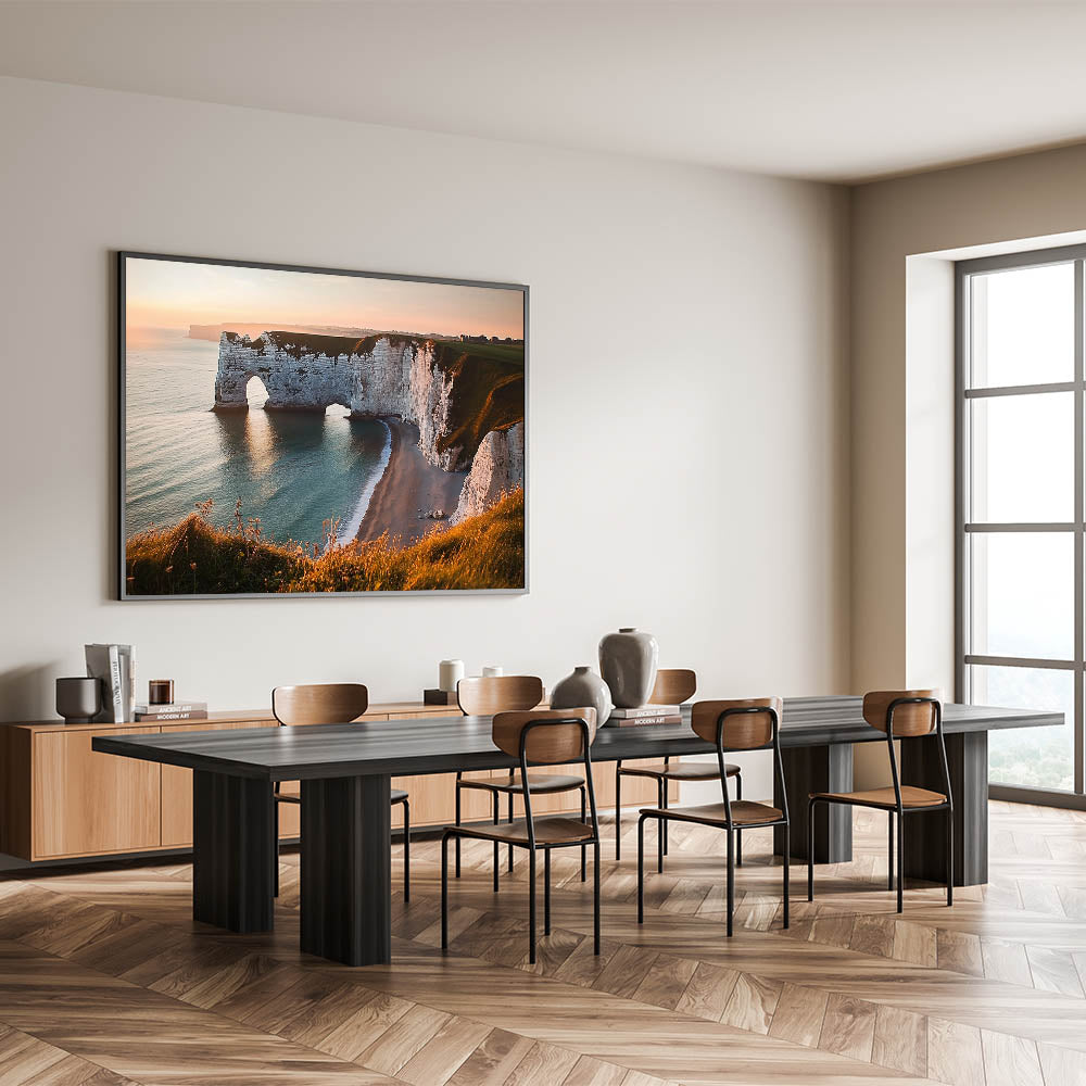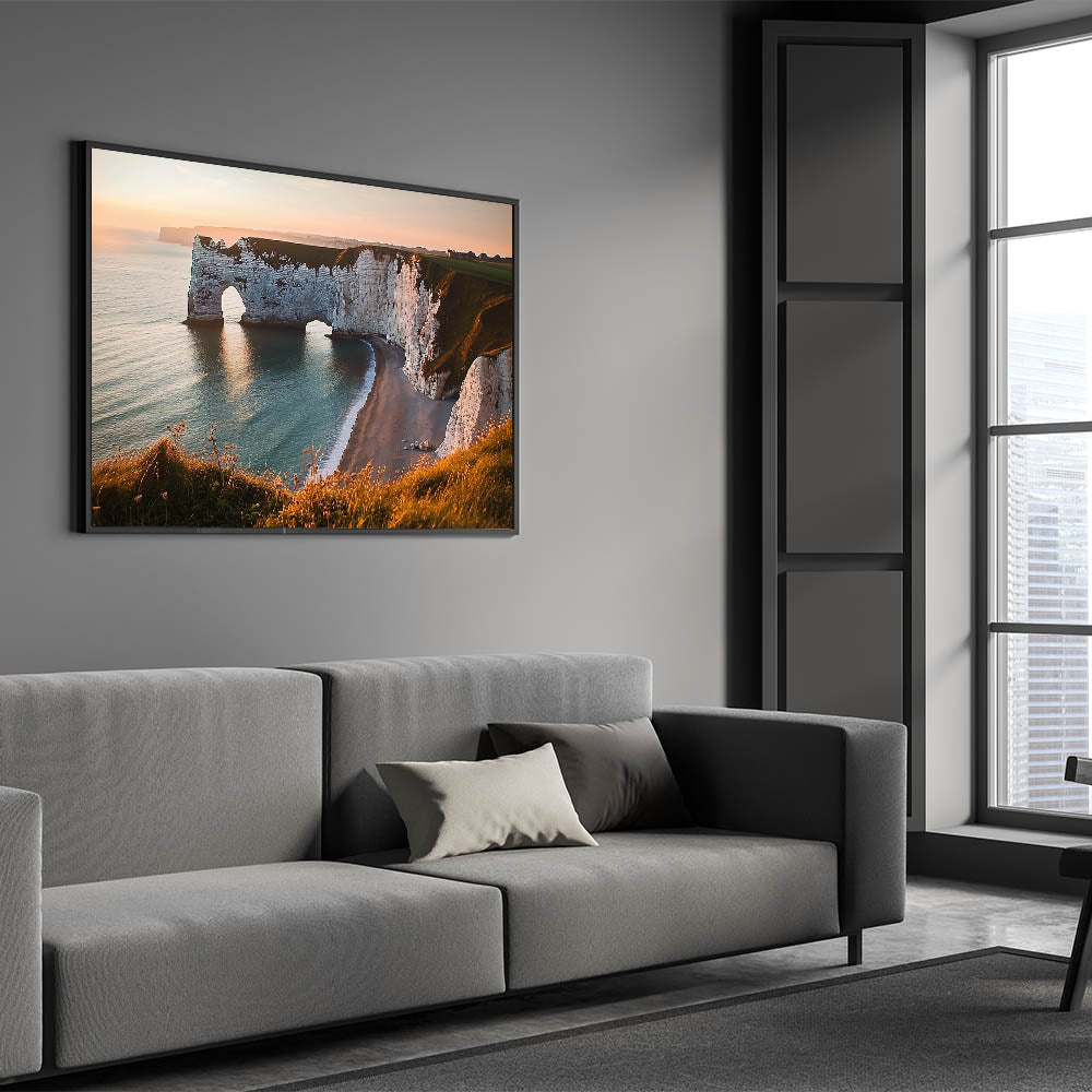 Embrace the serenity of coastal landscapes with this Cliffs Canvas Art, featuring majestic white arches and a tranquil beach bathed in golden sunset hues. The soft interplay of light and shadow highlights the beauty of the cliffs, the calm waters, and the warm tones of the setting sun. This artwork is perfect for adding sophistication and a sense of peace to your living room, bedroom, or office.