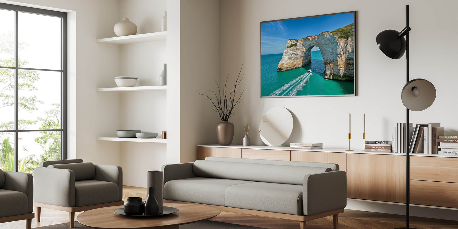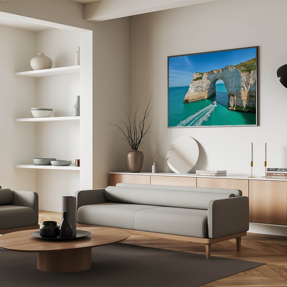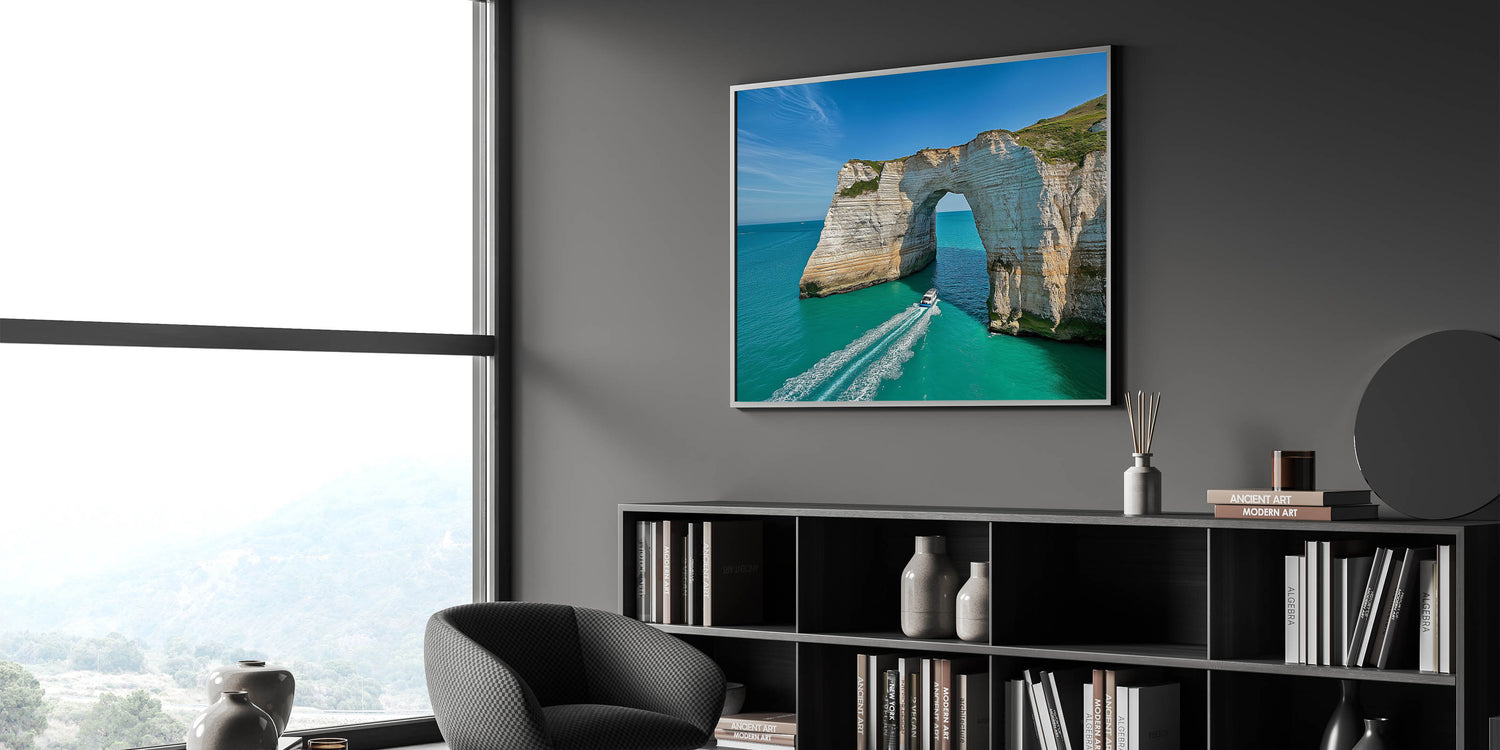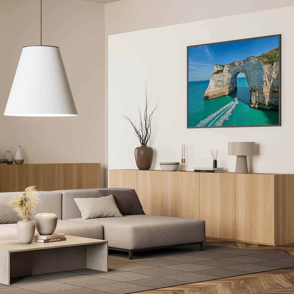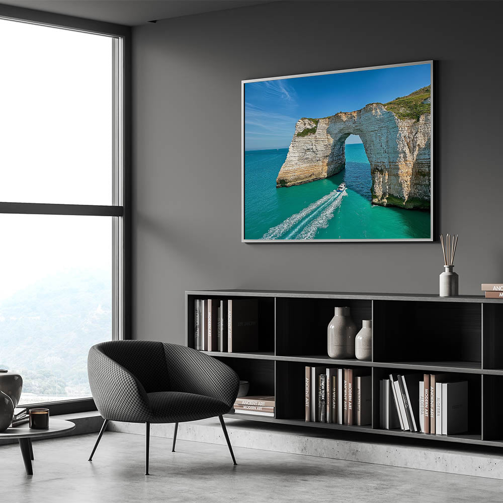 Experience the beauty of coastal landscapes with this Cliffs Canvas Art, featuring a stunning natural stone arch rising from vivid turquoise waters. The vibrant scene captures the serenity of the sea, the majesty of rugged cliffs, and the elegance of a boat gliding through the archway. This artwork is a perfect statement piece for bringing the calming essence of nature into your home.