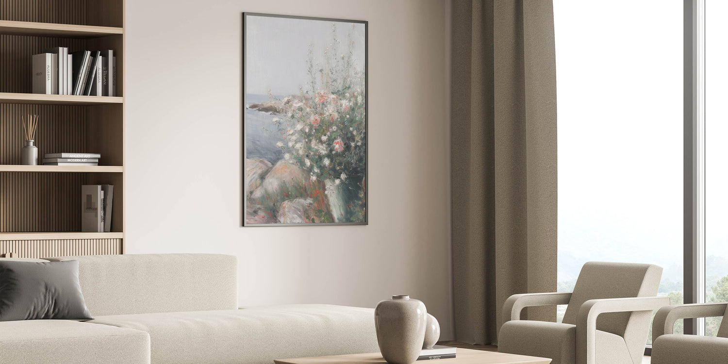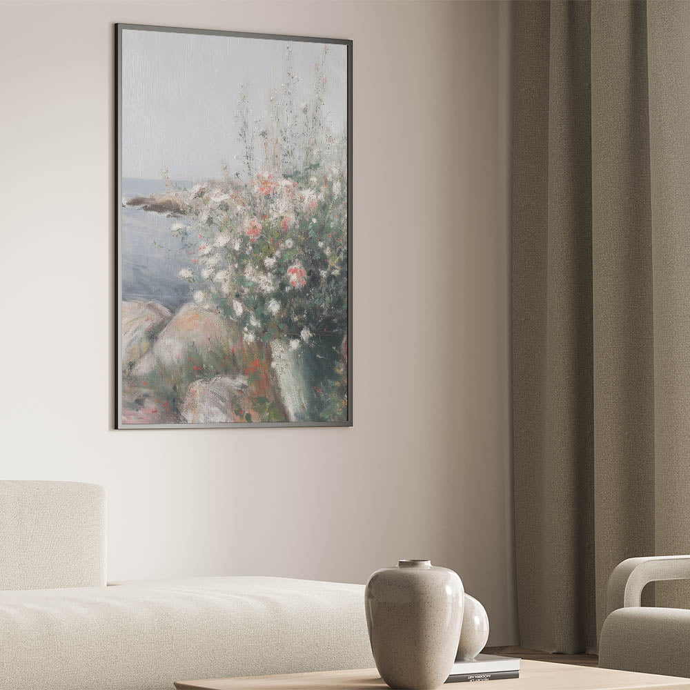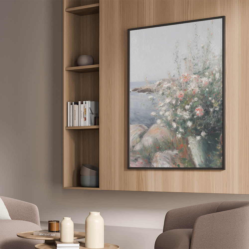 Immerse yourself in the beauty of nature with this Coastal Wildflowers Art, a serene depiction of delicate wildflowers blooming by the seaside. Featuring soft white, blush, and green tones, this artwork captures the peaceful essence of coastal landscapes. Perfect for creating a calming atmosphere, this piece is an excellent addition to any home or office decor.