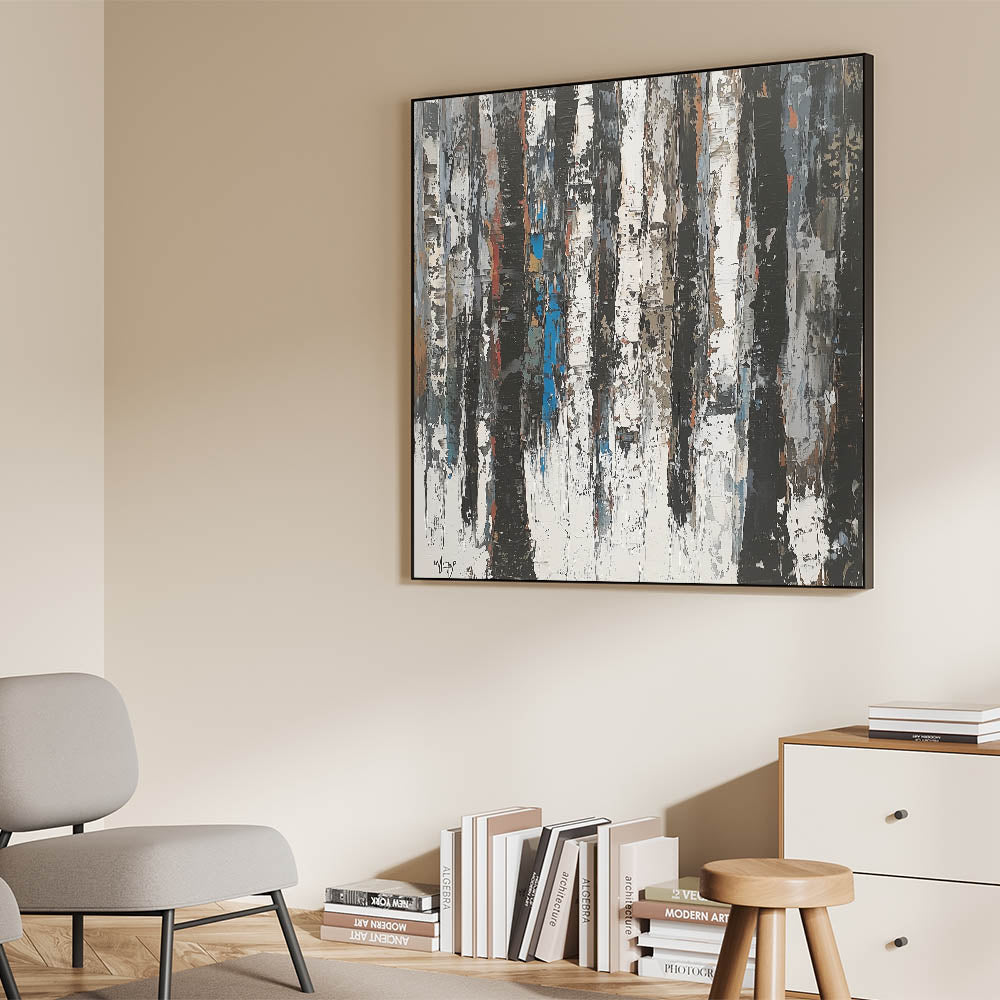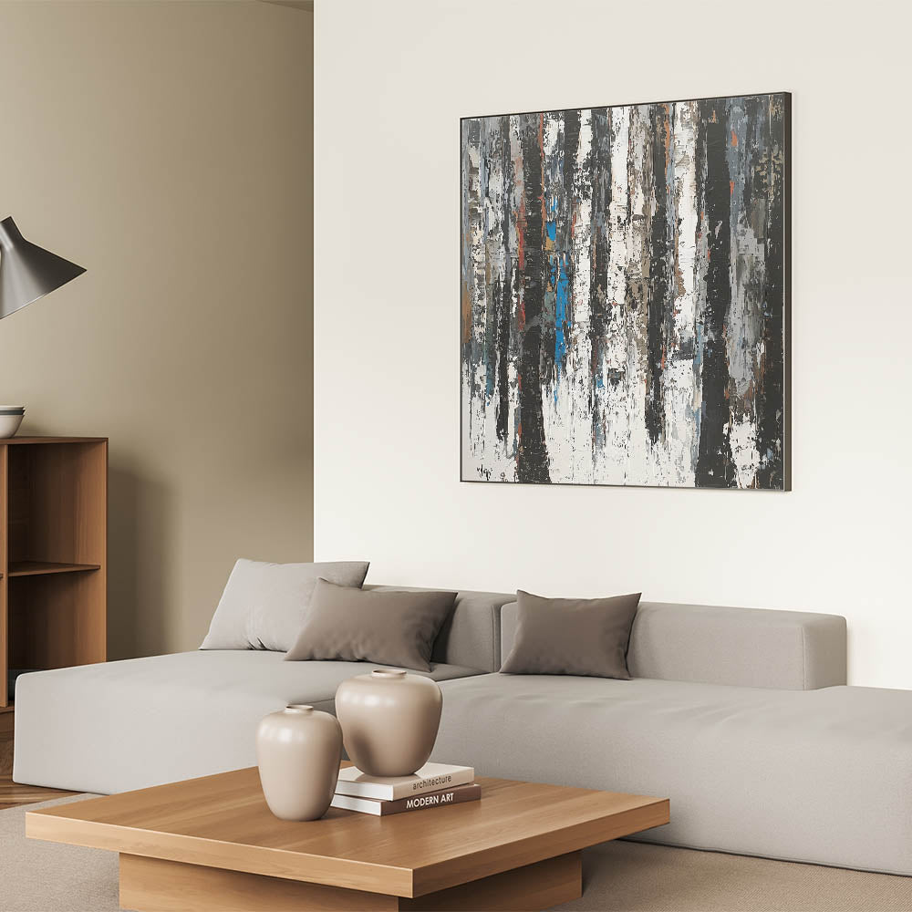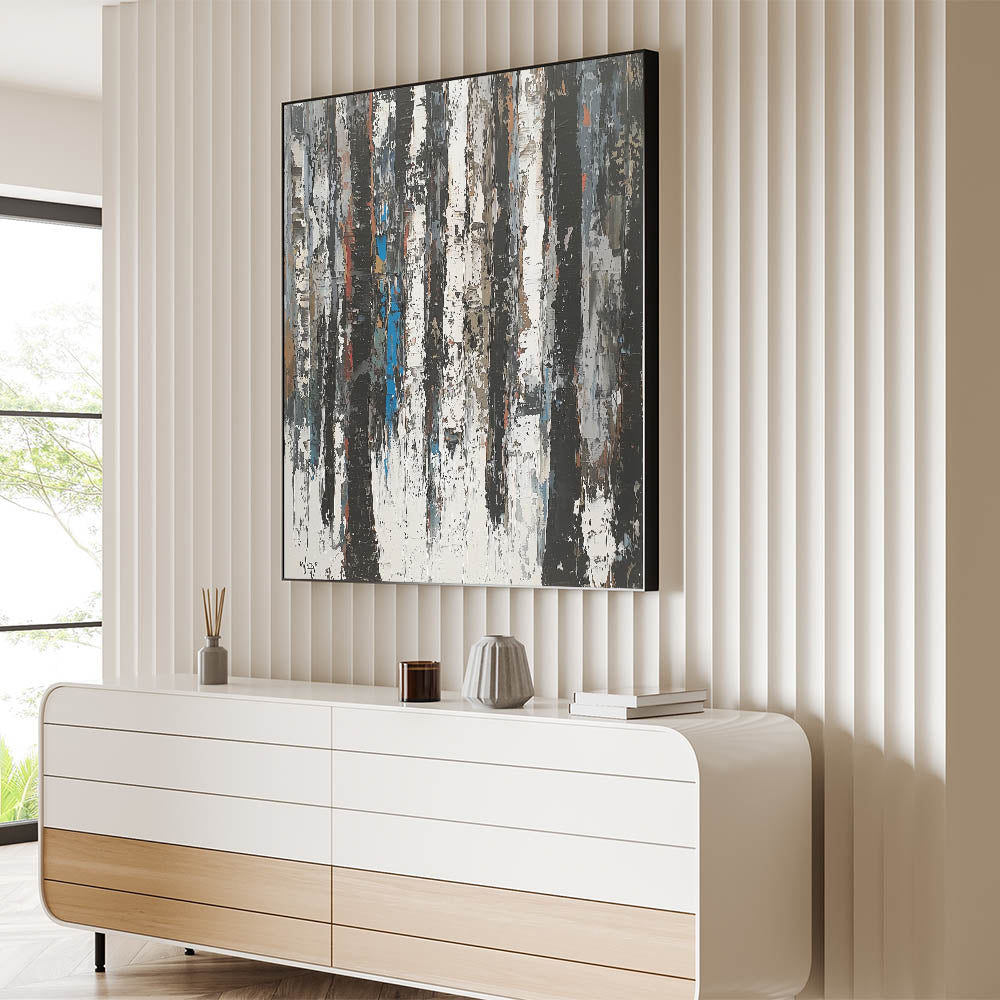 Elevate your home with this Contemporary Abstract Canvas Art, a striking piece that embodies modern minimalism and nature-inspired design. The artwork features vertical, textured strokes in black, white, and gray, reminiscent of abstract tree trunks. Subtle hints of earthy browns and muted blue tones add depth and dimension, creating a harmonious balance of simplicity and sophistication.