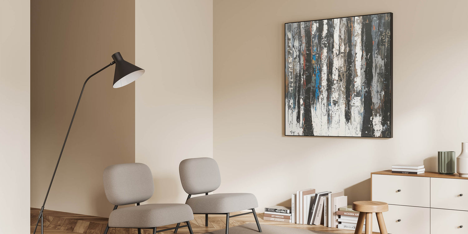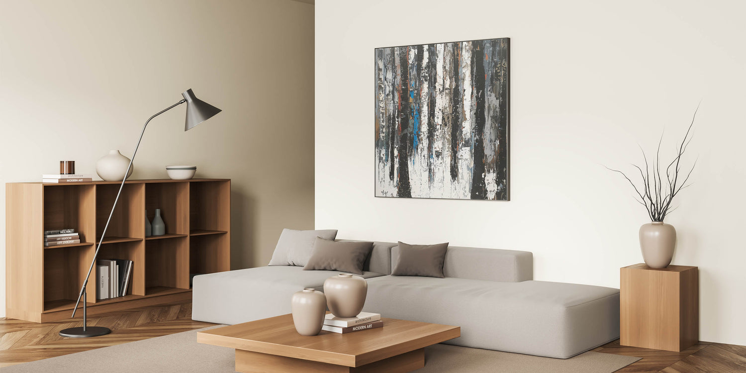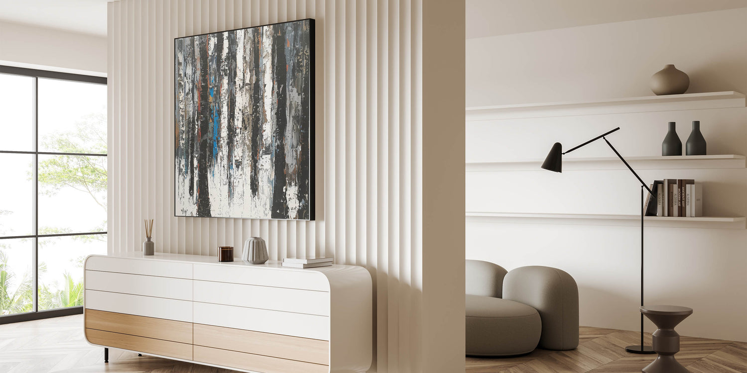 Elevate your home with this Contemporary Abstract Canvas Art, a striking piece that embodies modern minimalism and nature-inspired design. The artwork features vertical, textured strokes in black, white, and gray, reminiscent of abstract tree trunks. Subtle hints of earthy browns and muted blue tones add depth and dimension, creating a harmonious balance of simplicity and sophistication.