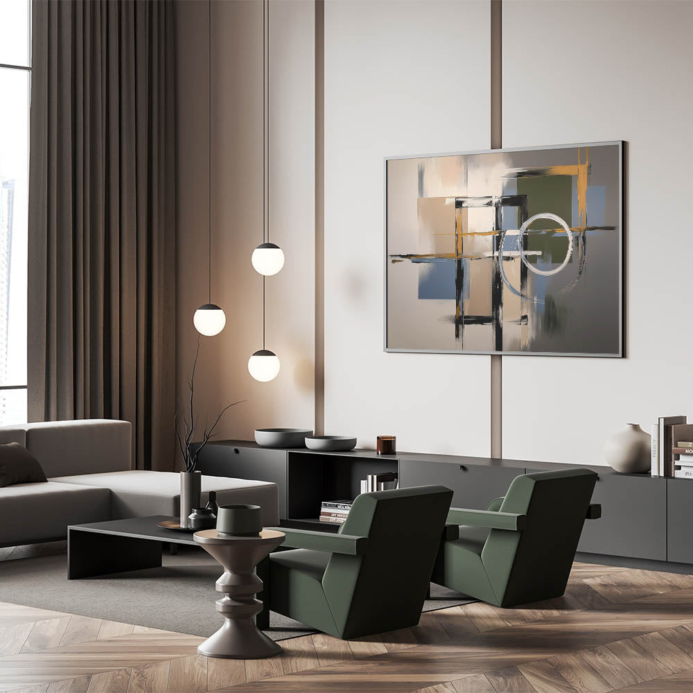 Introduce elegance to your space with this Contemporary Abstract Canvas, featuring dynamic geometric patterns in neutral tones. The artwork’s composition incorporates intersecting lines, rectangular forms, and circular elements, creating a balanced yet striking visual. The refined palette of beige, black, olive green, and soft blue adds warmth and sophistication, making it ideal for modern home decor.