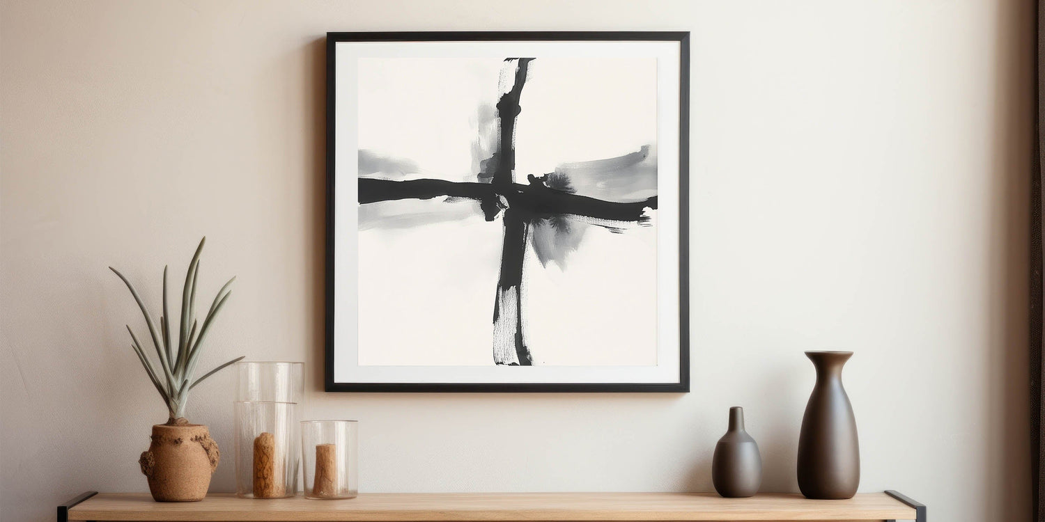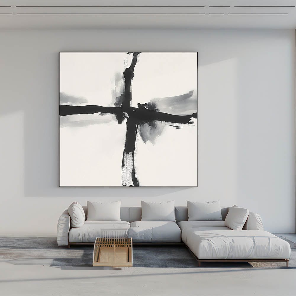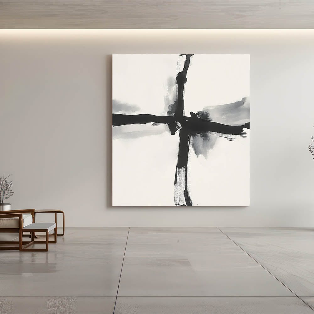 Elevate your interior with this contemporary abstract canvas that merges bold structure with subtle tonal contrast. Featuring a sharp black cross layered over gentle gray washes on a white background, this artwork embodies strength and serenity in equal measure.