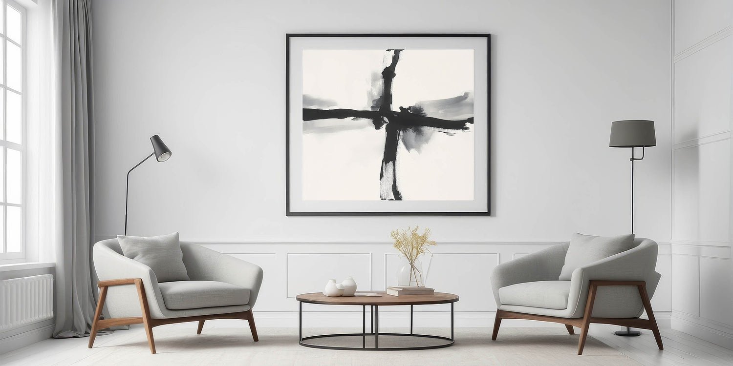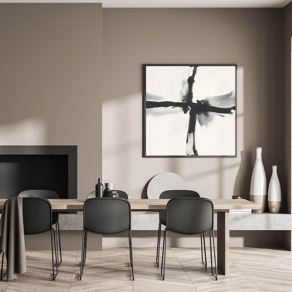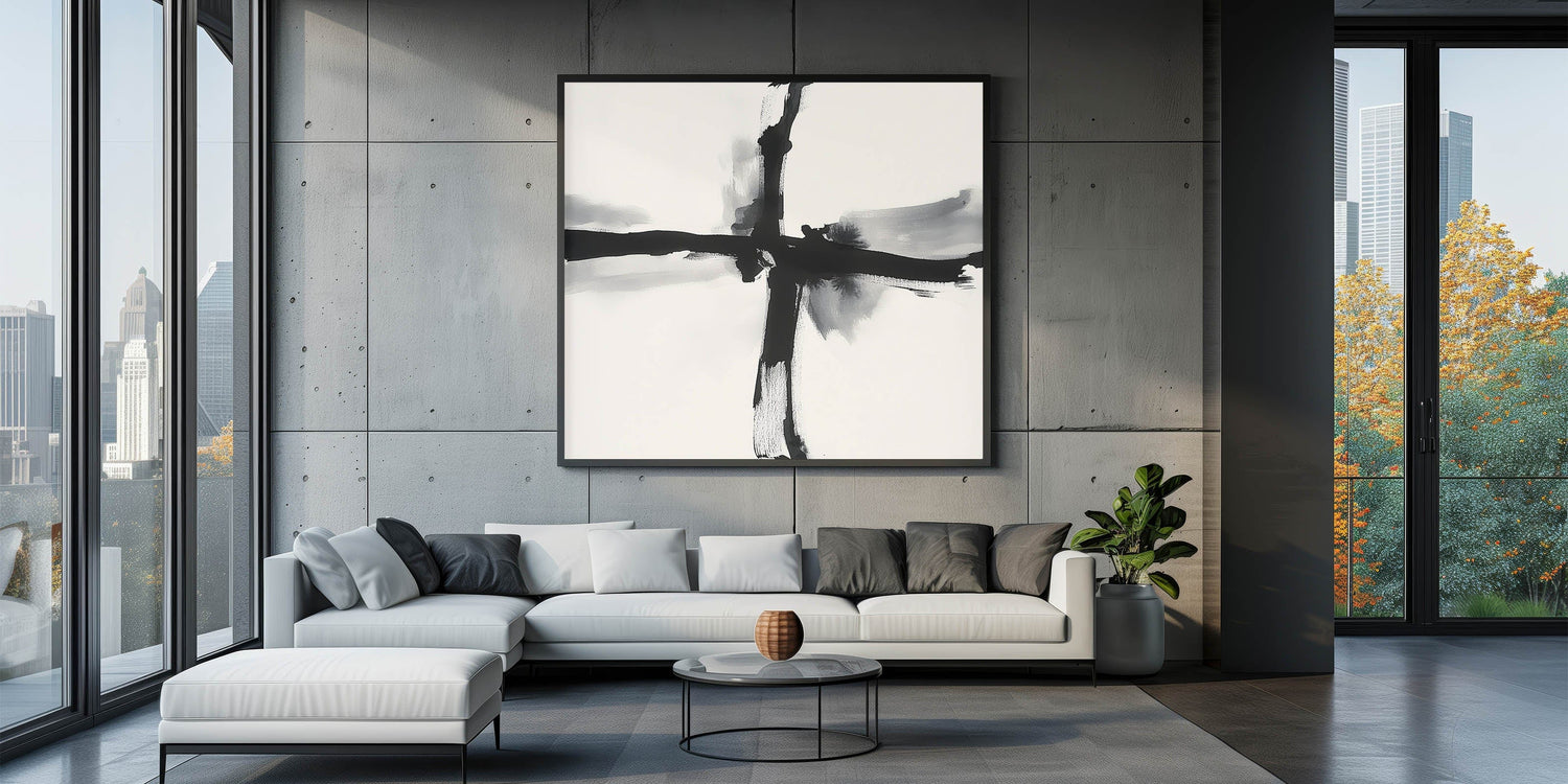 Elevate your interior with this contemporary abstract canvas that merges bold structure with subtle tonal contrast. Featuring a sharp black cross layered over gentle gray washes on a white background, this artwork embodies strength and serenity in equal measure.