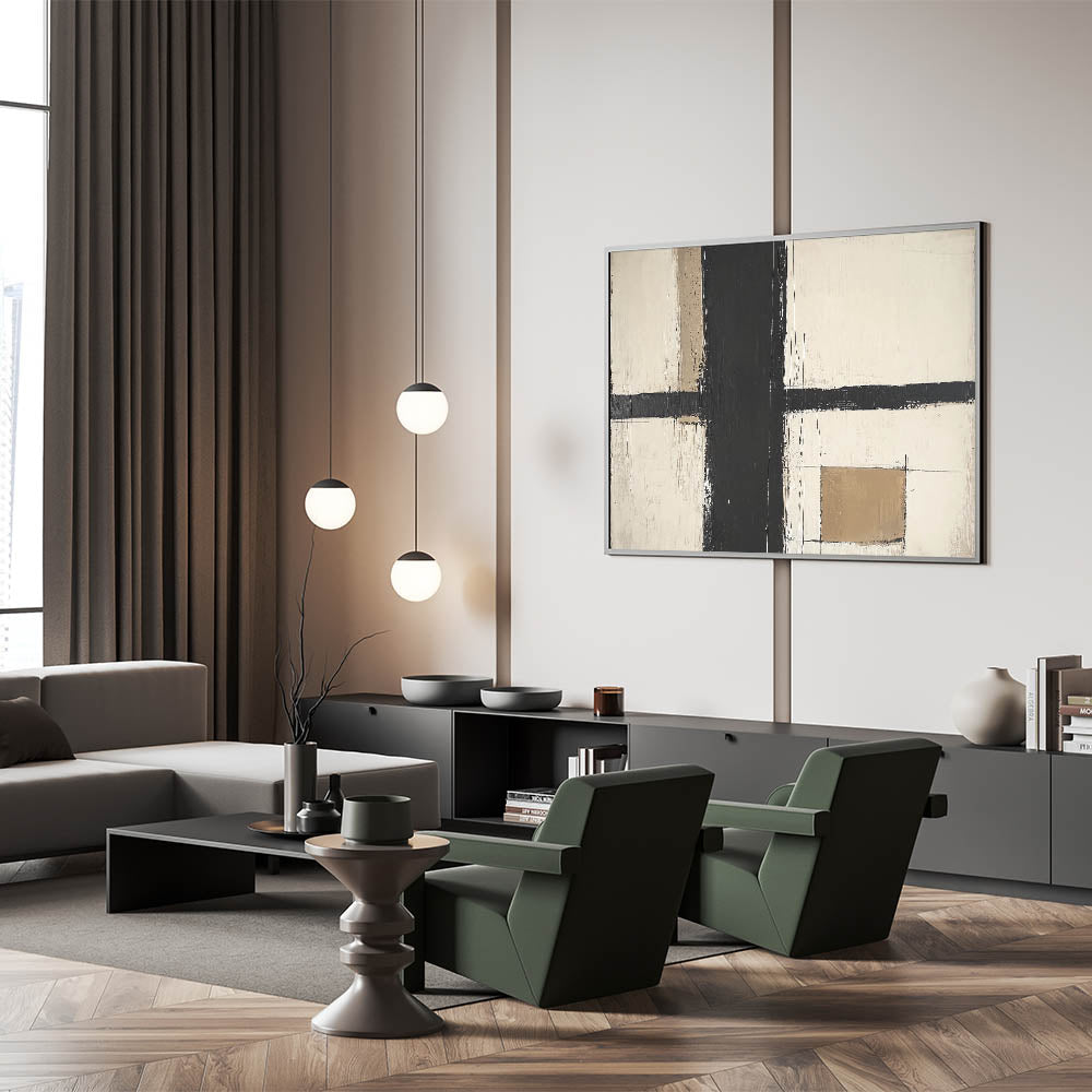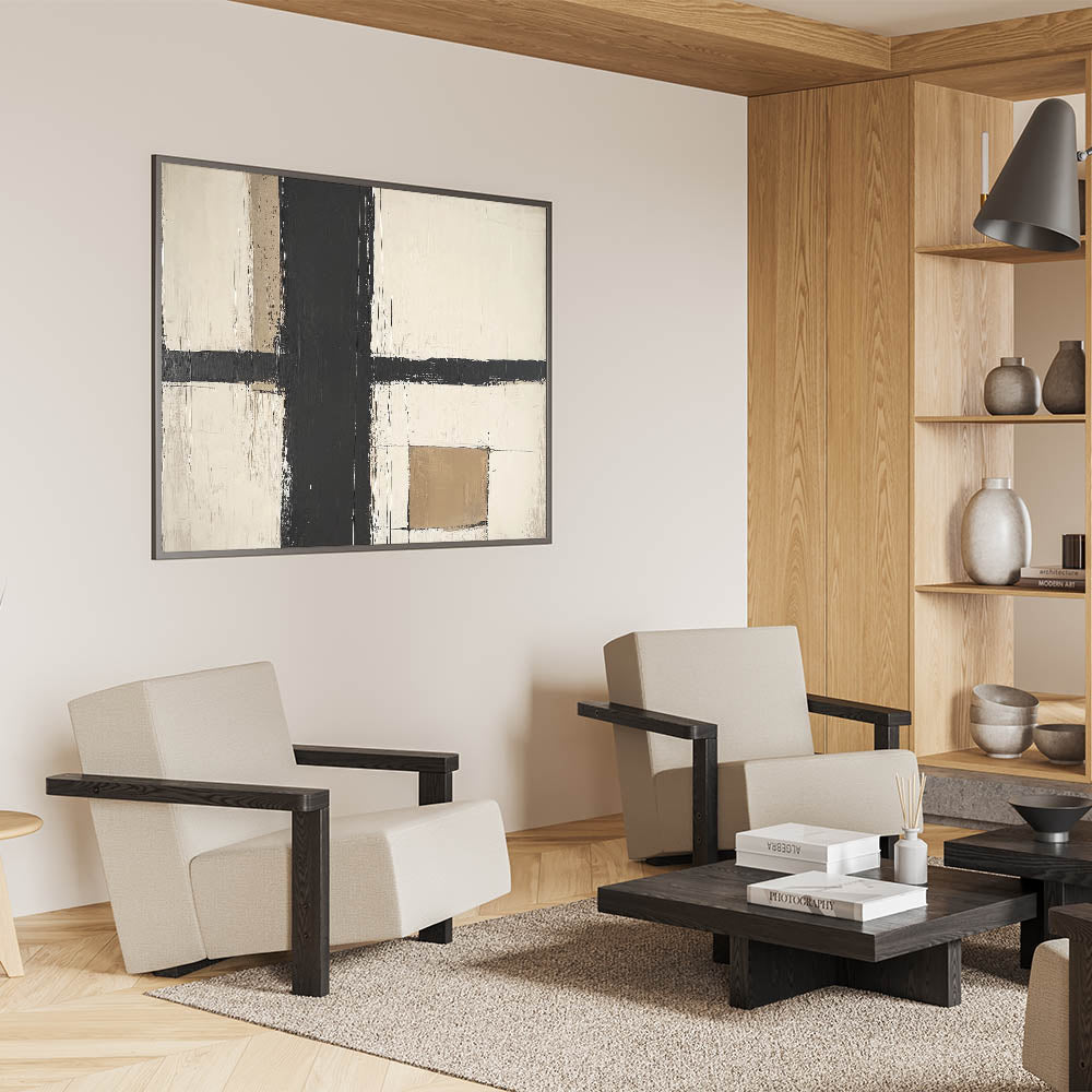 This geometric abstract painting effortlessly blends boldness with simplicity, making it perfect for those who appreciate modern and minimalist art. Its neutral tones and clean composition create a stylish focal point, perfect for transforming your walls.