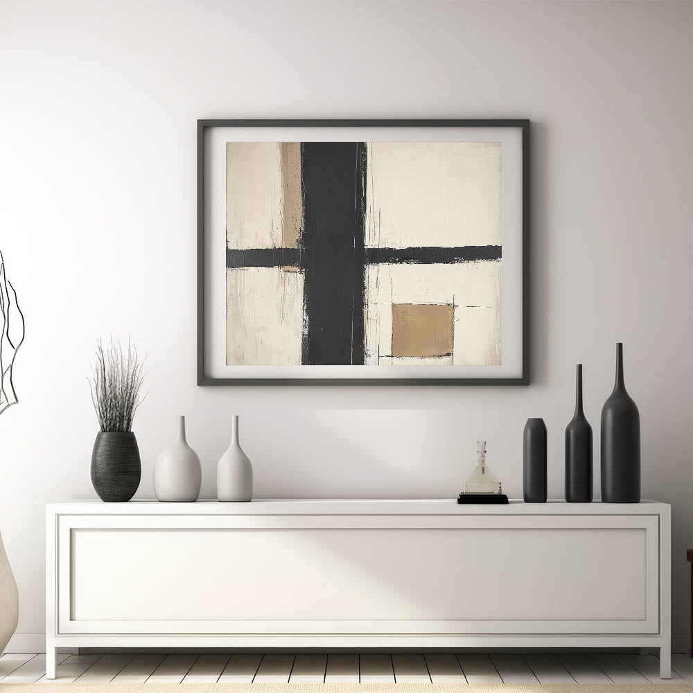 Transform your space with this Contemporary Abstract Canvas, a bold and modern design featuring clean black lines and warm beige accents. This minimalist piece uses a neutral palette of black, beige, and white to create a harmonious and timeless look. Its structured yet organic geometric patterns make it a versatile addition to modern home decor.