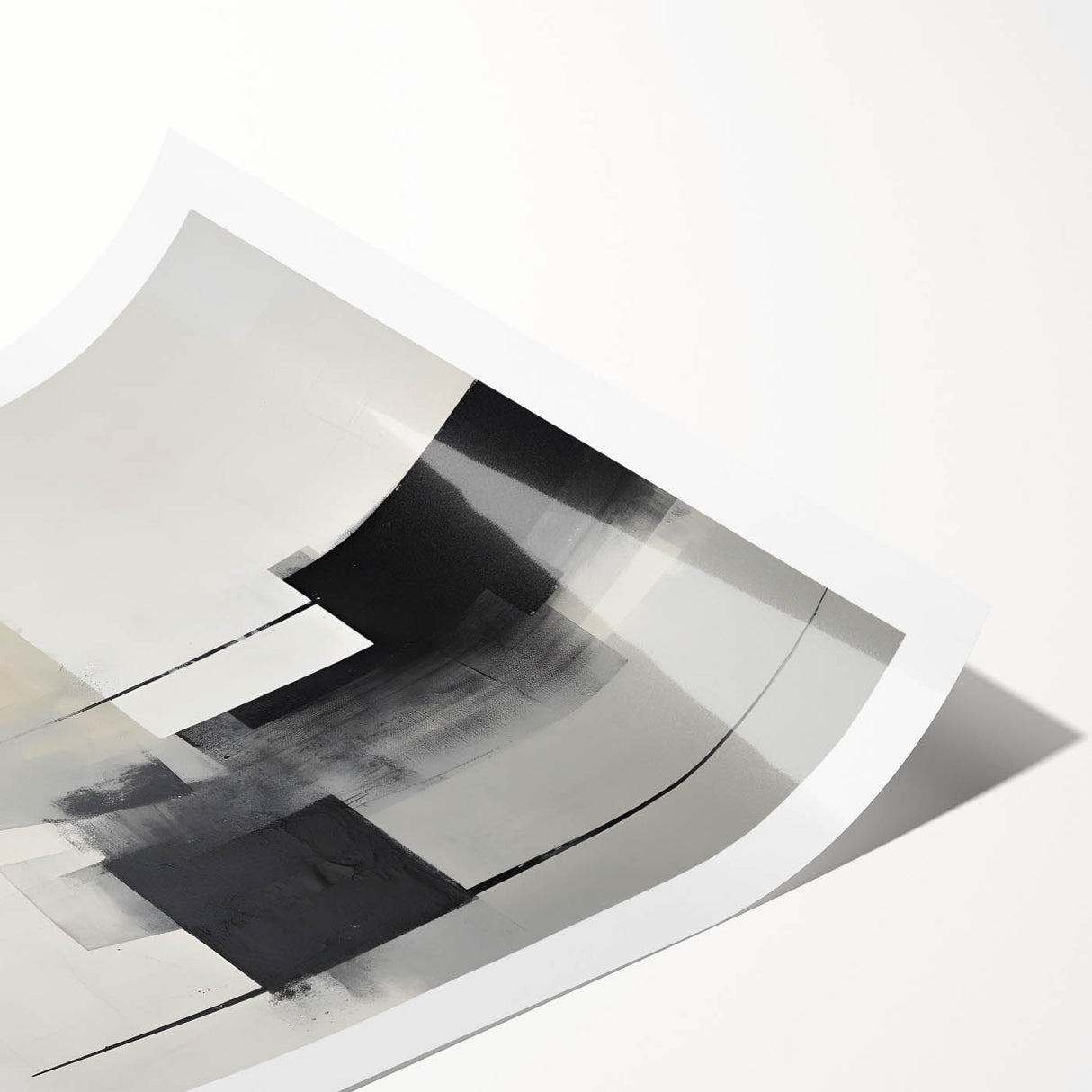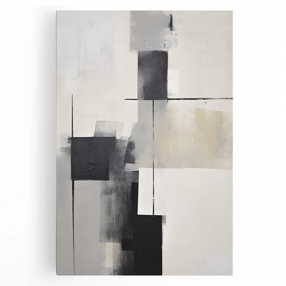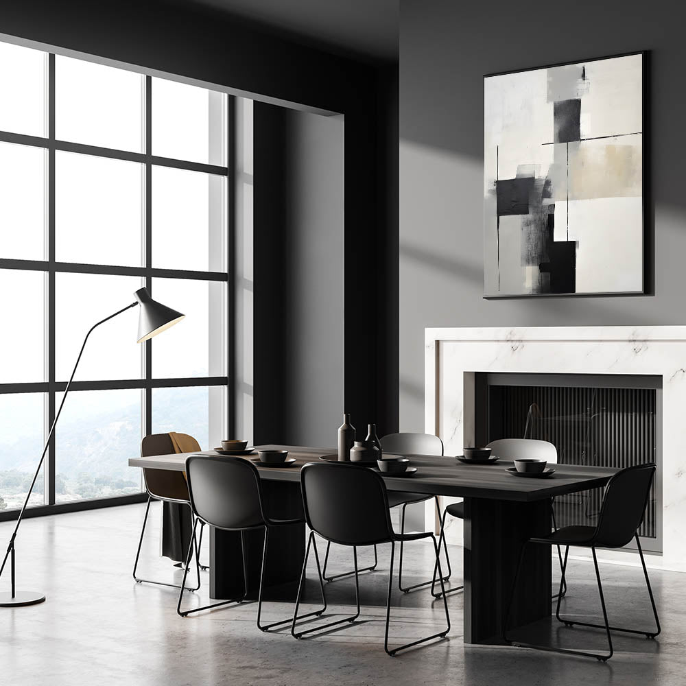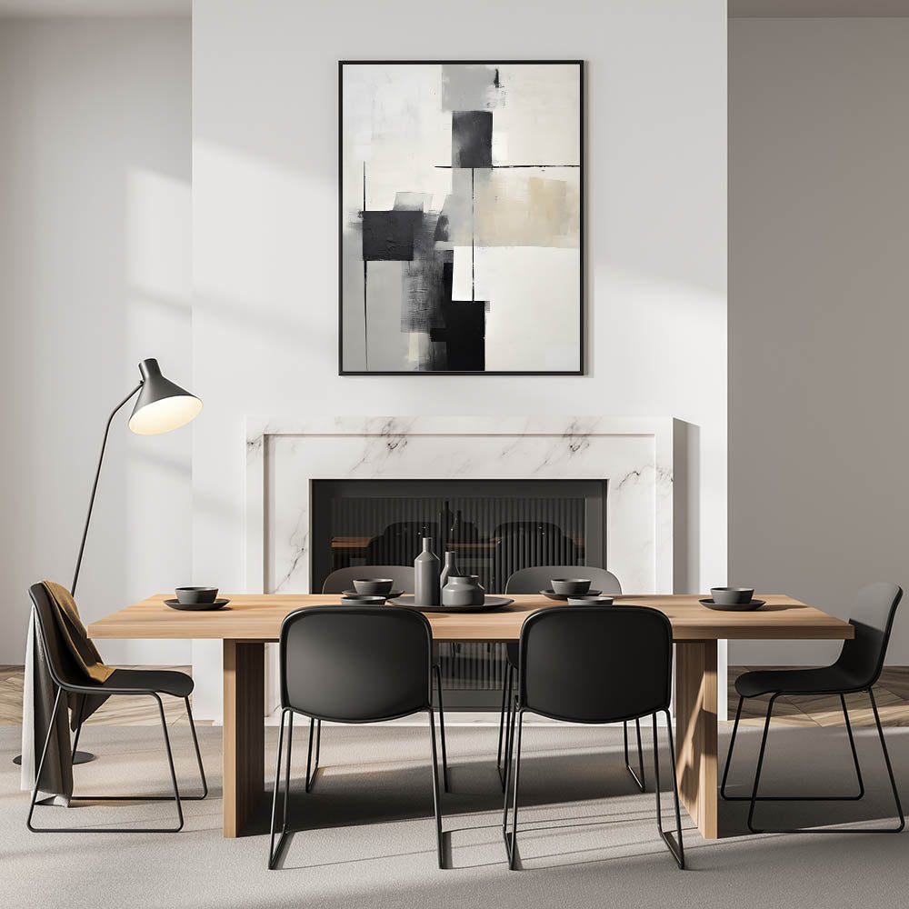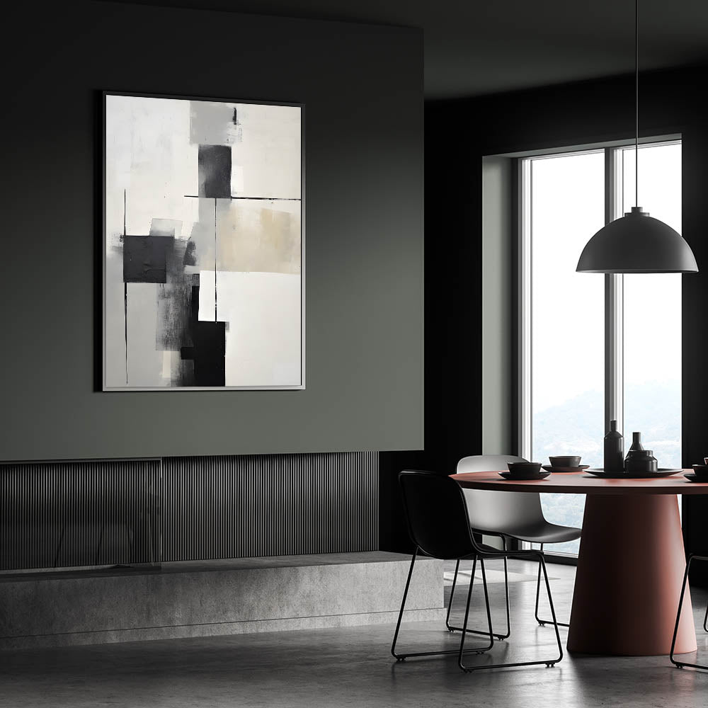 Enhance your dining space with this contemporary art for dining room walls, featuring a bold black, gray, and white geometric abstract design. The interplay of structured lines and fluid brushstrokes creates a dynamic yet minimalist aesthetic, making it a versatile addition to modern interiors. Its neutral tones and balanced composition blend seamlessly with industrial, minimalist, and contemporary décor styles.
