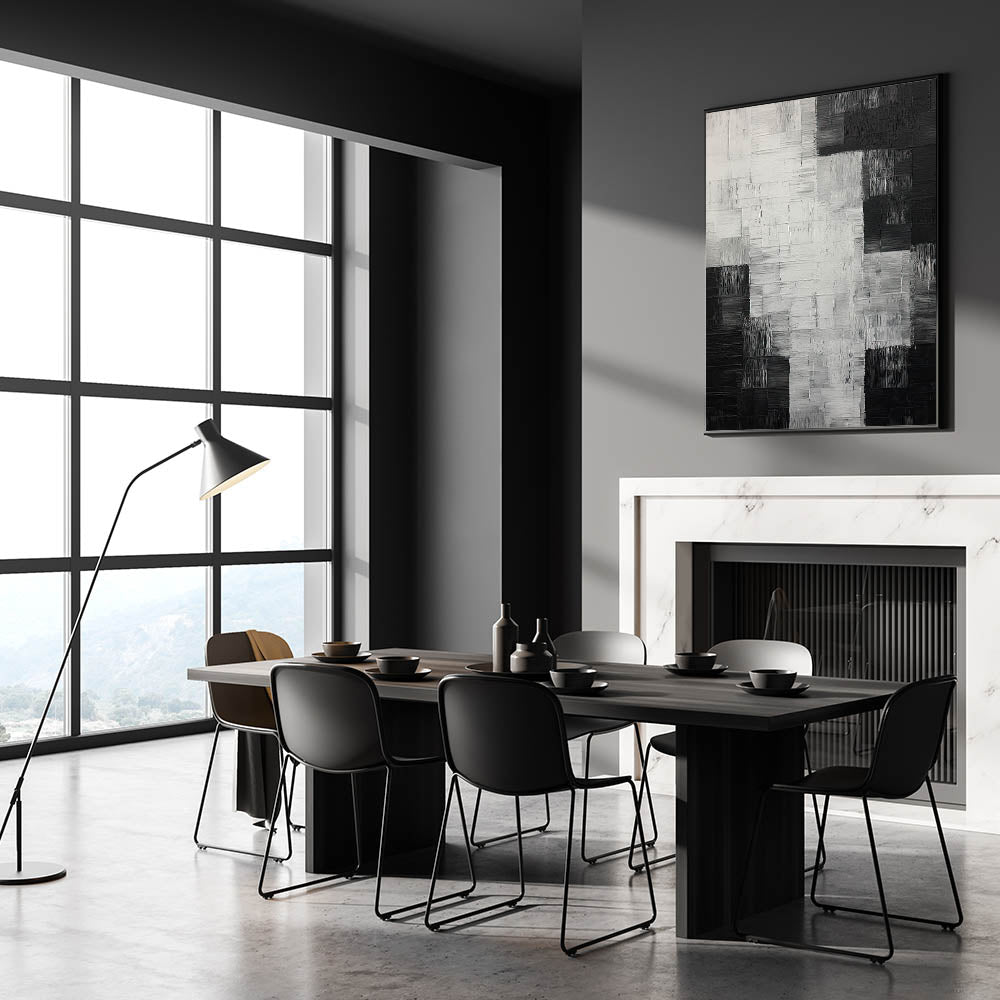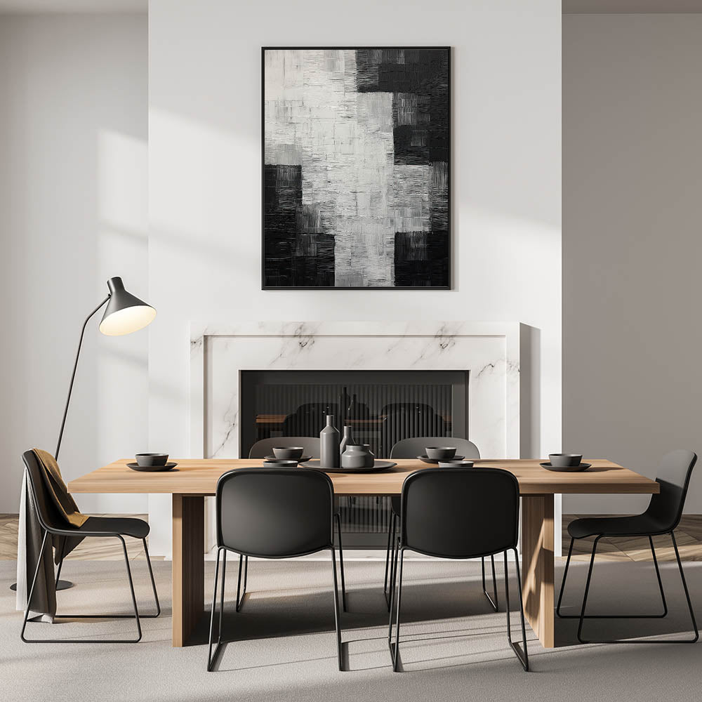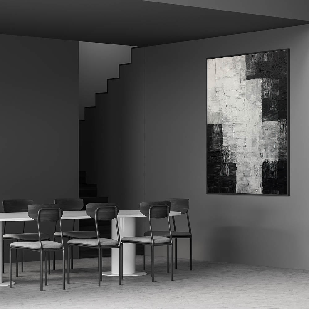Enhance your dining area with contemporary art for dining room walls, featuring a striking black, white, and gray abstract textured design. This elegant dining room wall art adds depth and sophistication, making it a perfect centerpiece for modern interiors.