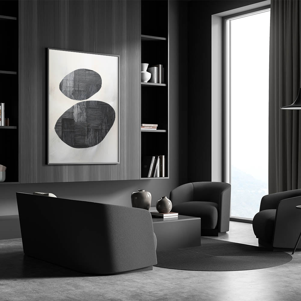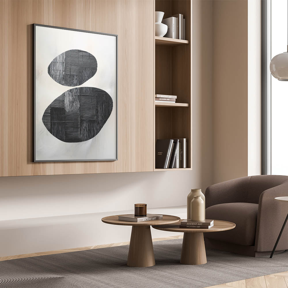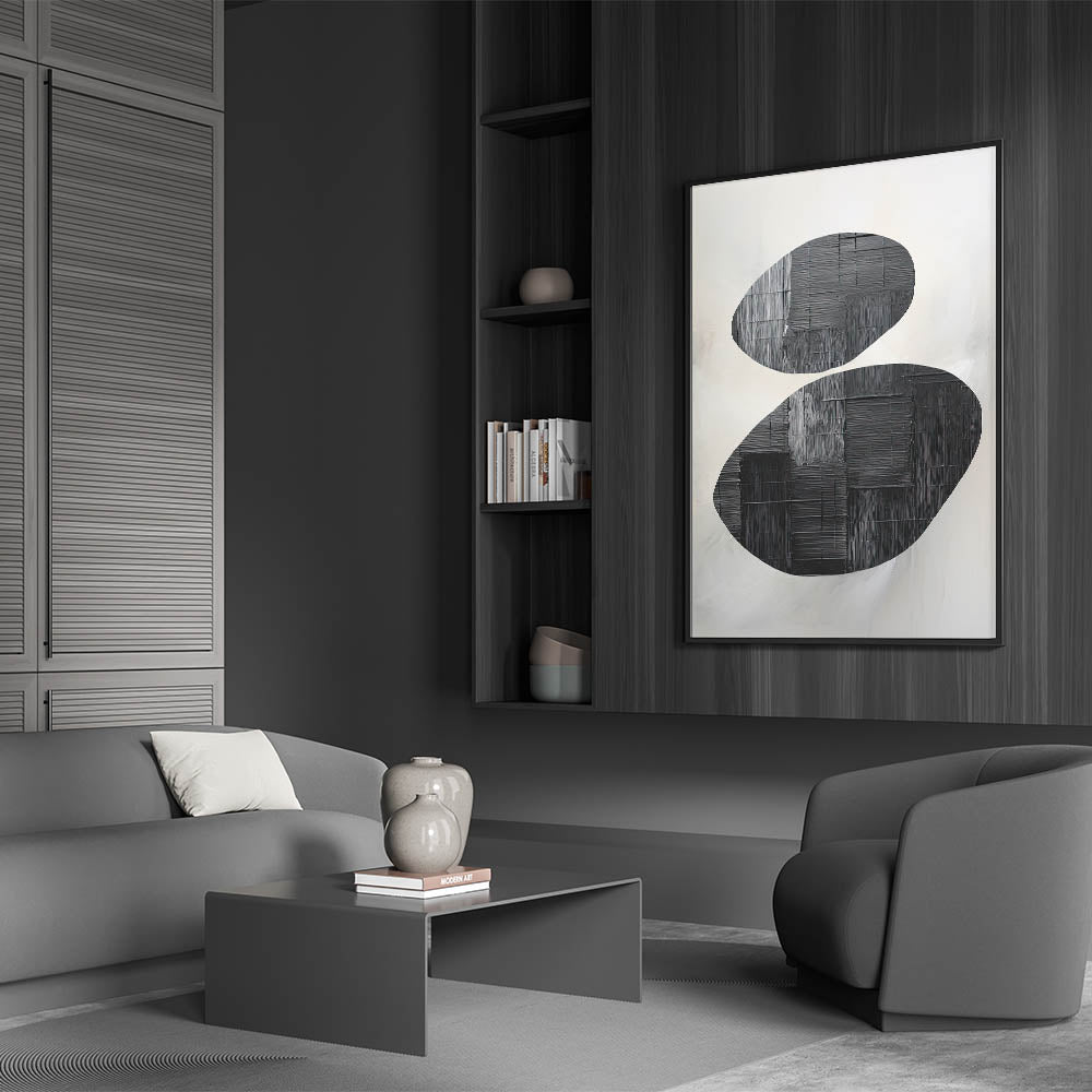 This captivating piece from the Abstracts in Earthen Harmony collection brings texture and contrast to the forefront. With two hand-textured black organic shapes layered over a misty white and gray background, it blends modern design with an earthy, grounded feel. The structured lines within each shape make this a standout example of contemporary canvas art.