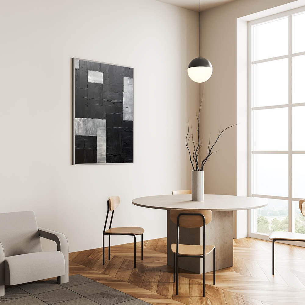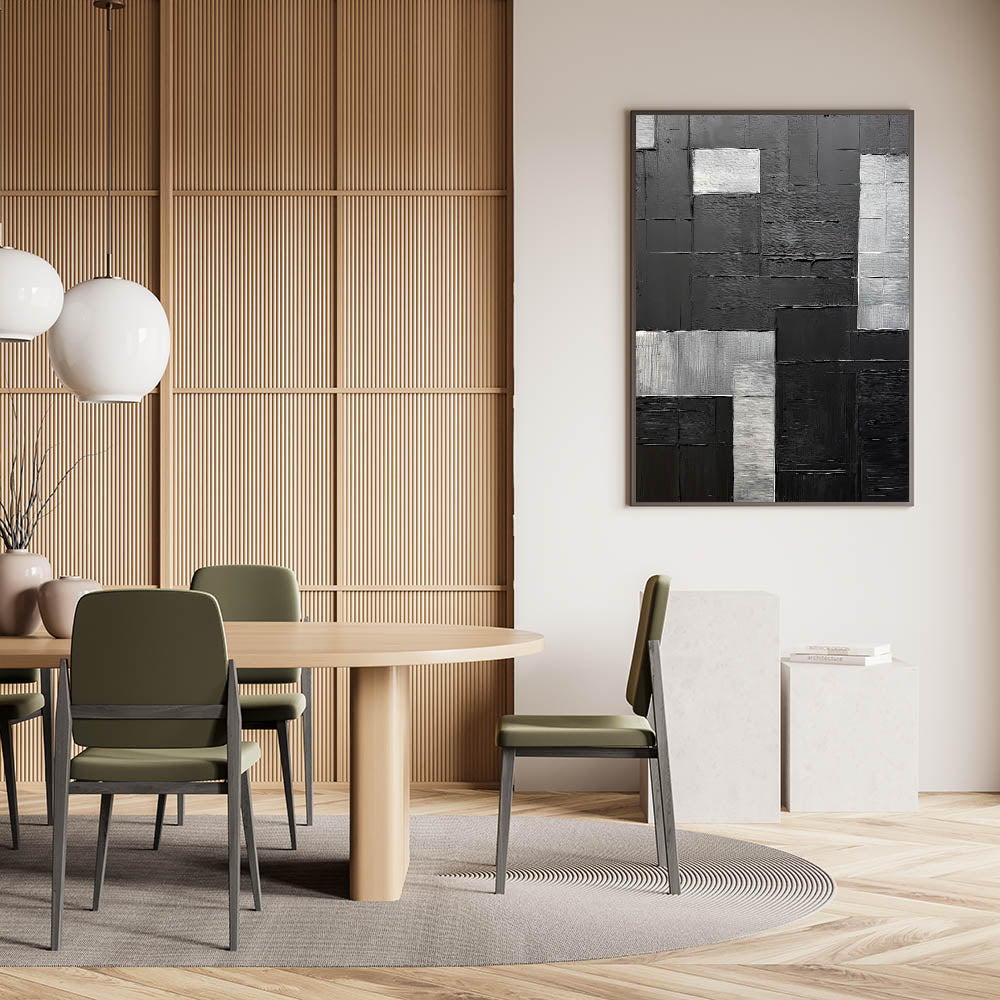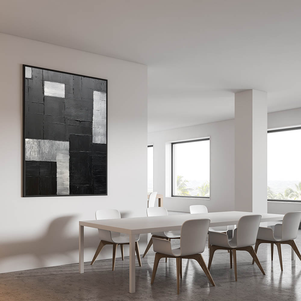 Upgrade your dining space with this contemporary dining art piece, featuring a bold black and silver geometric abstract design. The textured composition and striking contrast create a sophisticated, modern dining room wall decor that adds depth and elegance to your space.