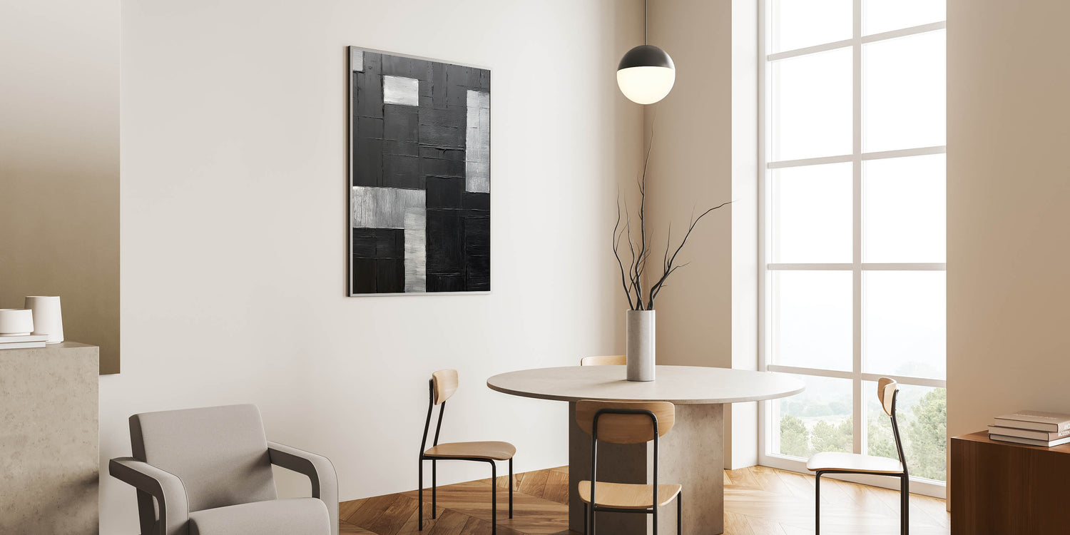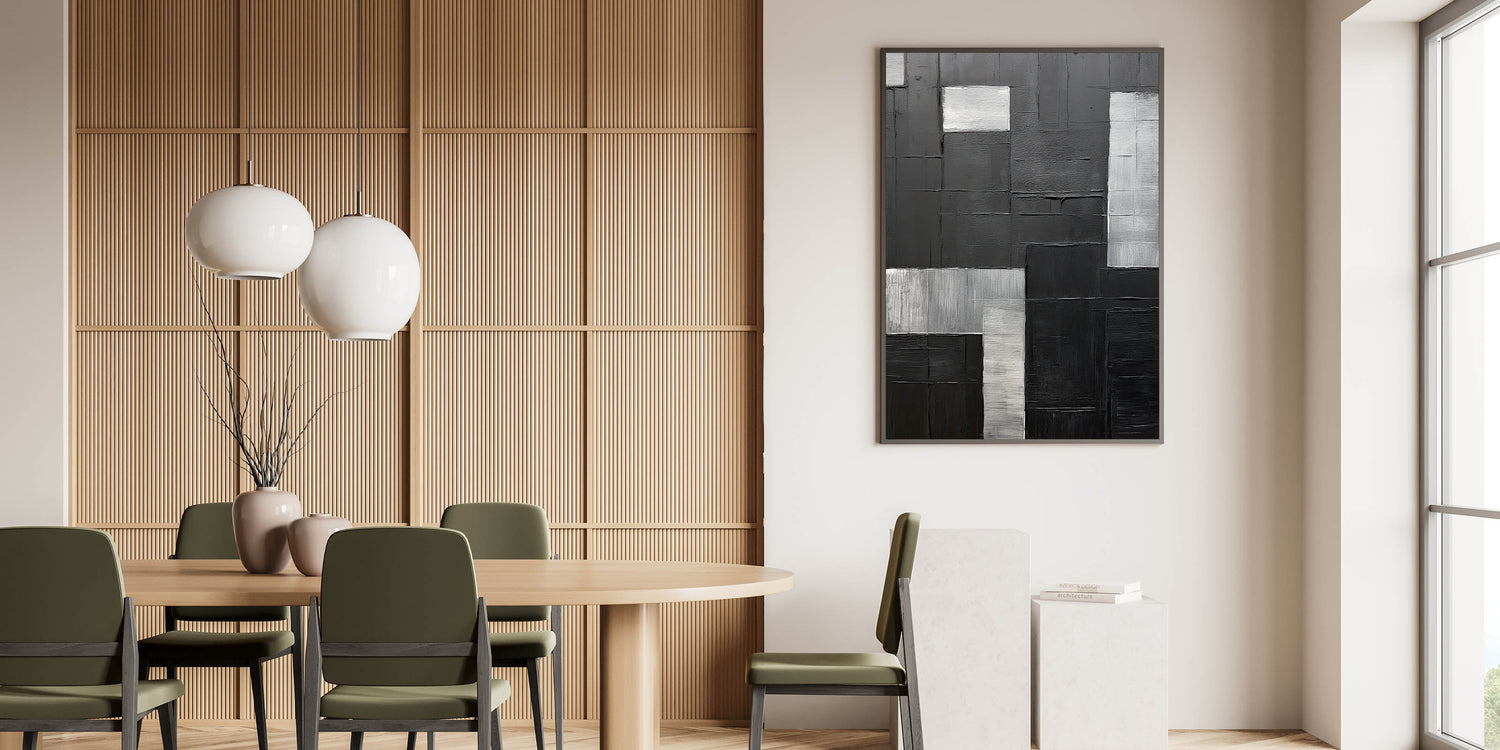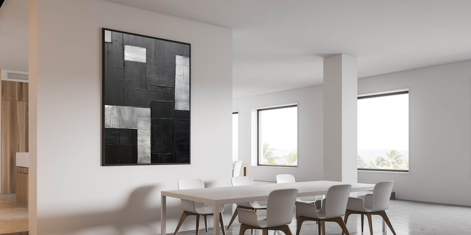 Upgrade your dining space with this contemporary dining art piece, featuring a bold black and silver geometric abstract design. The textured composition and striking contrast create a sophisticated, modern dining room wall decor that adds depth and elegance to your space.