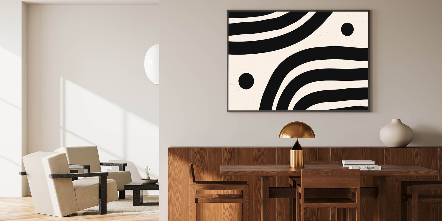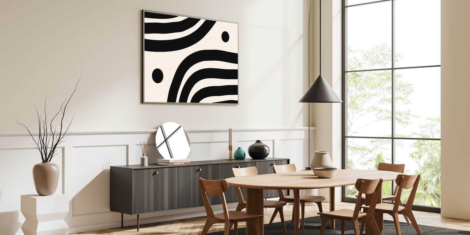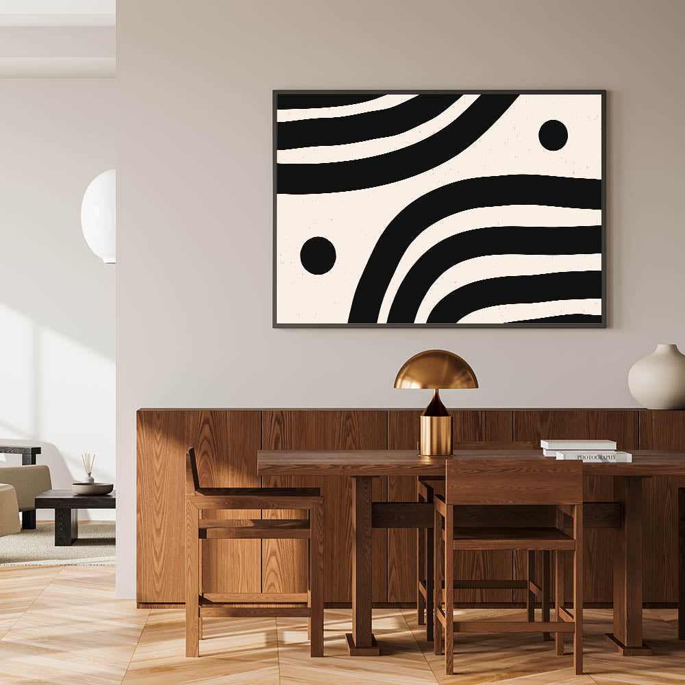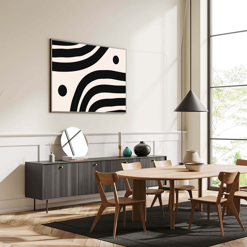 Add a modern touch to your space with contemporary dining art pieces featuring a bold black and white abstract wave design. This striking modern dining room art blends effortlessly with minimalist, industrial, and Scandinavian interiors. Whether displayed as framed dining room prints, acrylic dining room artwork, or canvas art for dining areas, this high-quality piece brings depth and style to your dining space.
